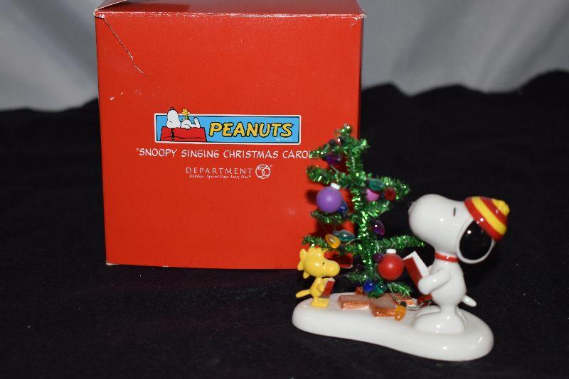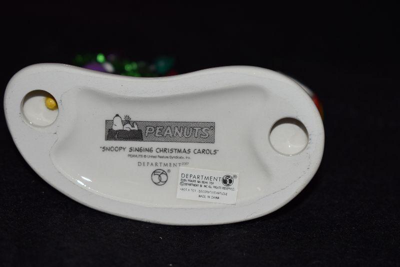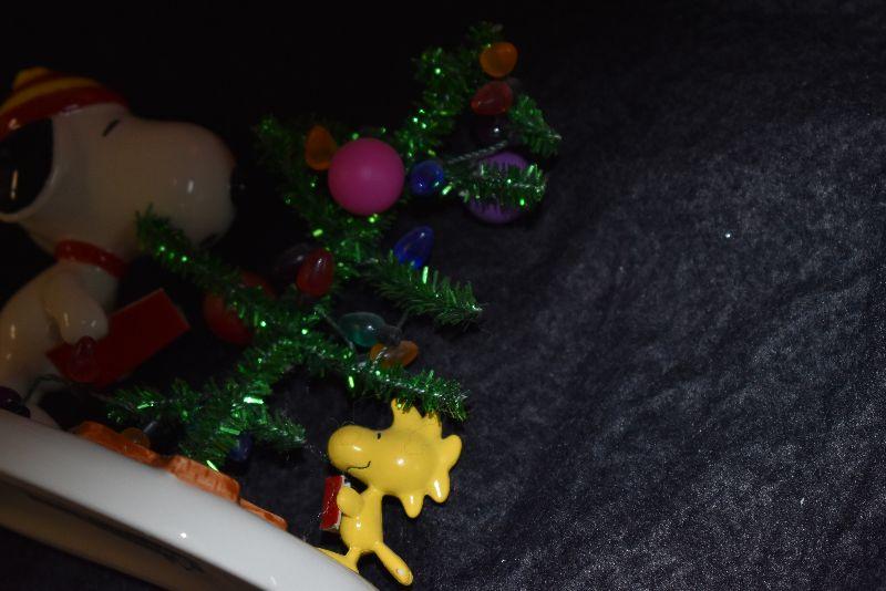 Peanuts Christmas figurine from Dept. 59, Snoopy, tree, and Woodstock. 3.5 inches tall.