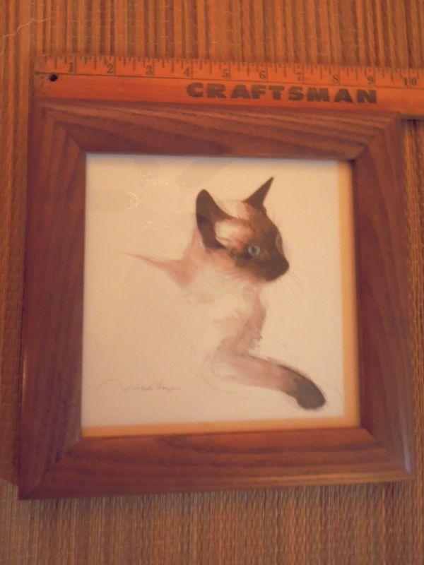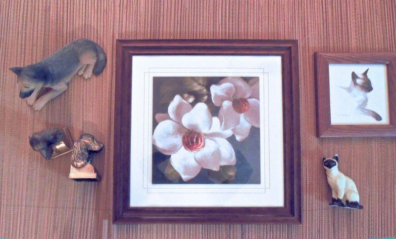 20 x 20 framed print of magnolia blossoms; 9.5 x 9.5 framed silhouette of siamese cat, porcelain siamese cat figurine with chipped ears; 10" German Shepard figurine by Living Stone and a nice pair 5" of bronze cocker spaniel bookends.