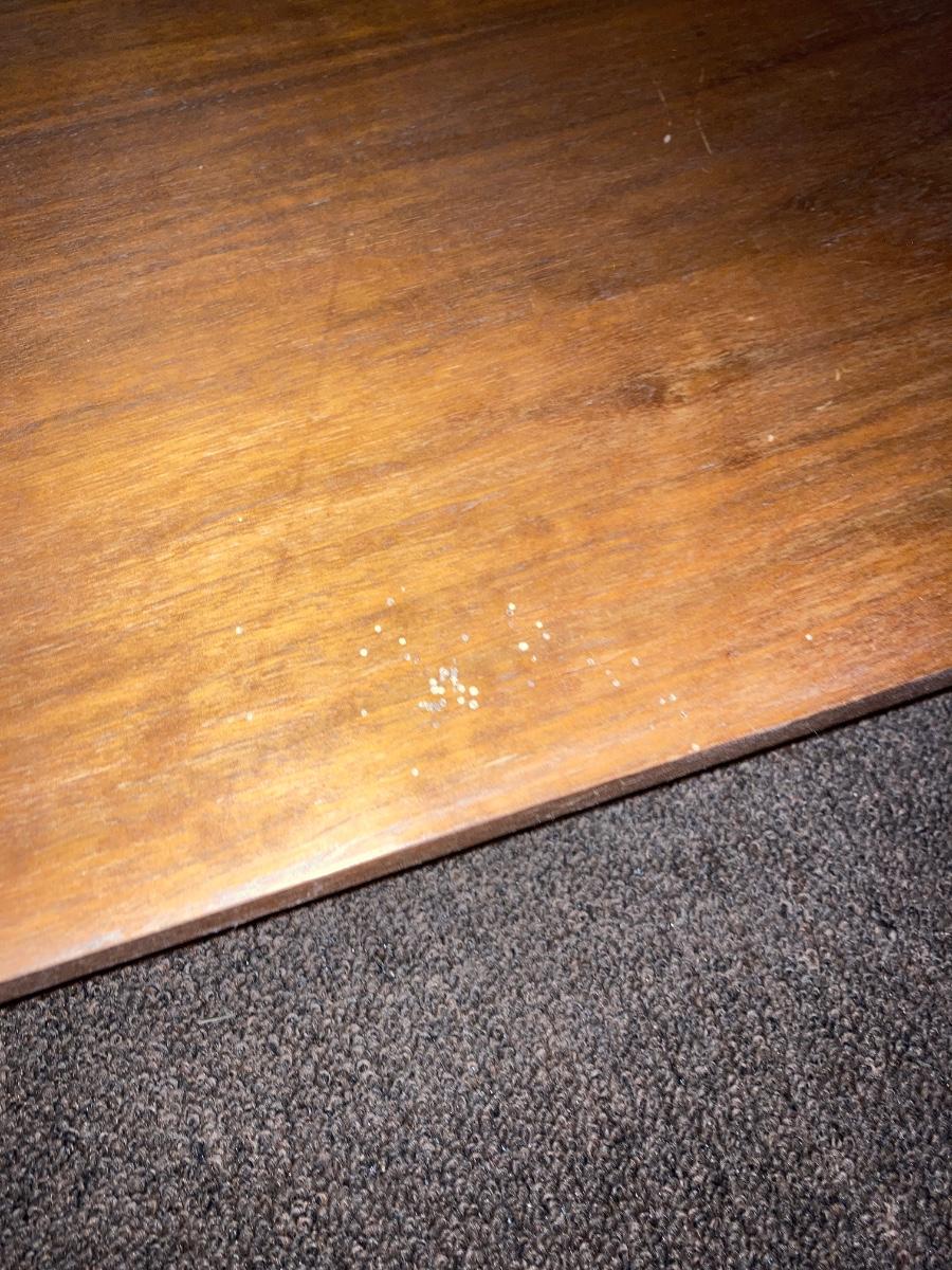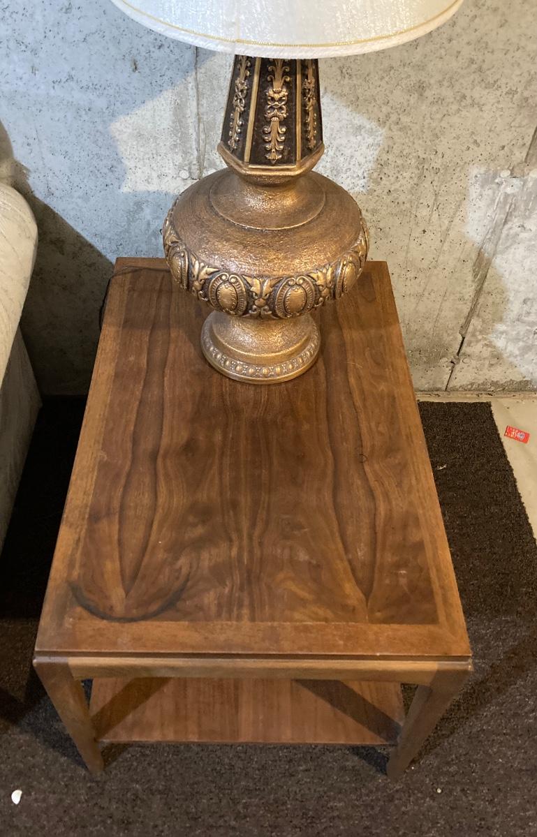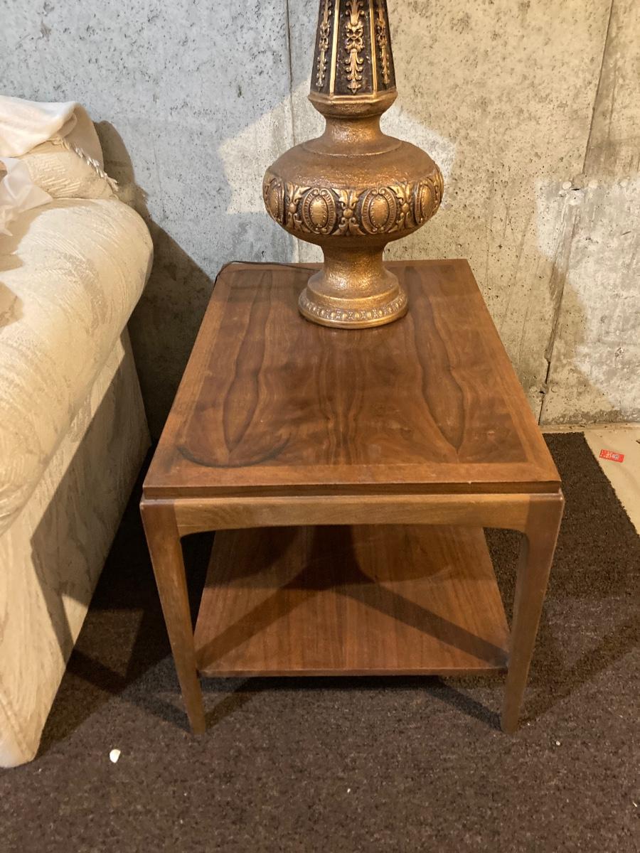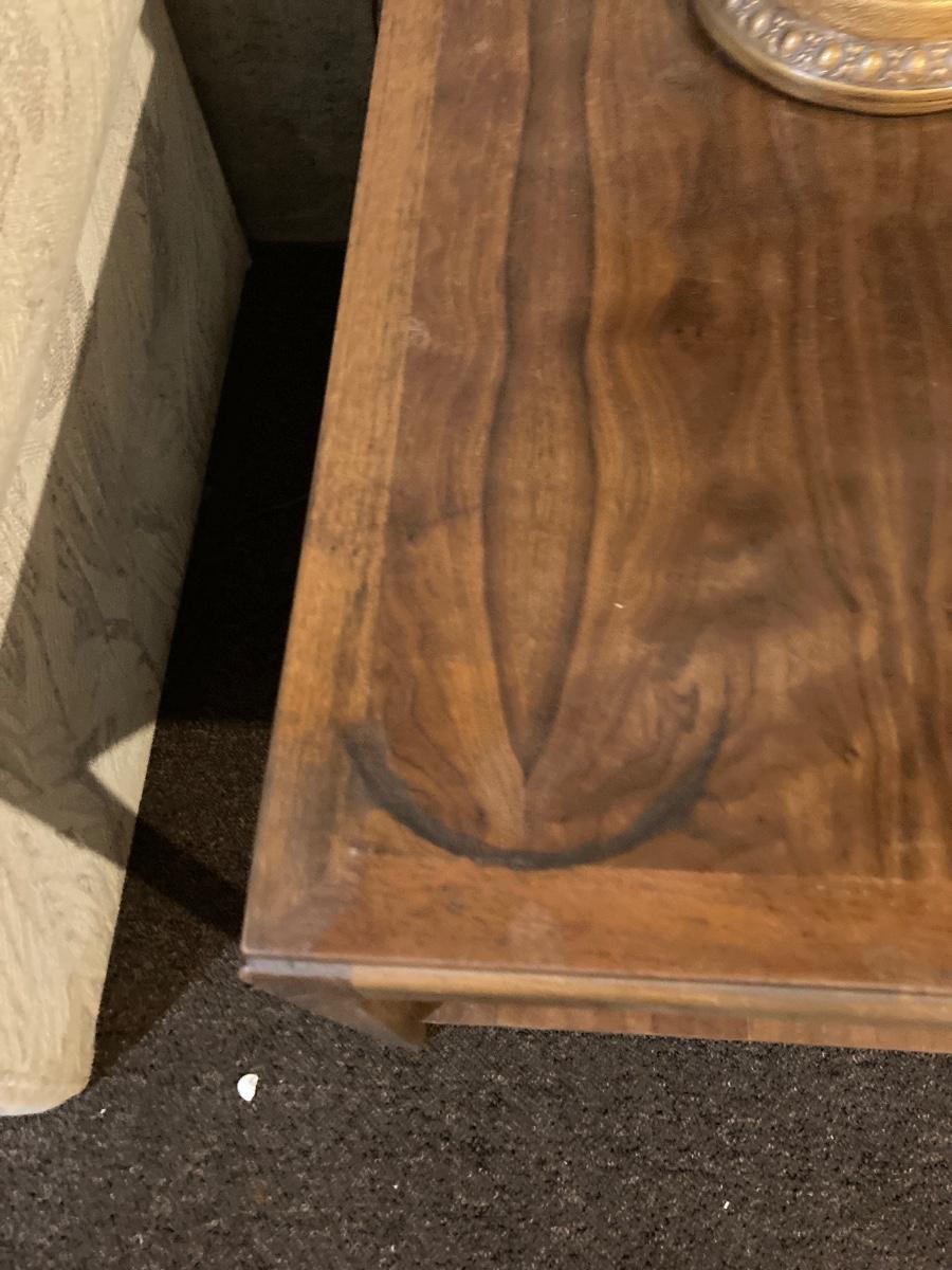 END TABLE DOES HAVE A WATER SPOT ON THE CORNER (in photos) BUT IT IS STILL A NICE SOLID WOOD TABLE
