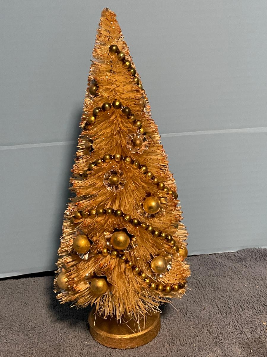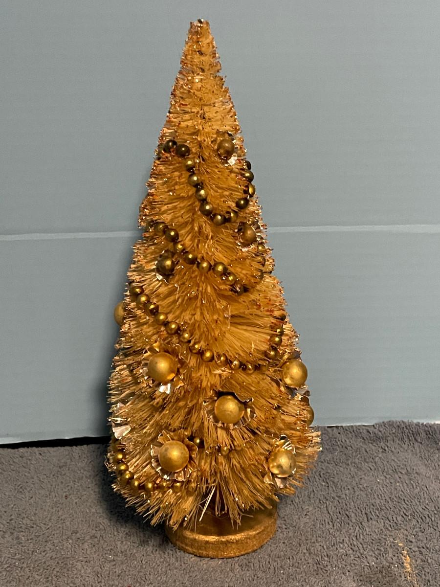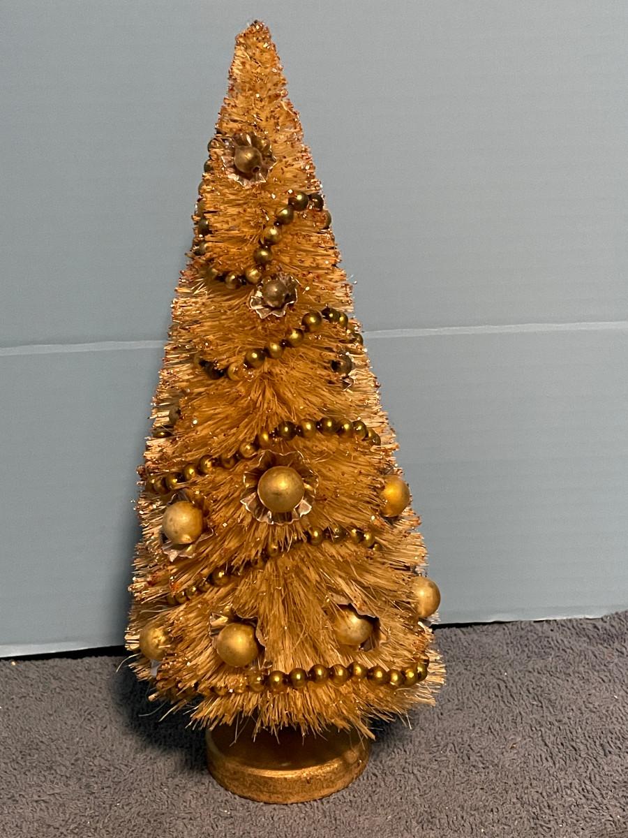 THIS IS A FABULOUS VINTAGE MCM GOLD BRUSH CHRISTMAS TREE!!! 12'' TALL.. WRITTEN ON BOTTOM.. LIGHT WEAR..