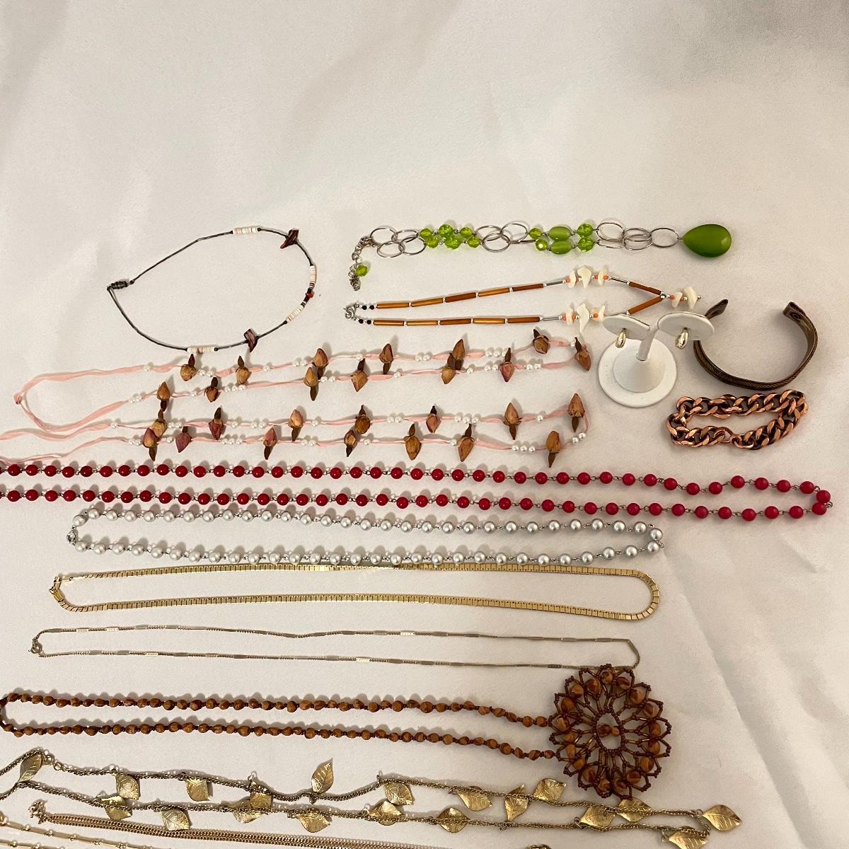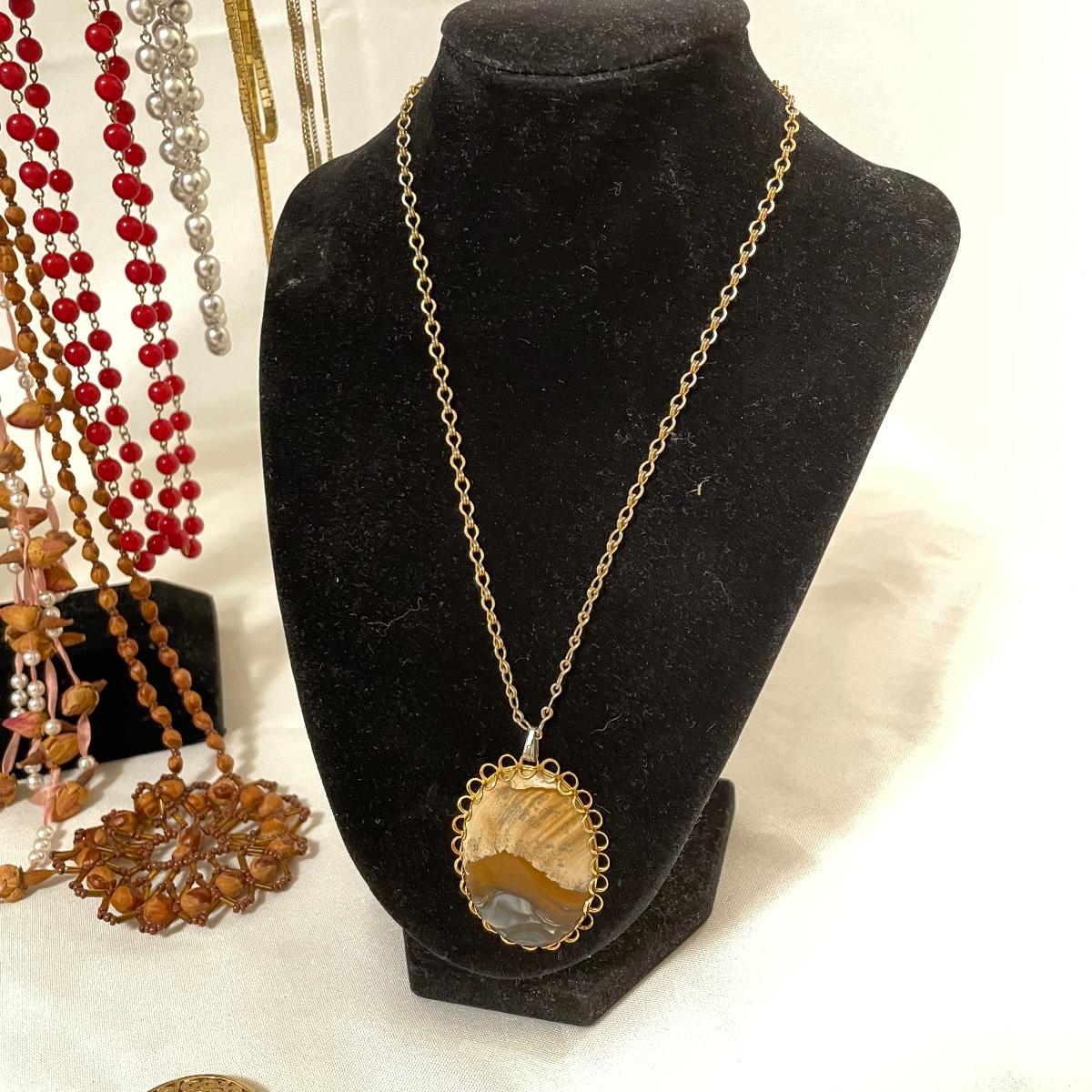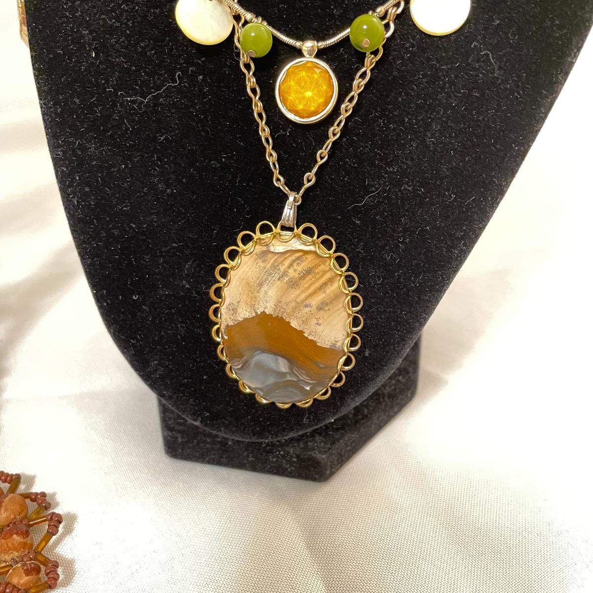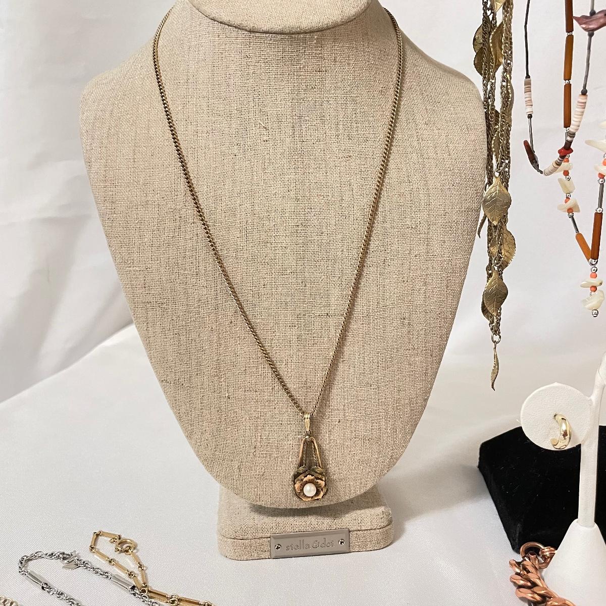 chains to bold citrine colored stone. Lot has a dried floral and pearl for a natural look and a another very pretty tri-colored pearl pendant. See images. Lot contains a bonus of two bracelets and a small posted half hoop earrings pair. Shipping available.