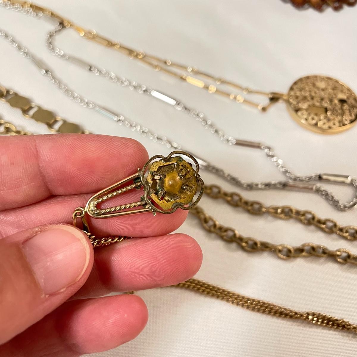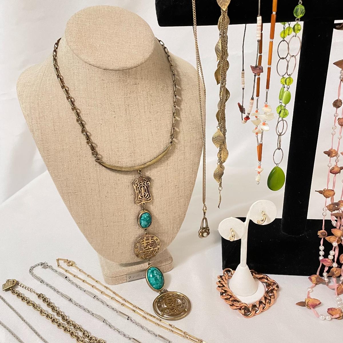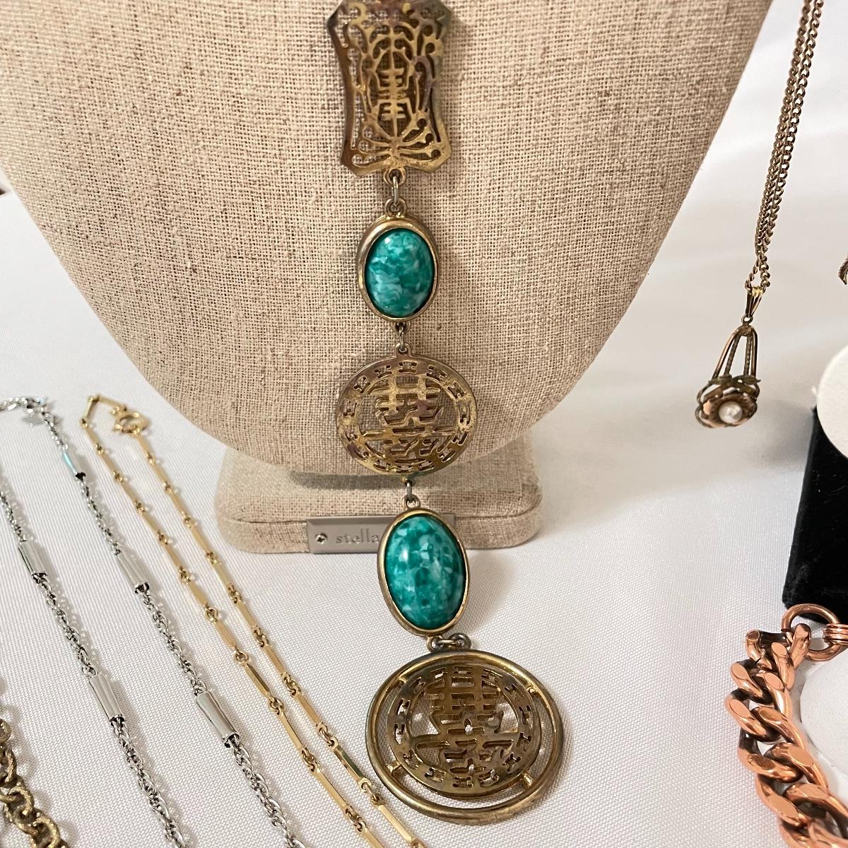chains to bold citrine colored stone. Lot has a dried floral and pearl for a natural look and a another very pretty tri-colored pearl pendant. See images. Lot contains a bonus of two bracelets and a small posted half hoop earrings pair. Shipping available.