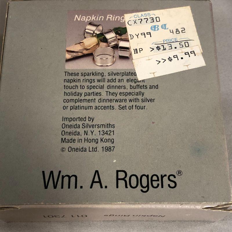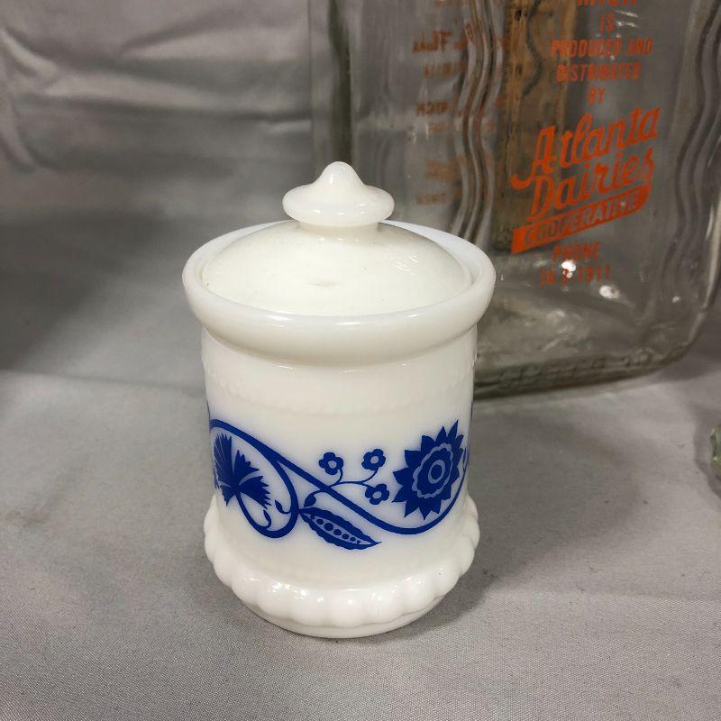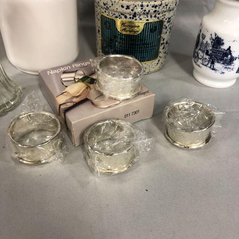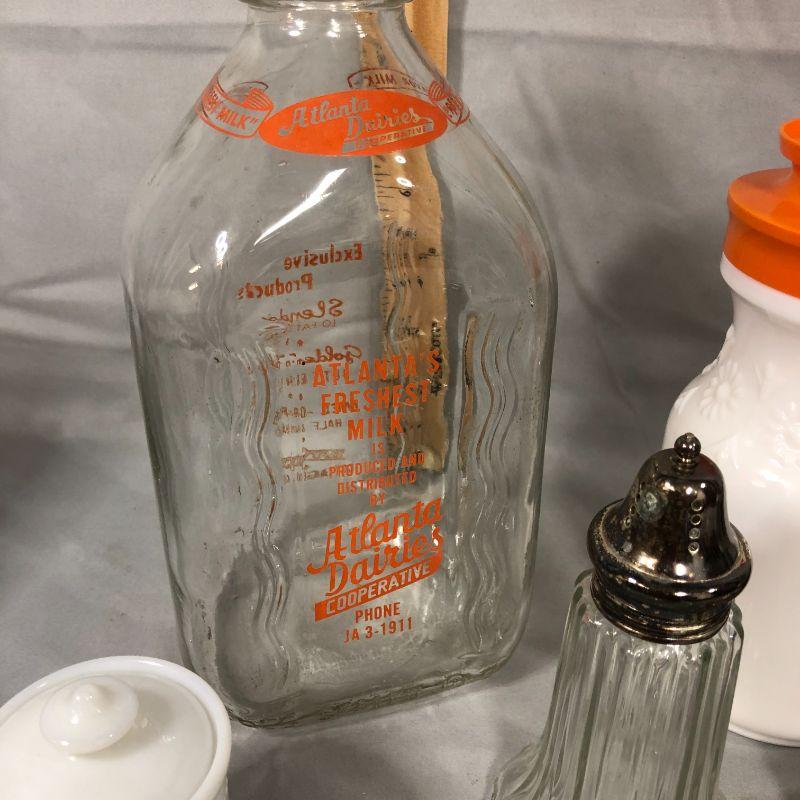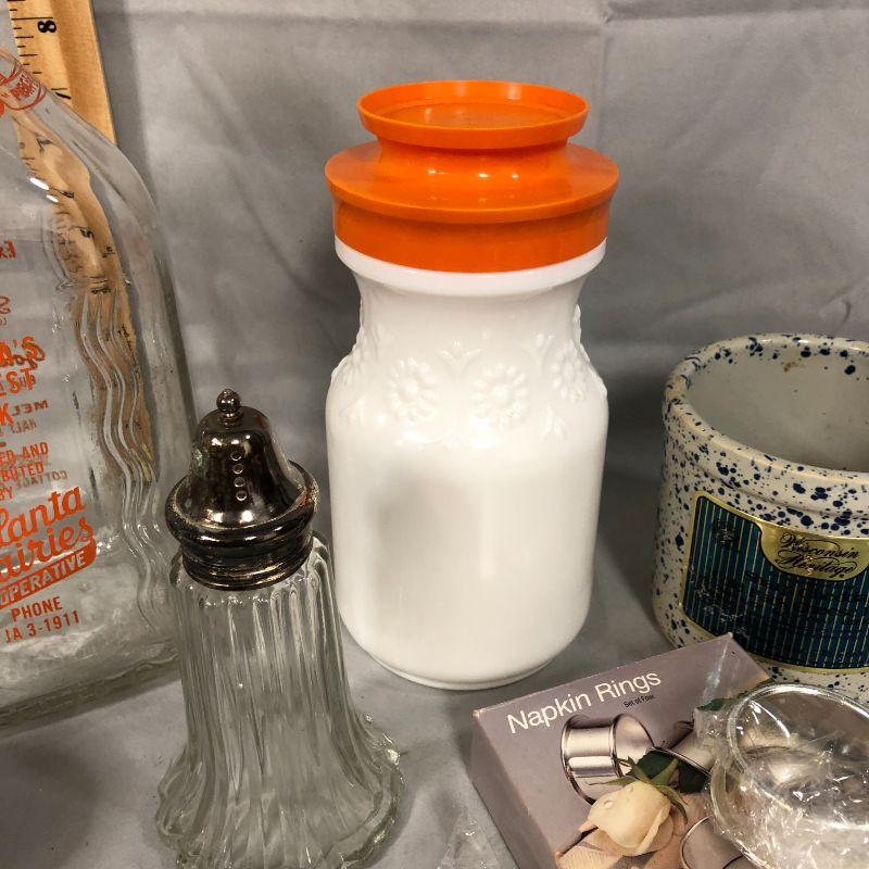 All of these items are in great condition and could be found on someone's dinner table. There is a 1962 Atlanta Dairies 2 Qt milk bottle, a German mustard milk glass jar (the one with the brown lid), a milk glass spice jar from the 1960s (maybe Federal Glass), a sugar shaker marked "Japan" on the base, a milk glass juice jar, a blue speckled crock from Wisconsin Heritage, and finally silverplated napkin rings still wrapped and with the original box from Wm. A. Rogers.