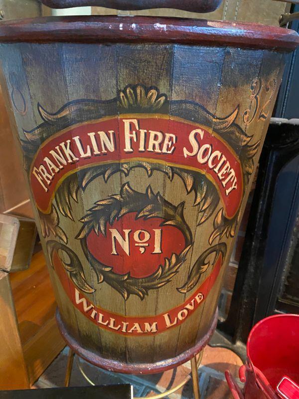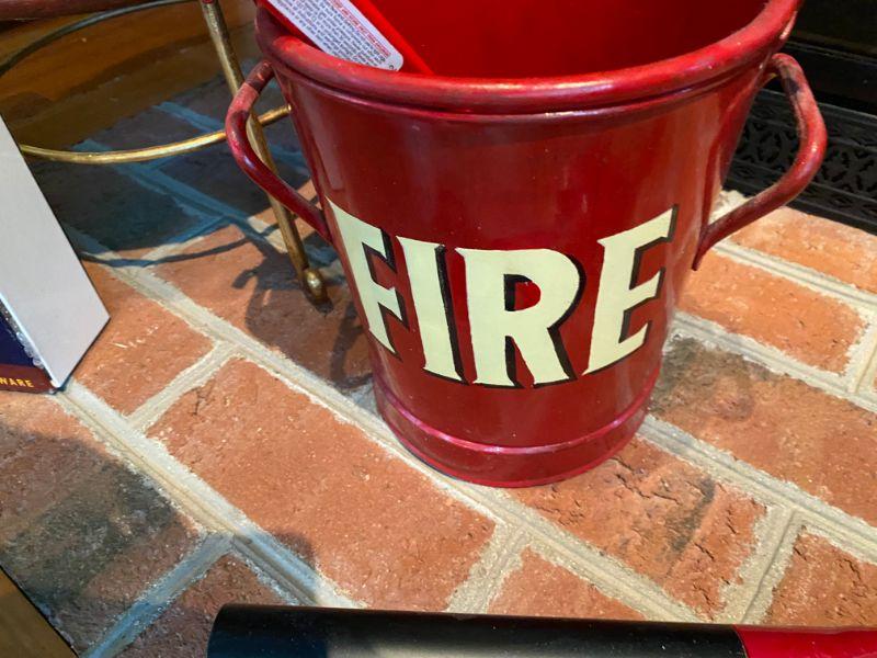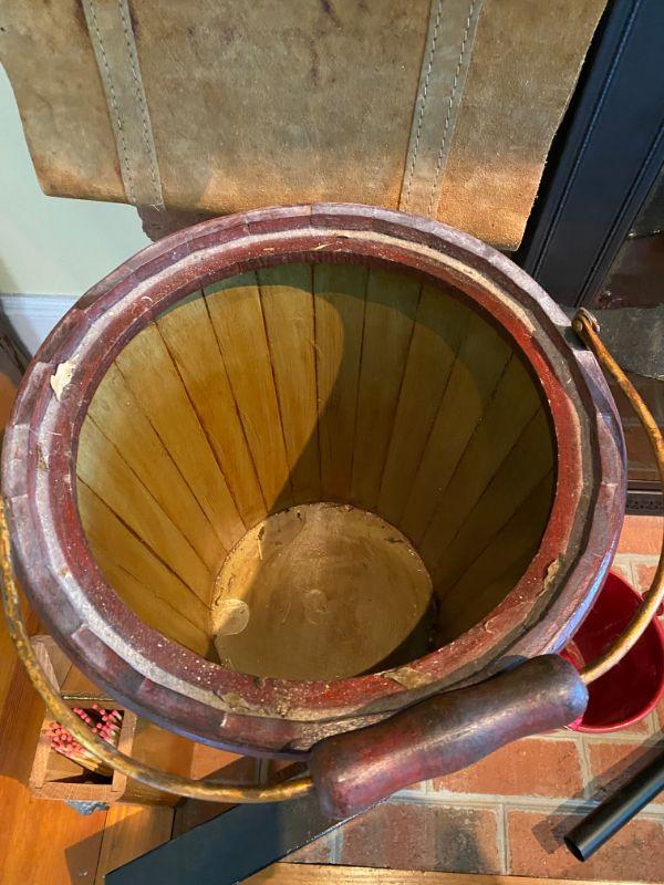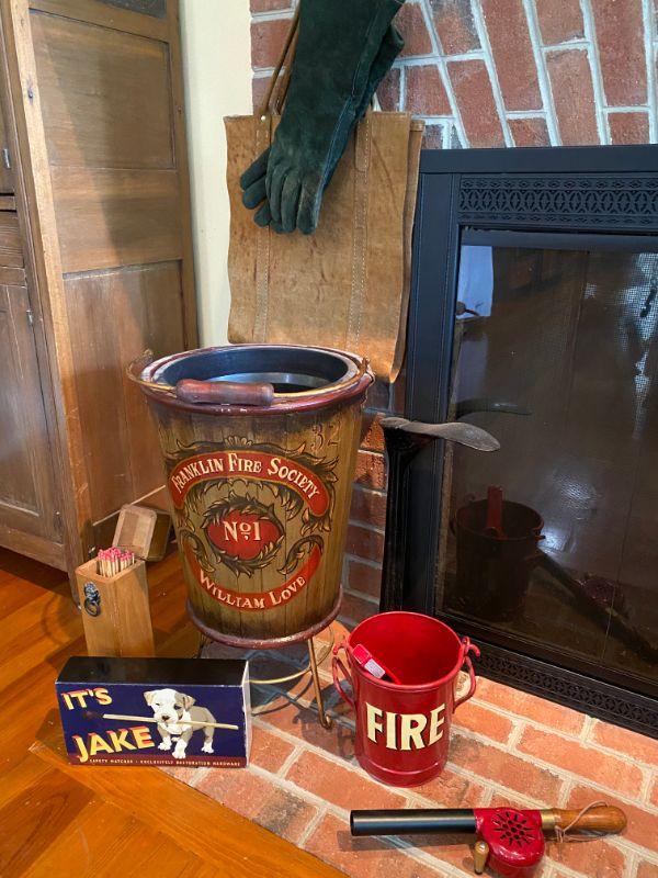 This lot is for a Franklin Fire Society Wooden Bucket with plastic liner, the other items are matches and small blower with suede log carrier , gloves, red metal "FIRE" Bucket and a metal boot stand