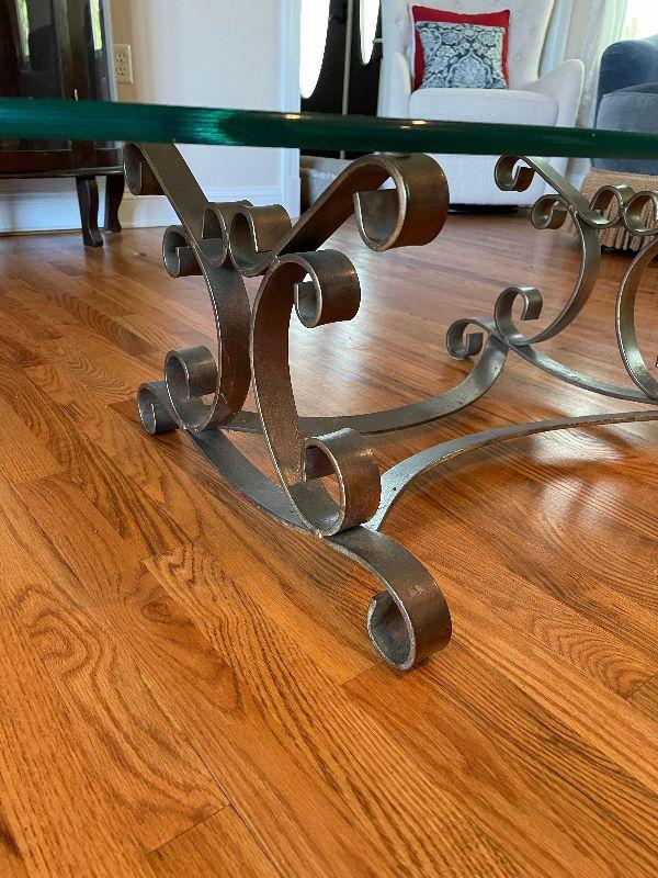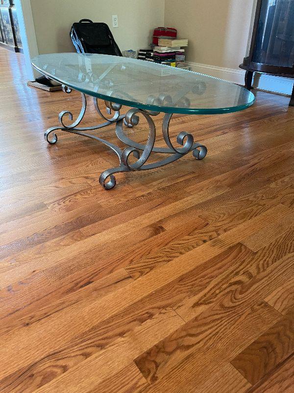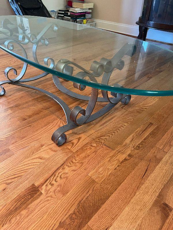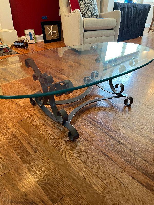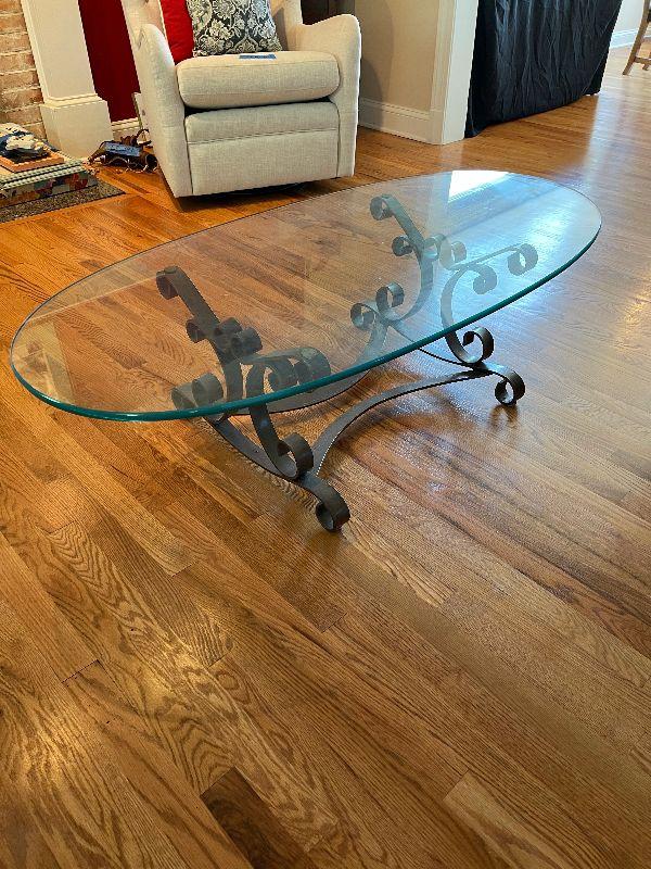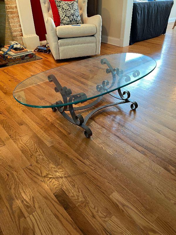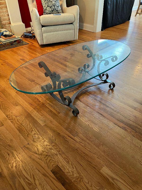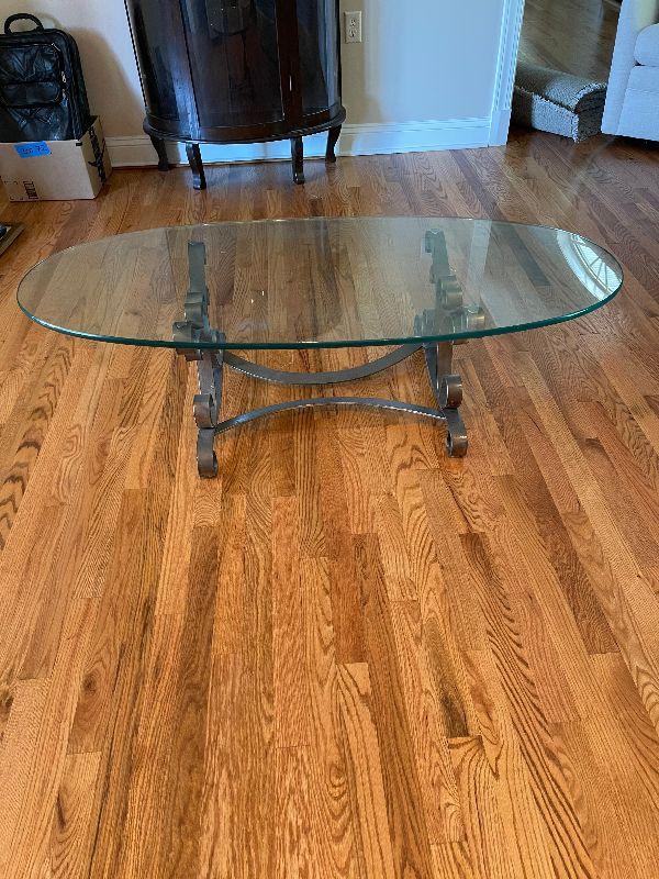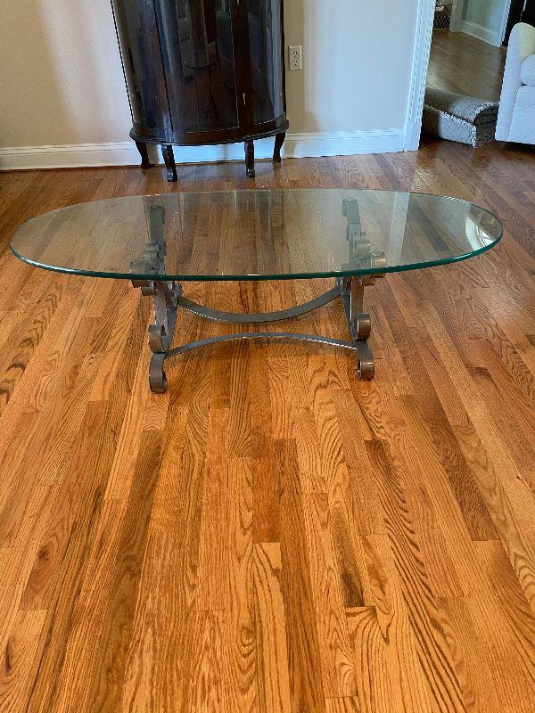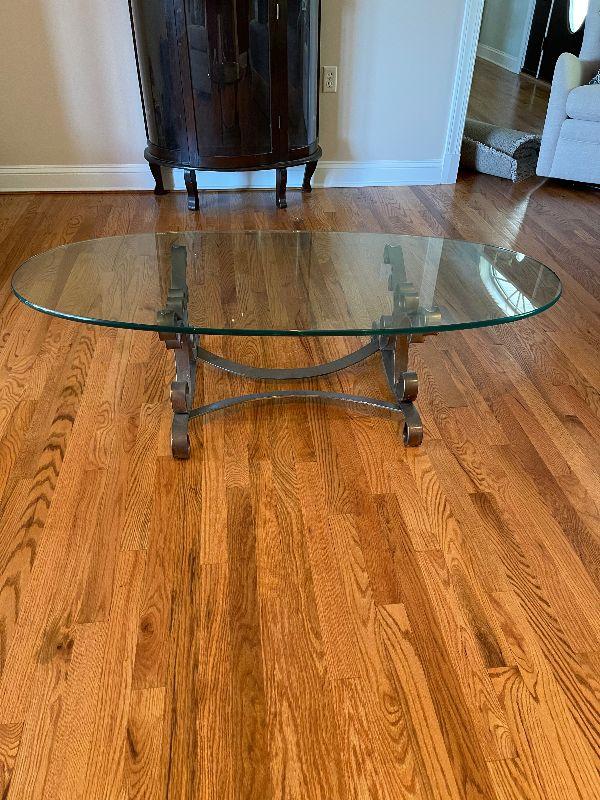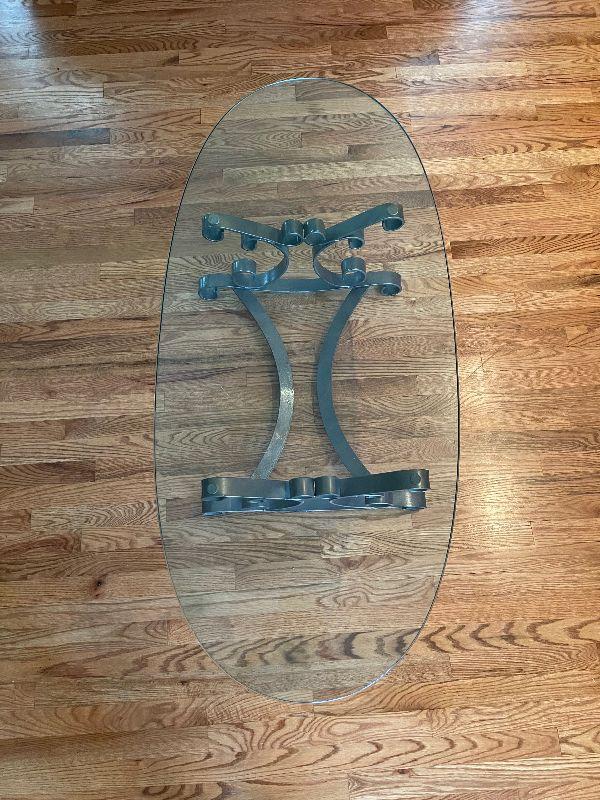 Glass Top Oval Coffee Table with Metal Base.