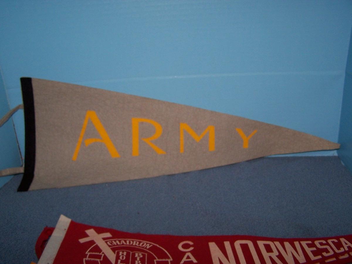 THESE ARE GREAT VINTAGE PENNANTS!!! ARMY-24 1/2'', WITH FRINGE... SOME WEAR/WRINKLES AND MISSING TIP...