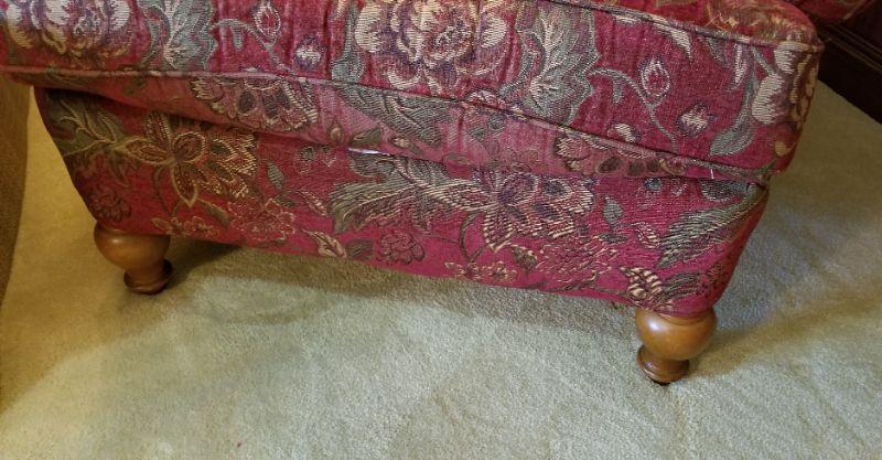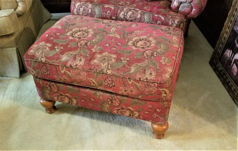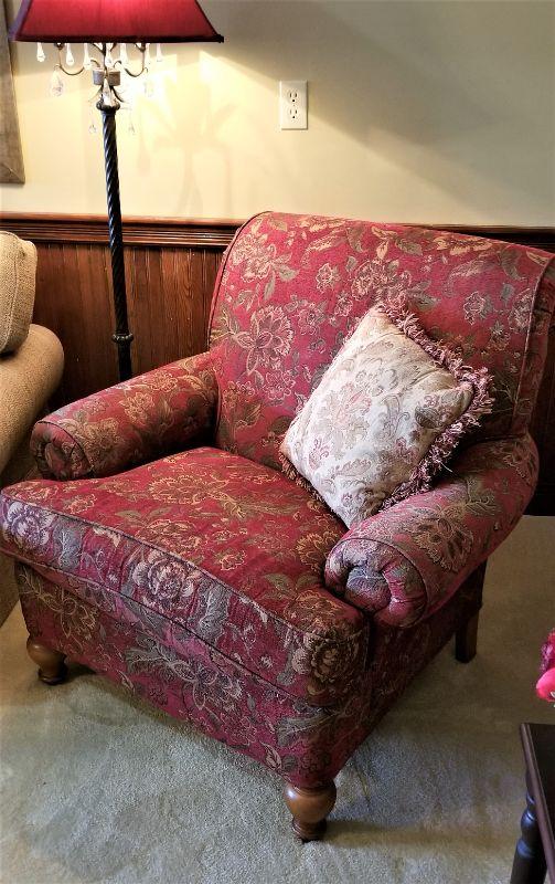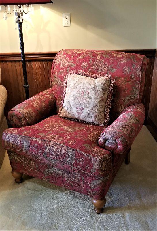 Handsome, comfortable upholstered club chair. Classic colors. Pillow comes with it. Measures 38.5" across, 32" deep, 36" tall. Ottoman measures 30" x 17".