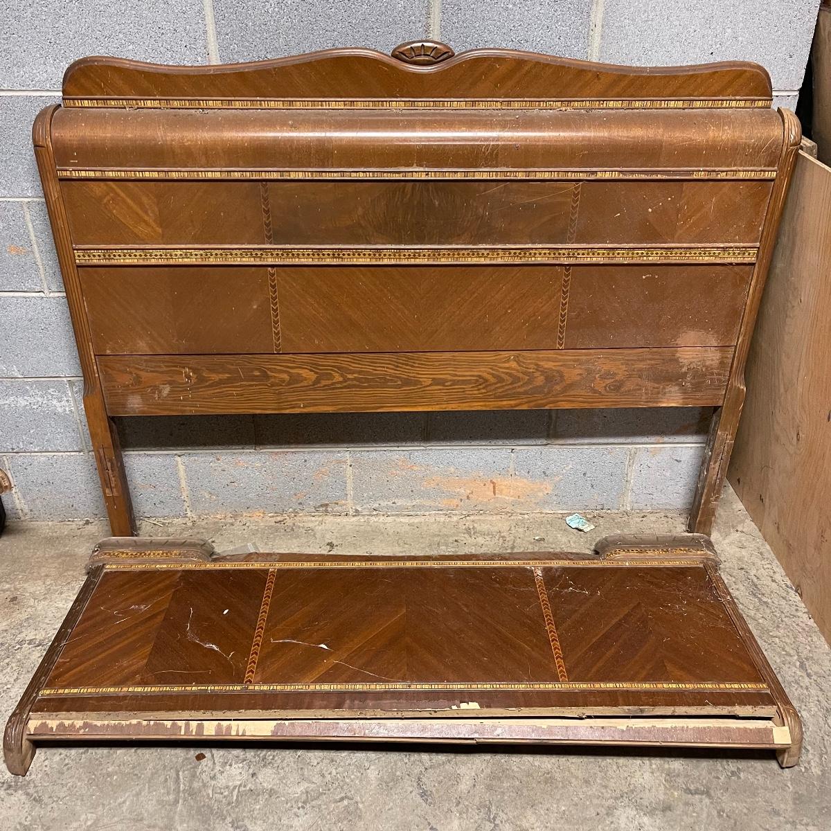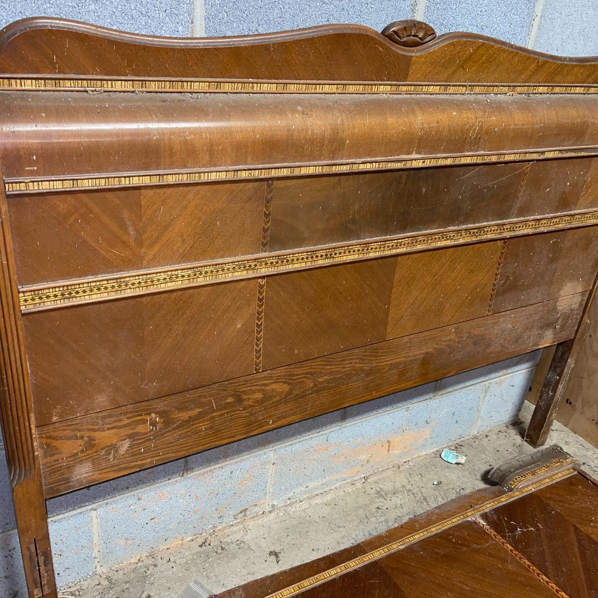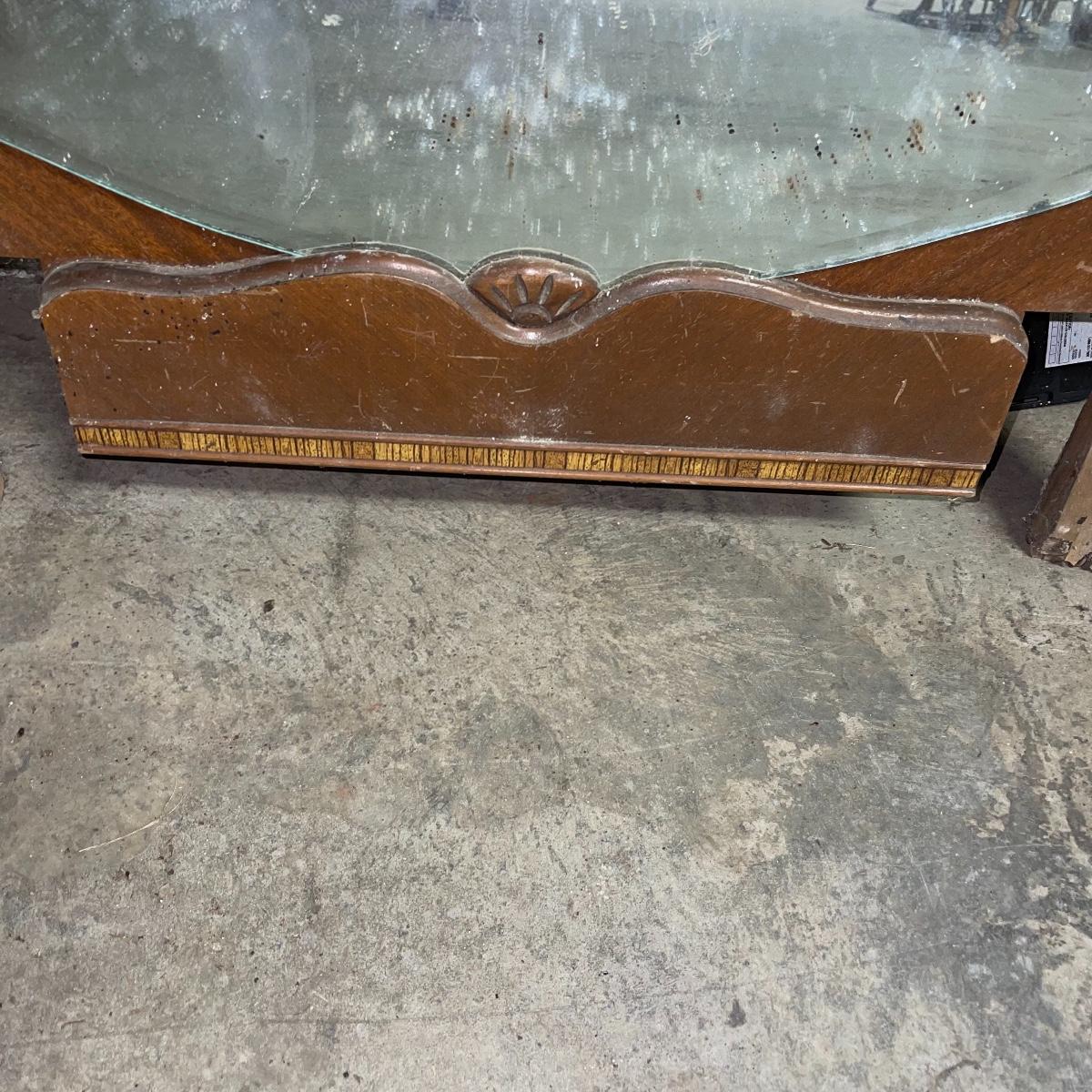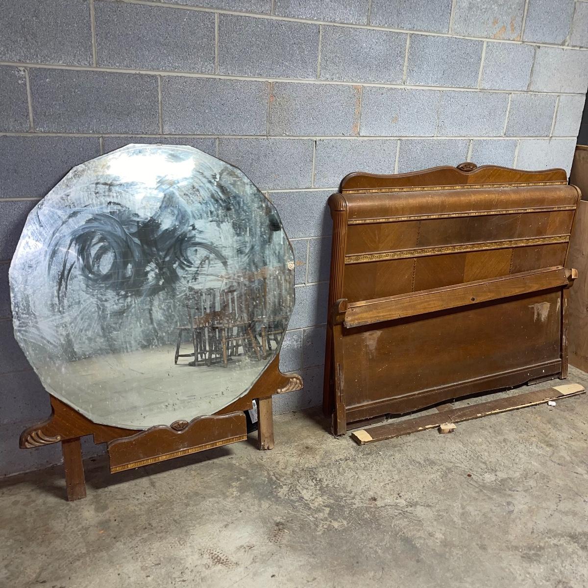 This combination of items could be a great project for those interested in refurbishing. The full sized foot and heard boards have interesting design details and are solid wood. The head board is 56 inches wide and 44.5 inches tall, the foot board has the same width and is 23.5 inches tall. With matching details, the mirror is 40 inches across the center. It is heavy and sits in a wooden base that can be attached to a dresser. The mirror cleaned up well but it does have a sticker that can be removed and it does have some permanent scratches in the glass that are shown in images.