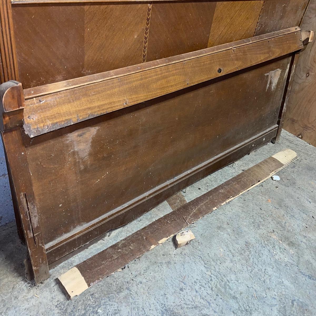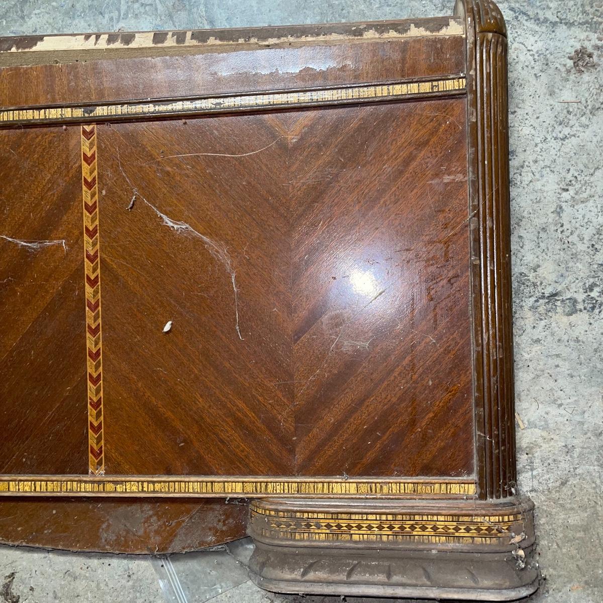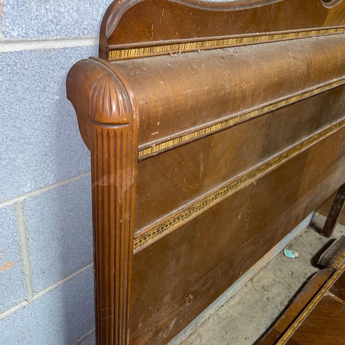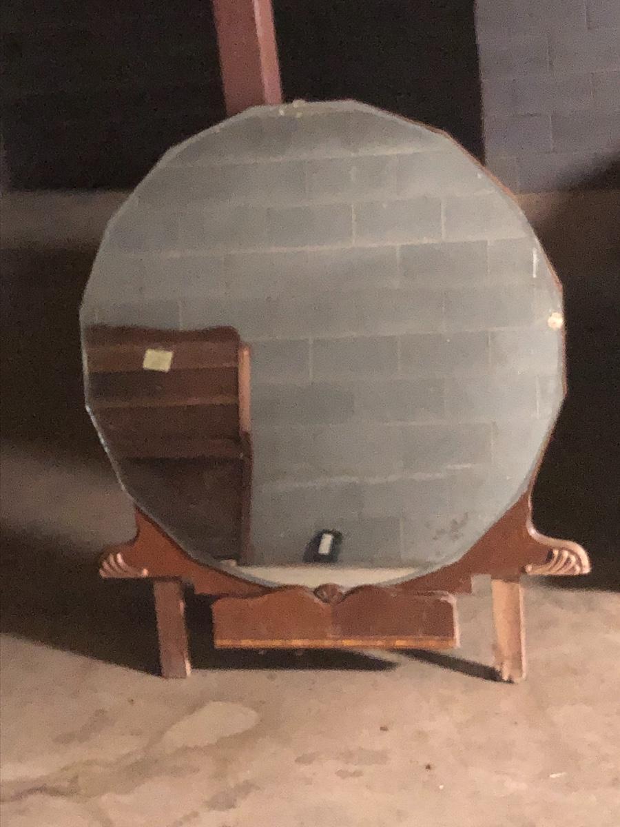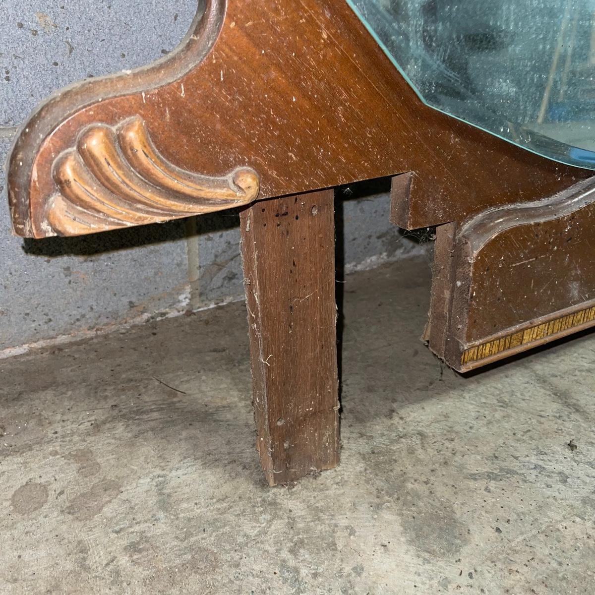 This combination of items could be a great project for those interested in refurbishing. The full sized foot and heard boards have interesting design details and are solid wood. The head board is 56 inches wide and 44.5 inches tall, the foot board has the same width and is 23.5 inches tall. With matching details, the mirror is 40 inches across the center. It is heavy and sits in a wooden base that can be attached to a dresser. The mirror cleaned up well but it does have a sticker that can be removed and it does have some permanent scratches in the glass that are shown in images.