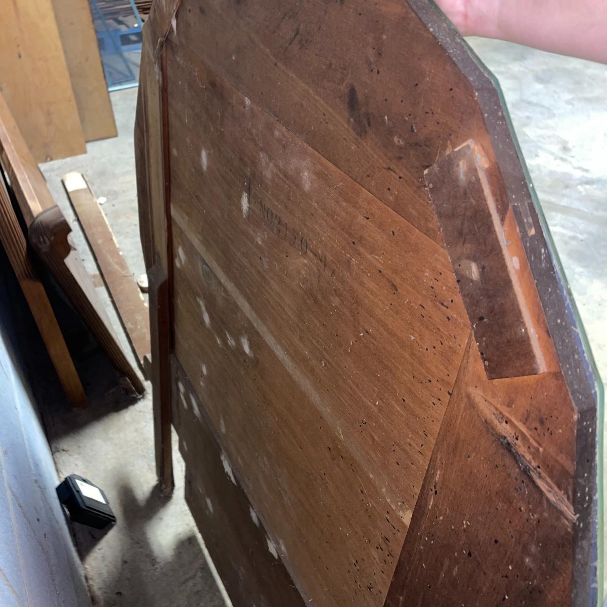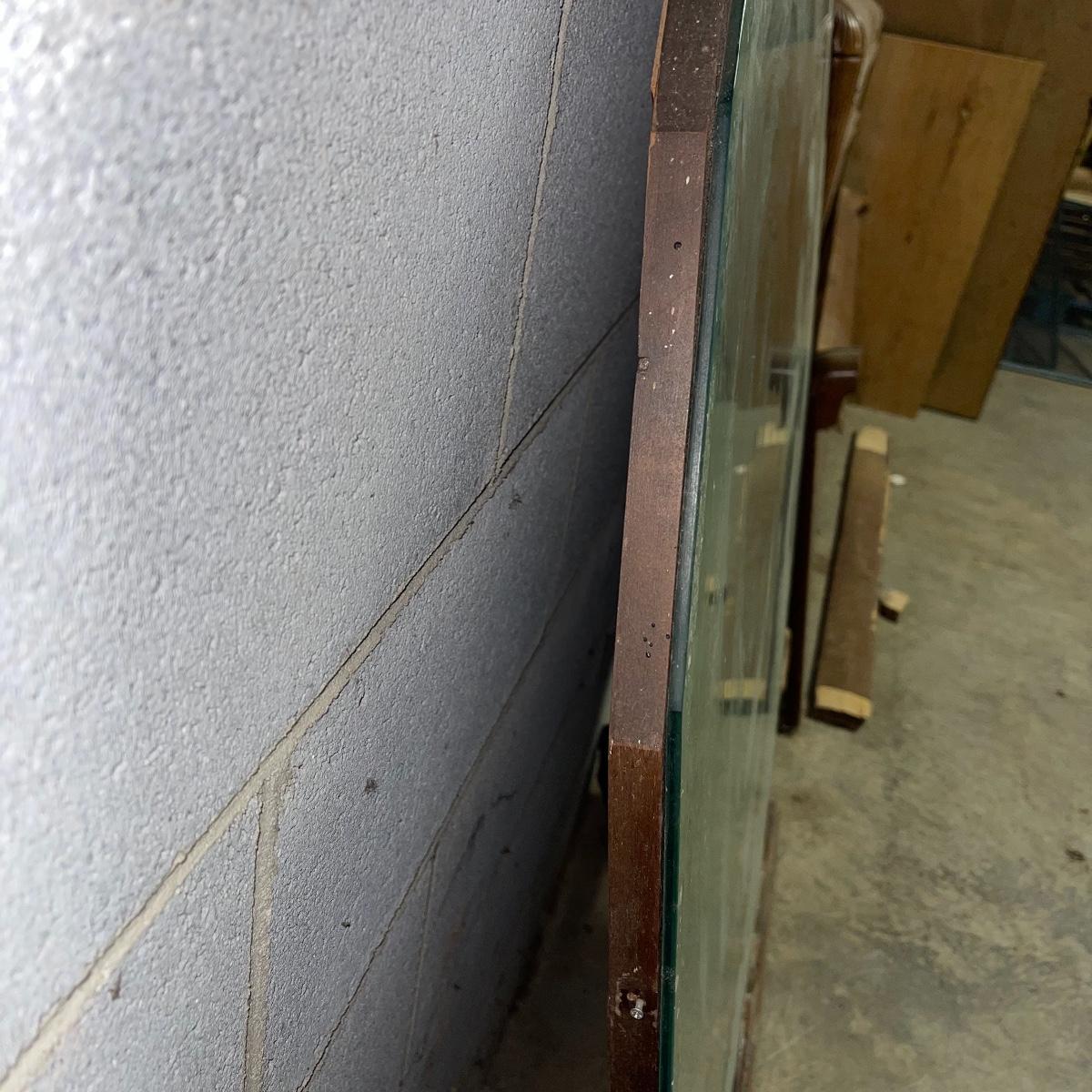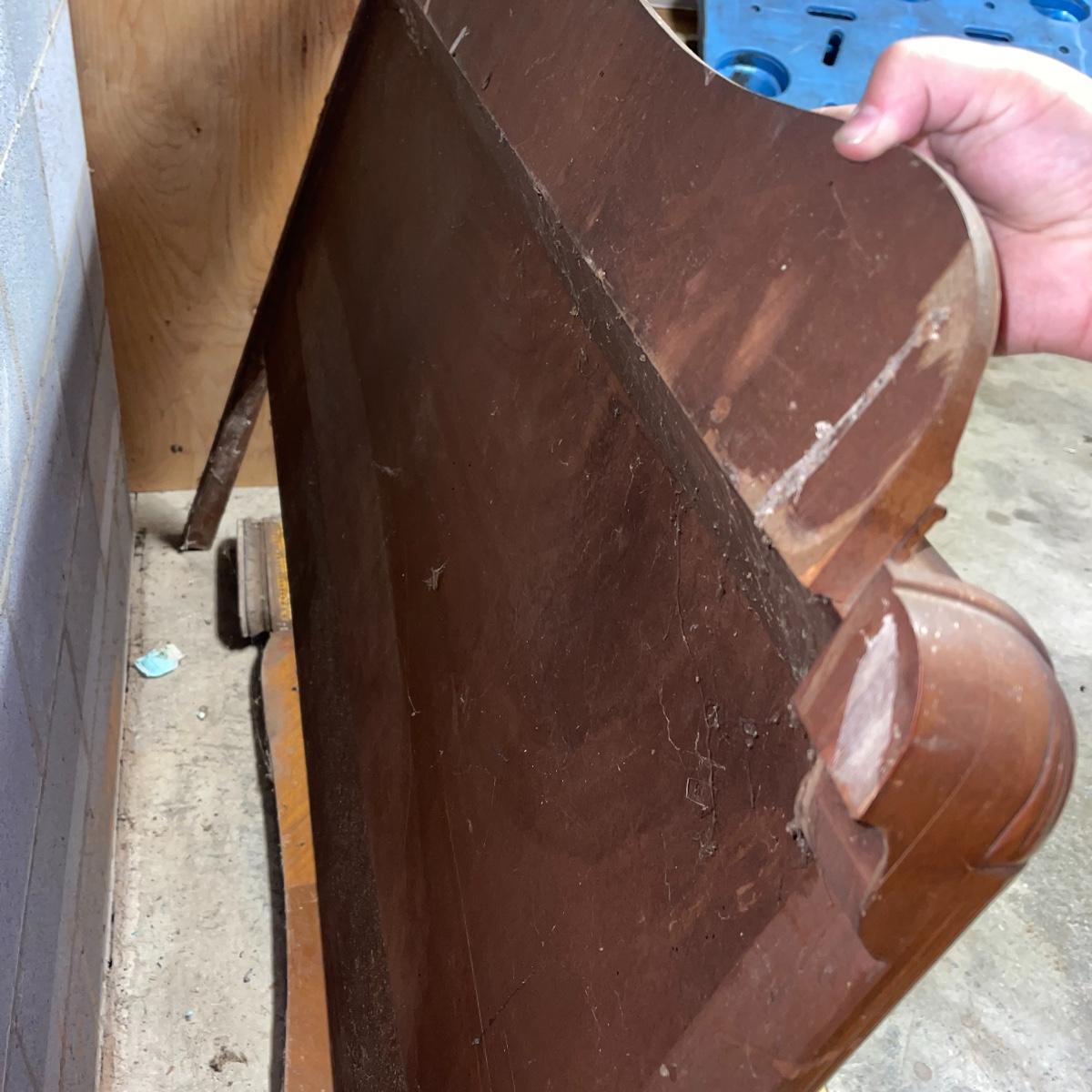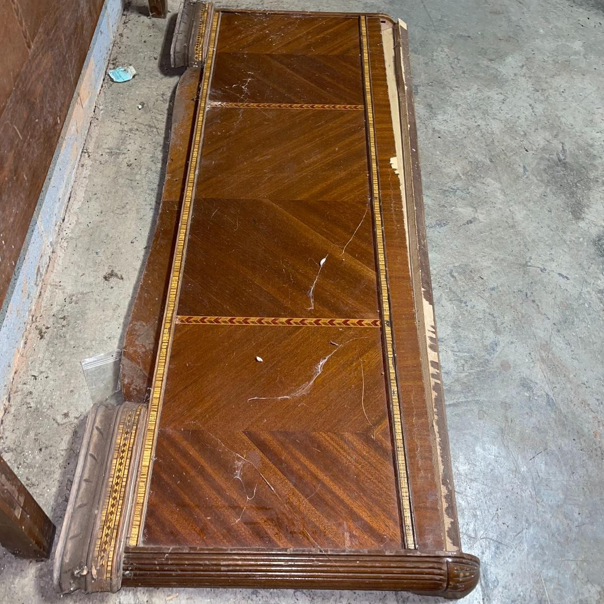 This combination of items could be a great project for those interested in refurbishing. The full sized foot and heard boards have interesting design details and are solid wood. The head board is 56 inches wide and 44.5 inches tall, the foot board has the same width and is 23.5 inches tall. With matching details, the mirror is 40 inches across the center. It is heavy and sits in a wooden base that can be attached to a dresser. The mirror cleaned up well but it does have a sticker that can be removed and it does have some permanent scratches in the glass that are shown in images.