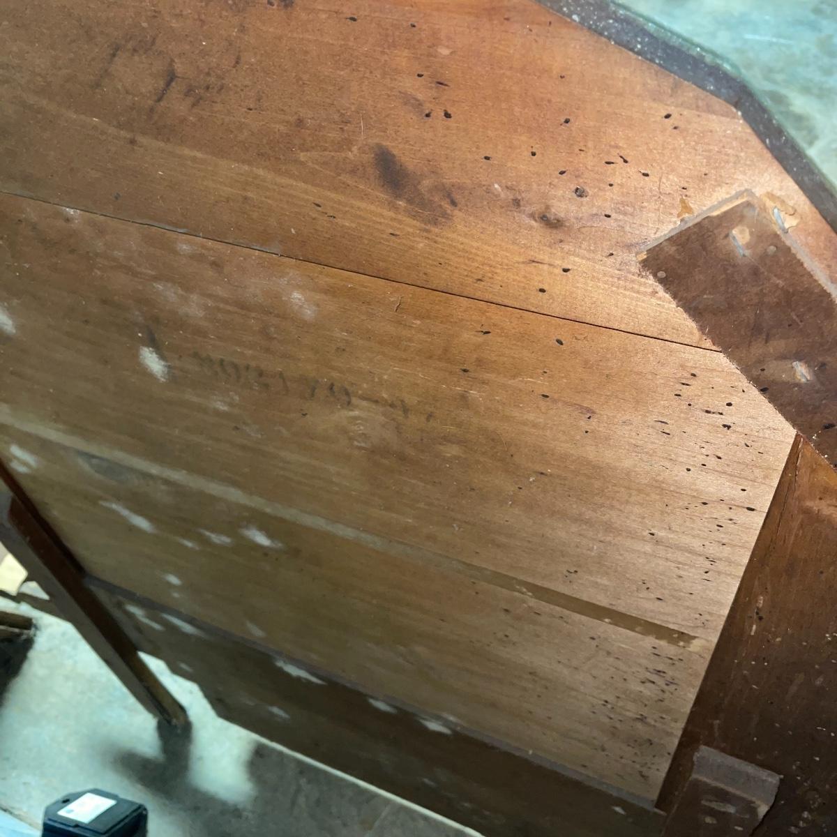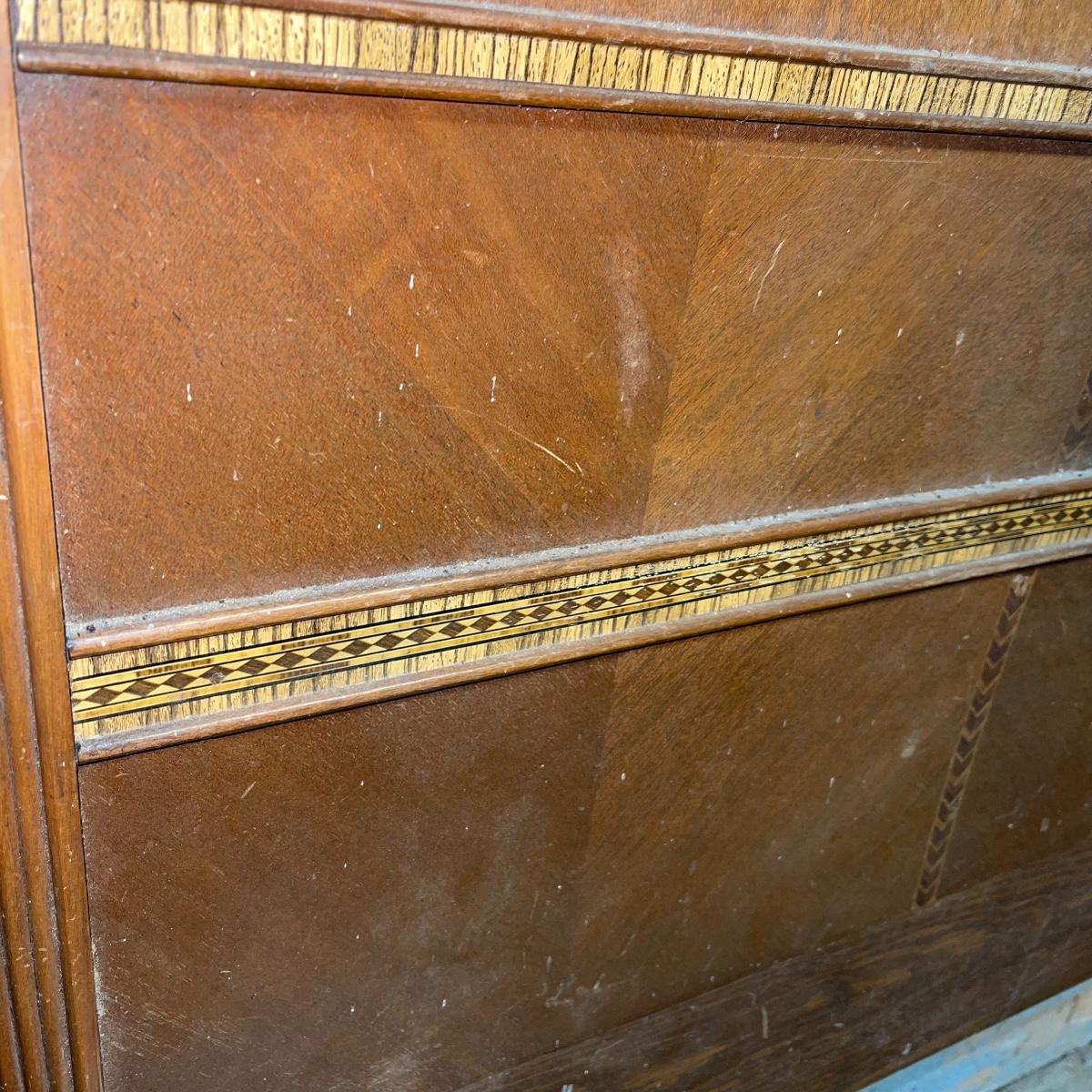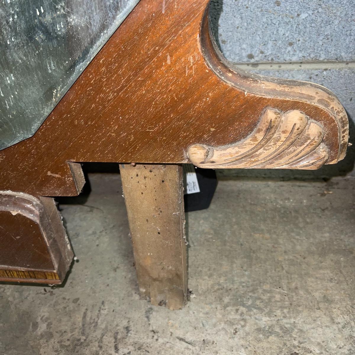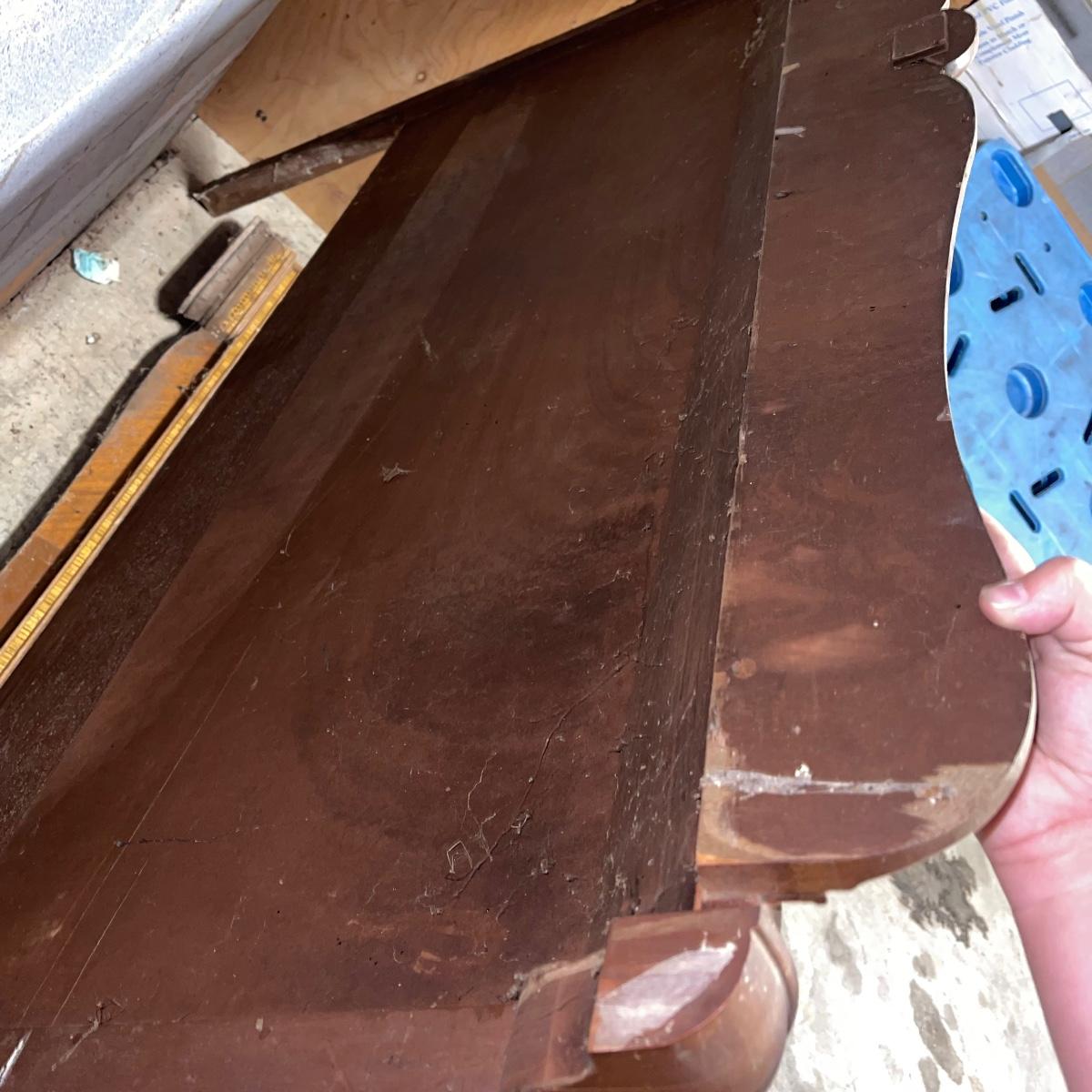 This combination of items could be a great project for those interested in refurbishing. The full sized foot and heard boards have interesting design details and are solid wood. The head board is 56 inches wide and 44.5 inches tall, the foot board has the same width and is 23.5 inches tall. With matching details, the mirror is 40 inches across the center. It is heavy and sits in a wooden base that can be attached to a dresser. The mirror cleaned up well but it does have a sticker that can be removed and it does have some permanent scratches in the glass that are shown in images.
