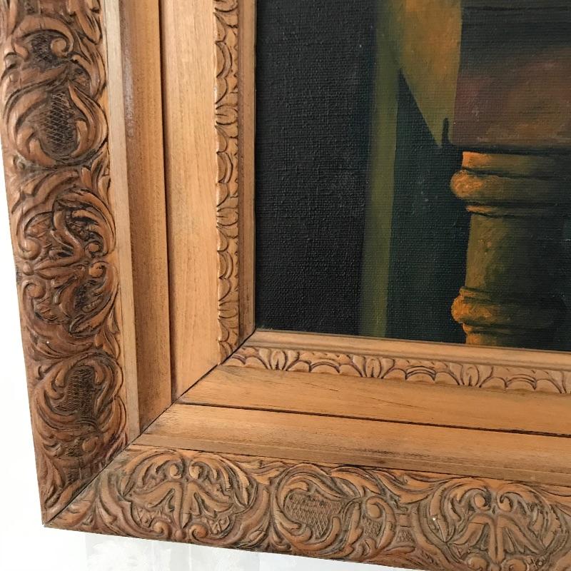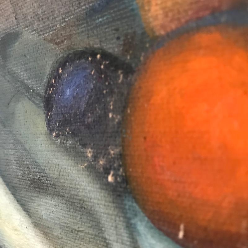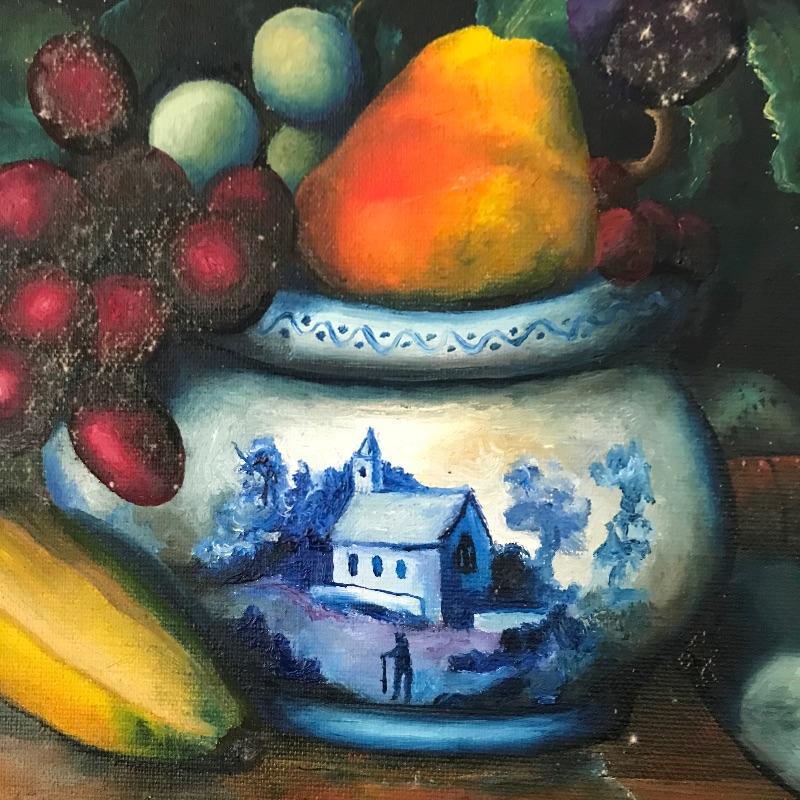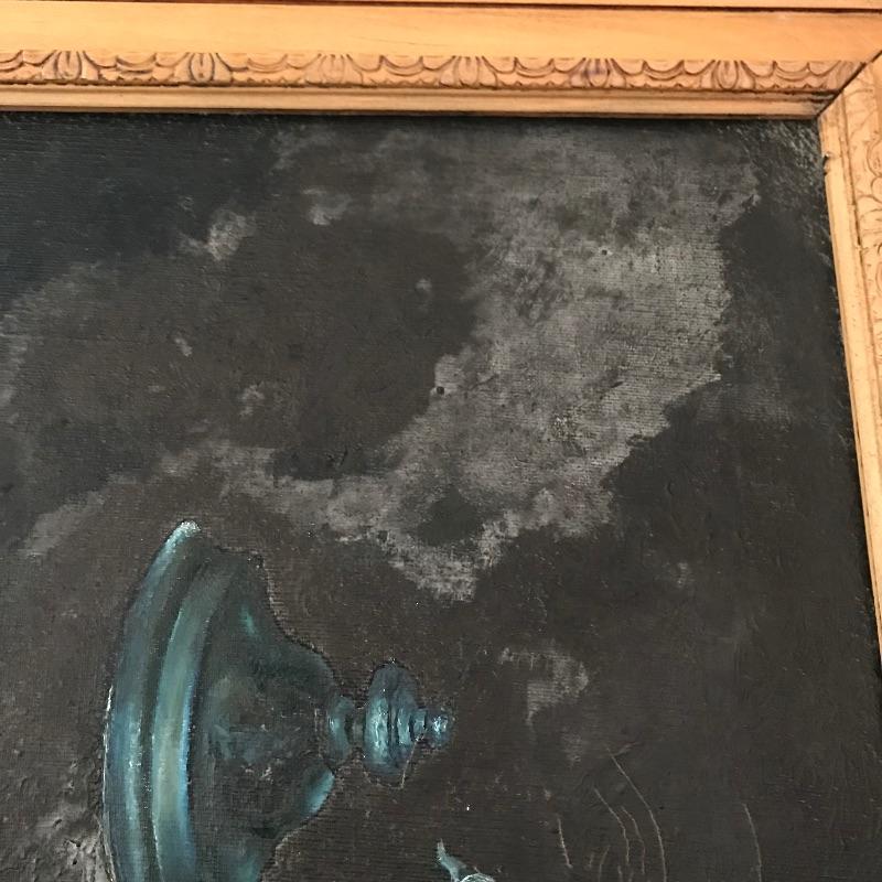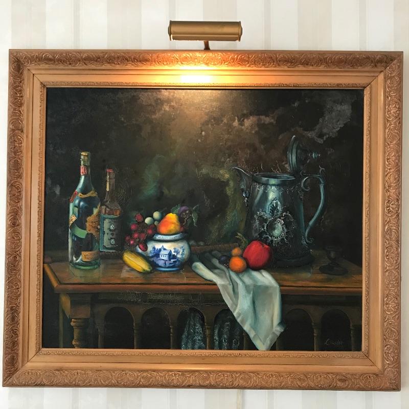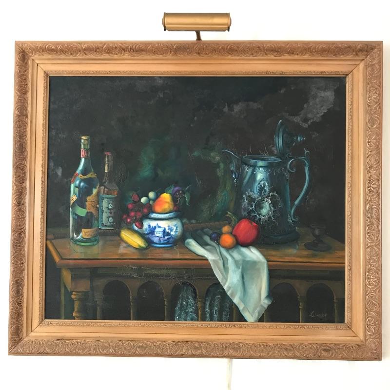 Stunning still life oil painting signed Lillquist. Piece has exceptional details and coloring throughout. Back of frame has a label with more artist information, see photos. Frame is also very impressive, made of carved wood measuring 41” x 35”. Sadly, some mildew is present on art, and frame, see photos. Bring this beauty back to life! Shipping available, please call UPS with dimensions at 828-252-6930 for a shipping quote prior to bidding.