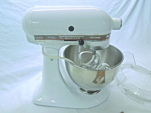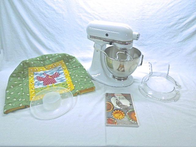 Nice working Kitchenaid UltraPower 300 watt mixer with spatter shield, bowl cover, recipe book and cute handmade cotton chicken cover that fits over entire unit. Three attachments include whip: dough hook and paddle. All in great working condition. No scratches.