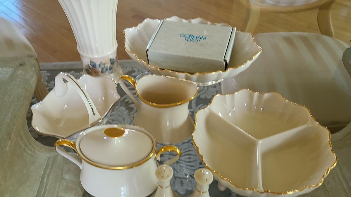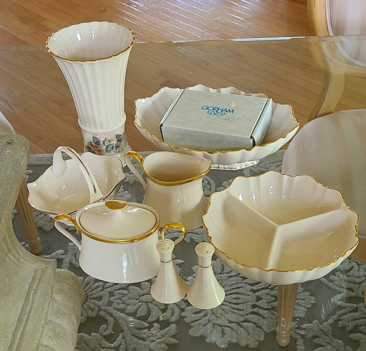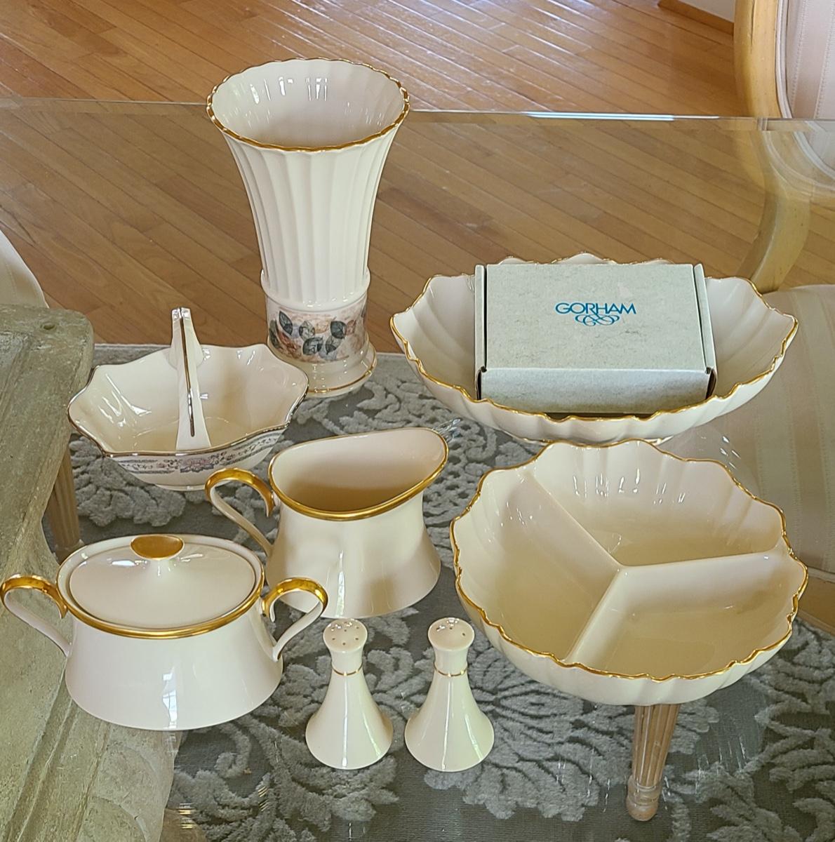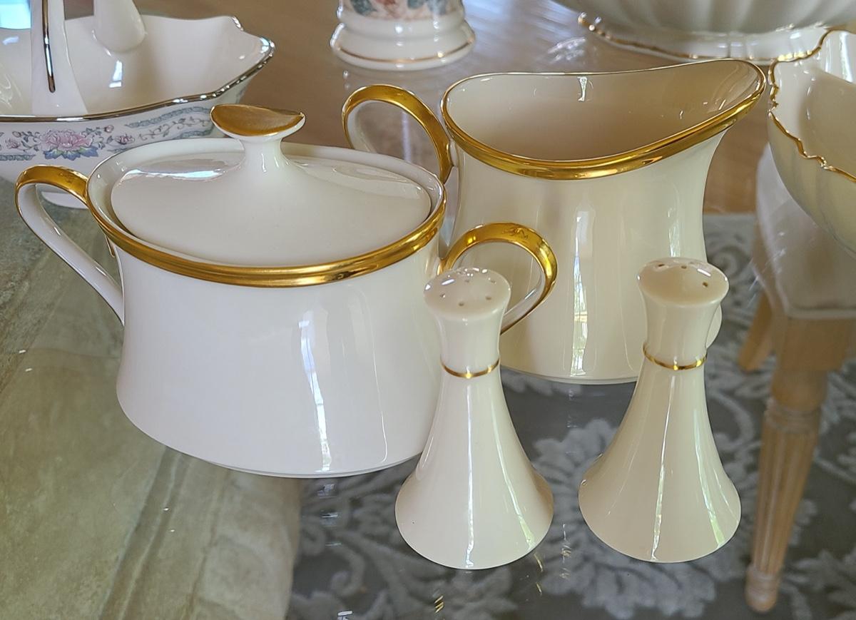 Mixed lot of Lenox serving pieces including gold rimmed sugar and creamer with matching salt/pepper set, divided relish or candy, vases, napkin rings and more. Please see all pictures for content of the lot, condition of the lot, and measurements if taken. Pictures are the best representation of the items listed and items are untested unless indicated in description. Thank you for looking and have fun bidding!