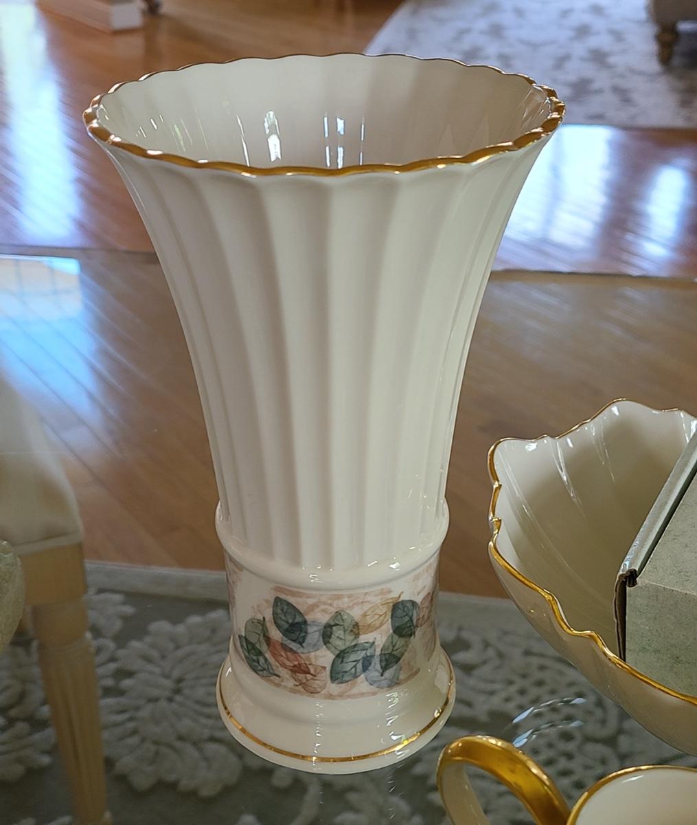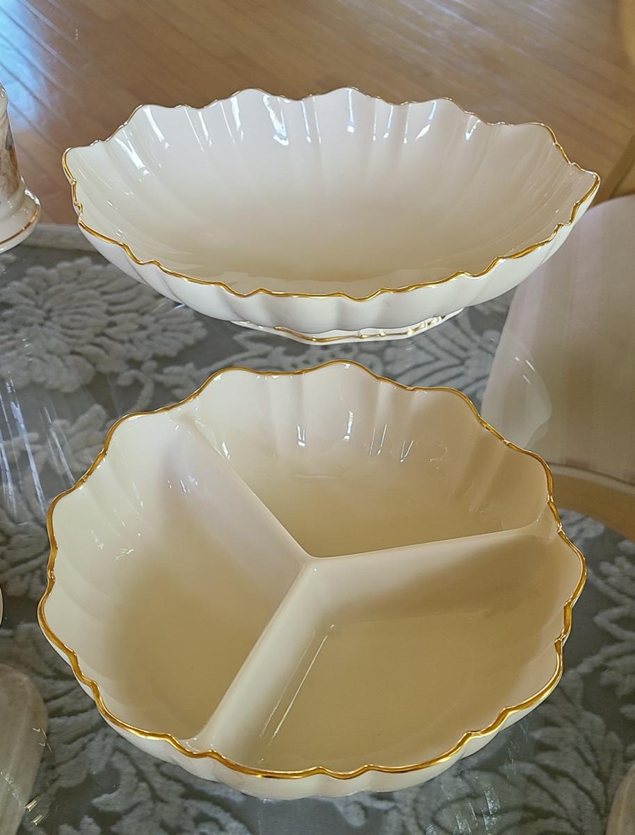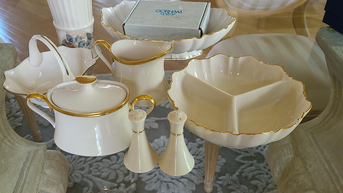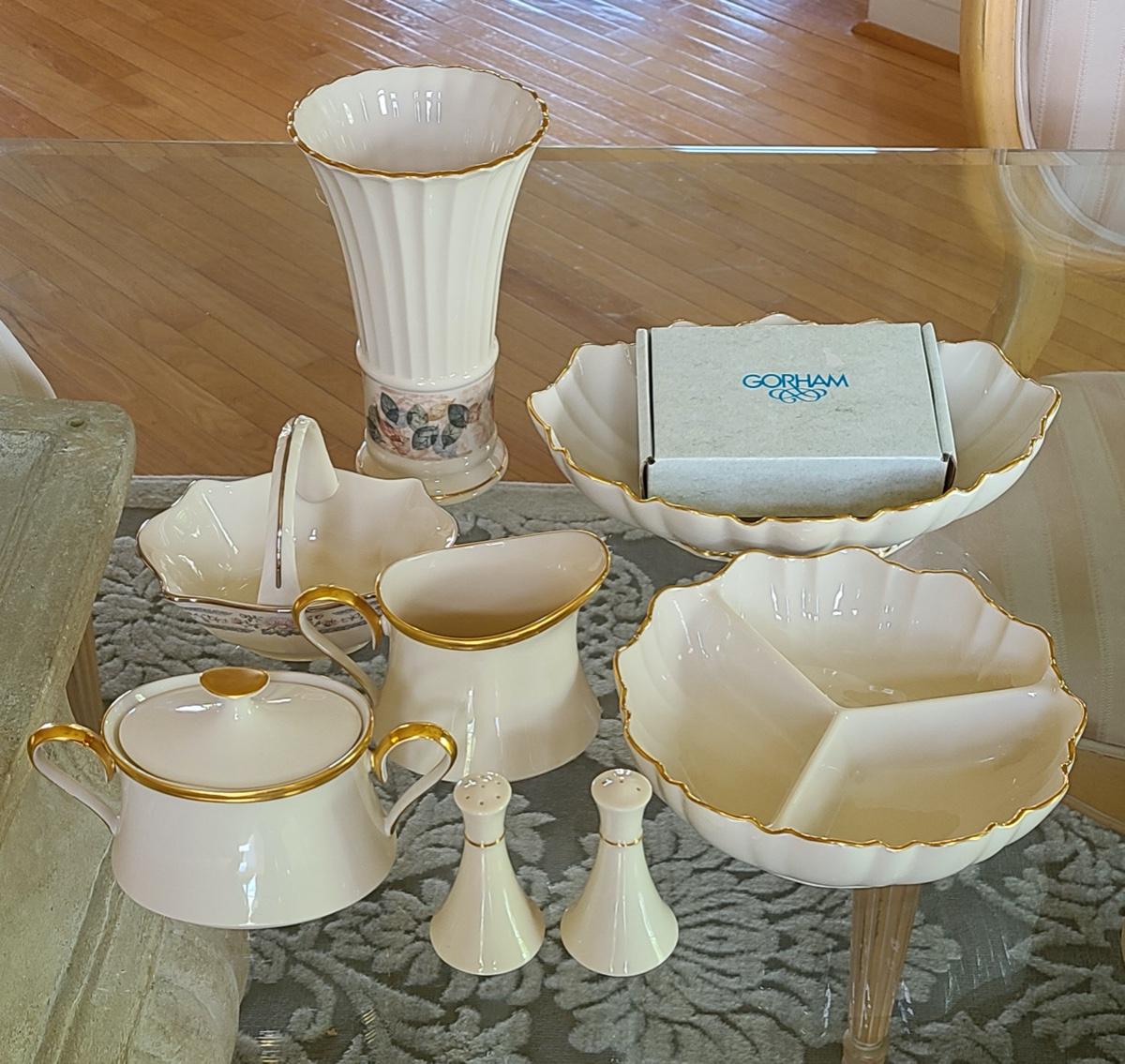 Mixed lot of Lenox serving pieces including gold rimmed sugar and creamer with matching salt/pepper set, divided relish or candy, vases, napkin rings and more. Please see all pictures for content of the lot, condition of the lot, and measurements if taken. Pictures are the best representation of the items listed and items are untested unless indicated in description. Thank you for looking and have fun bidding!