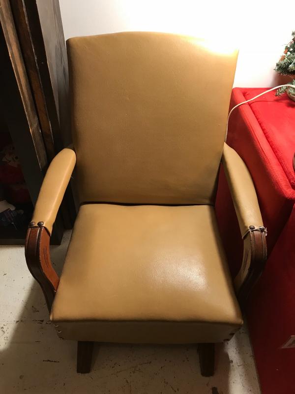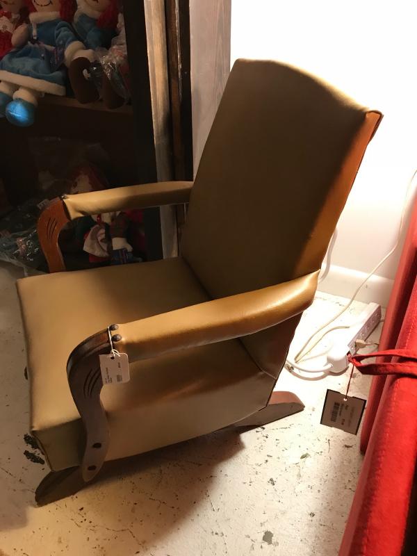 Cute MC child's platform rocking chair. Wood arms and feet. Tan vinyl upholtery. In great condition. 18 1/2" x 20"x 23 1/2" H