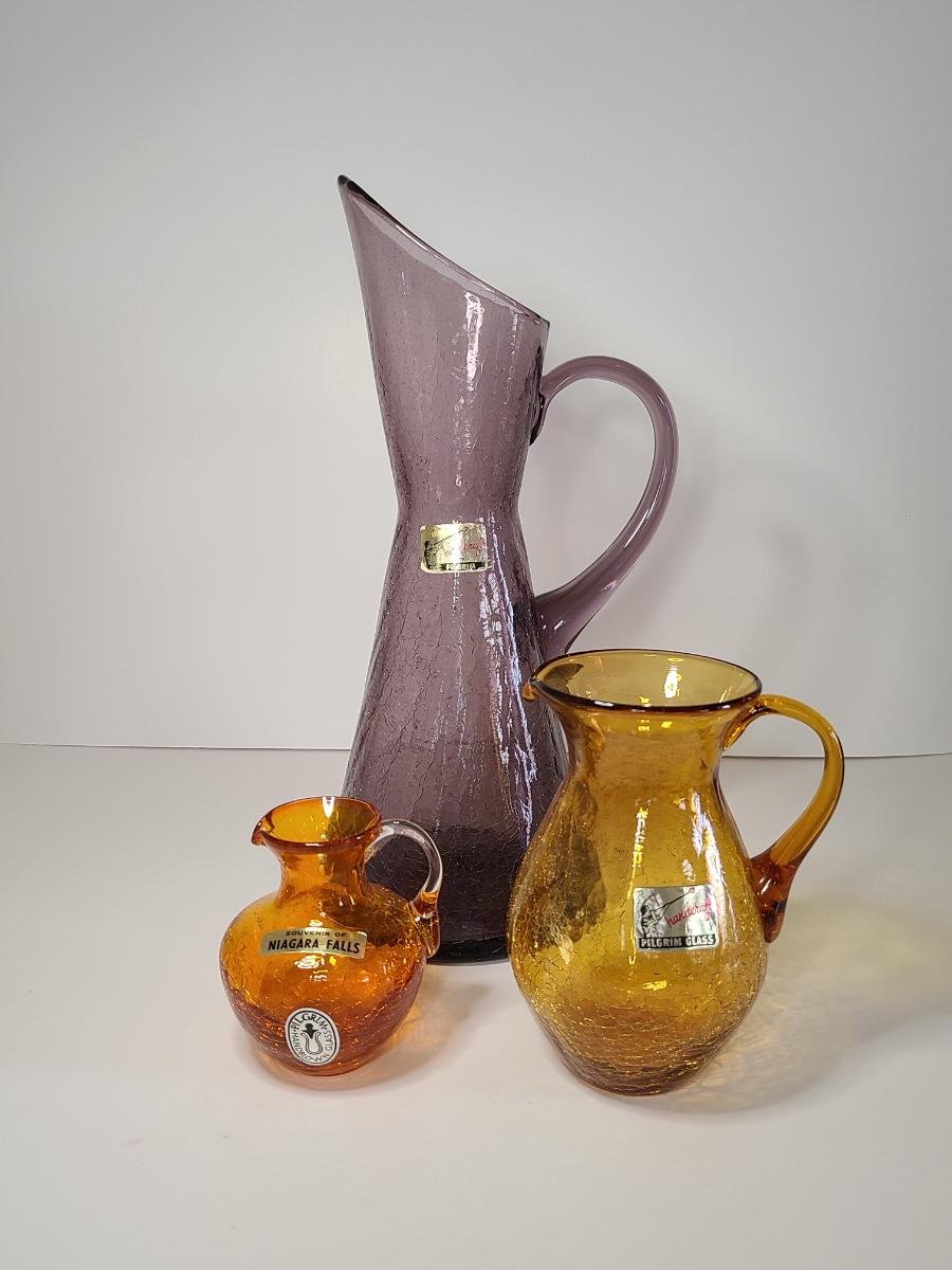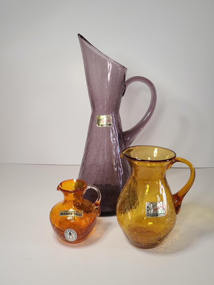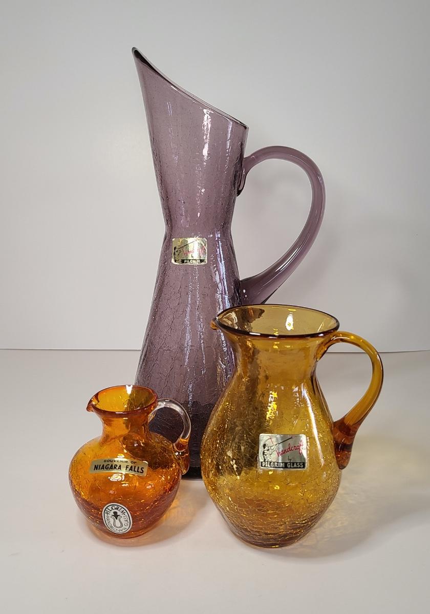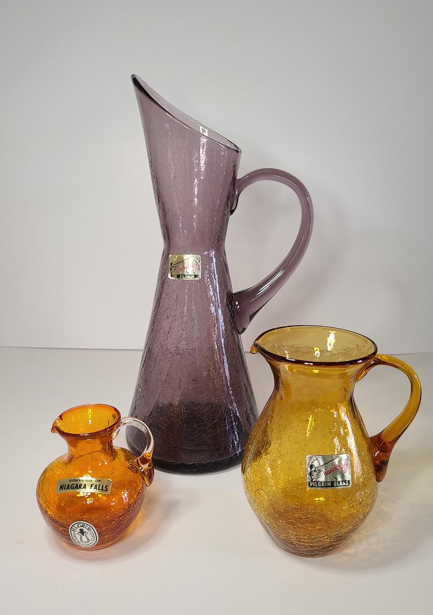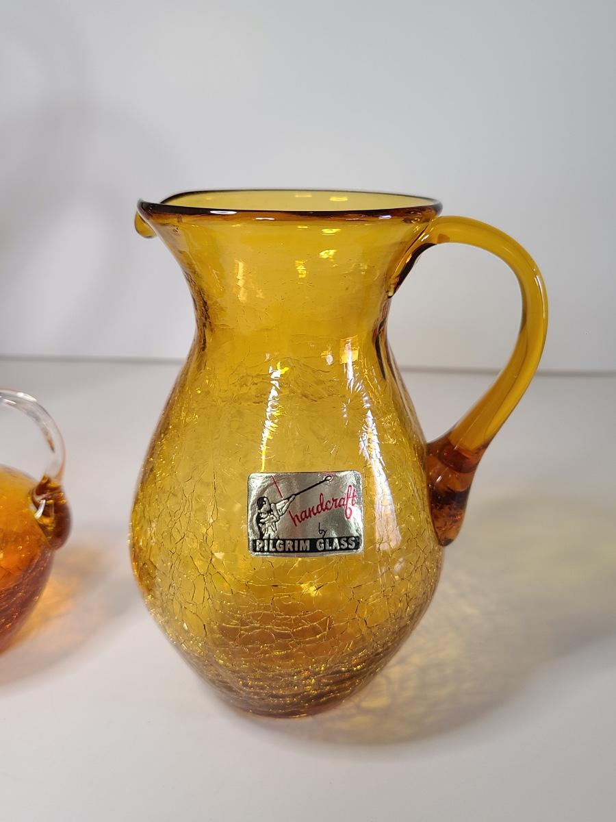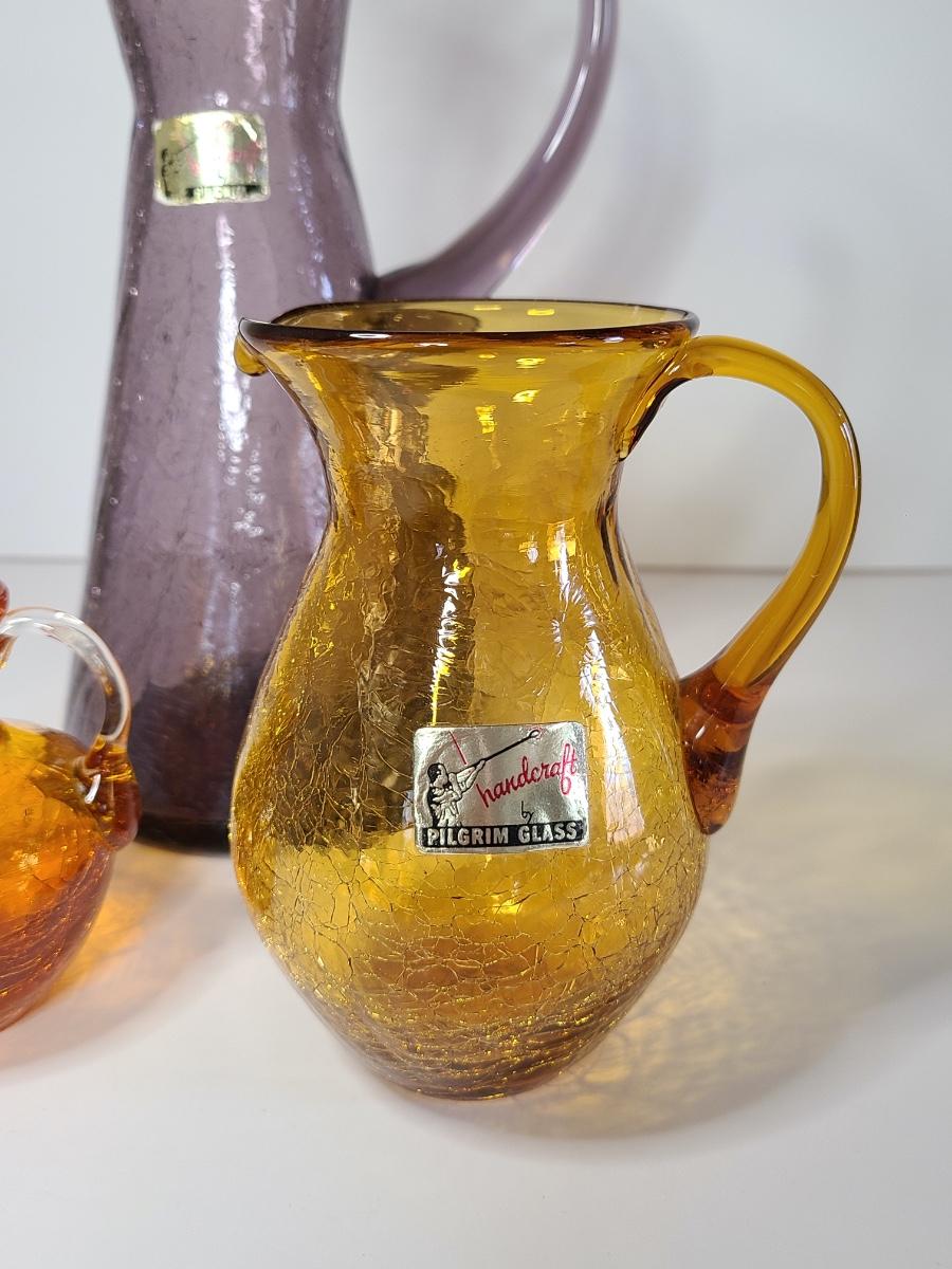 Lot 77: MCM/Vintaged Labeled Pilgrim Crackle Glass Pitcher and More