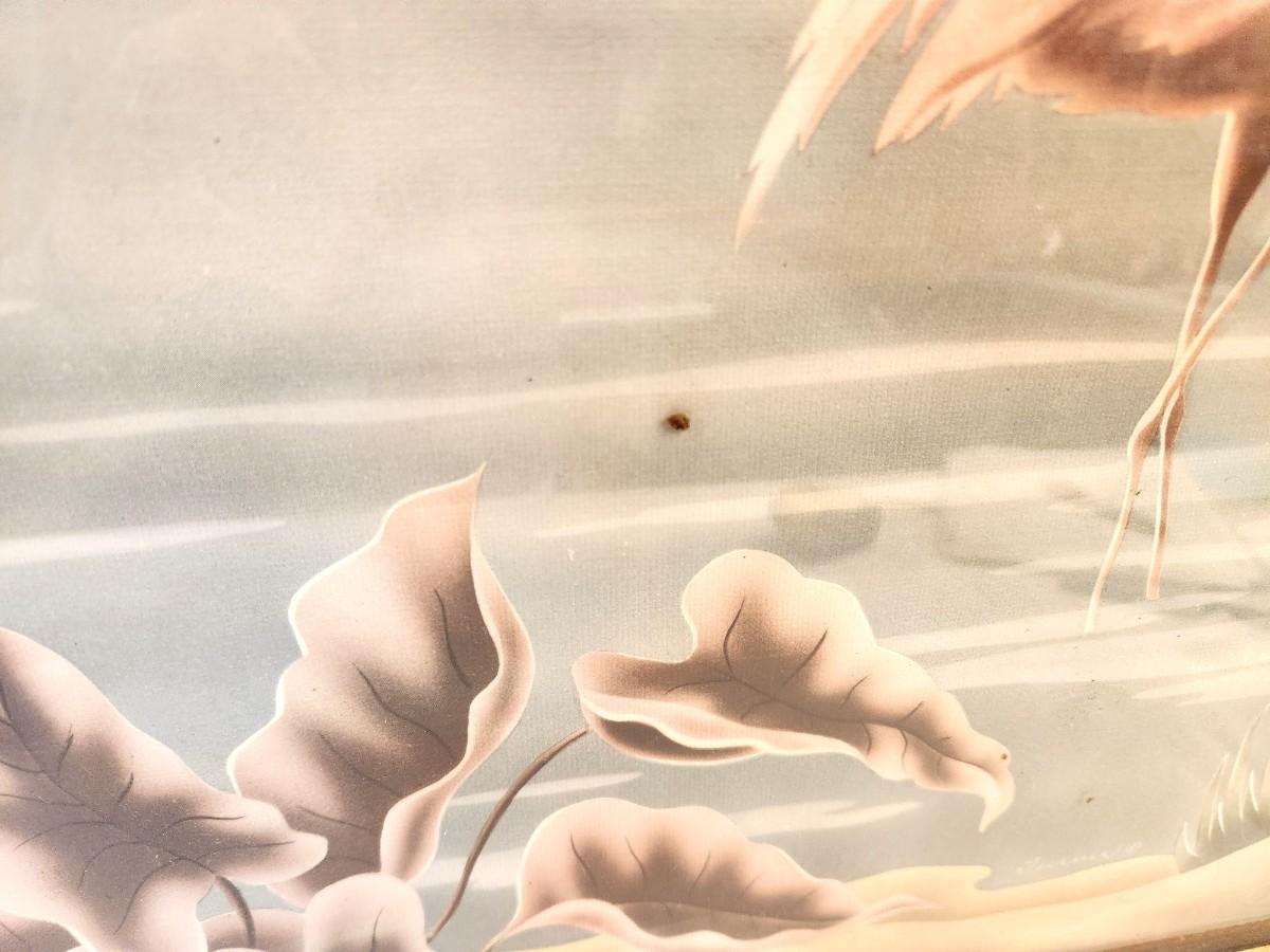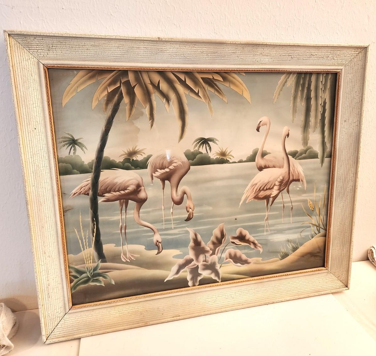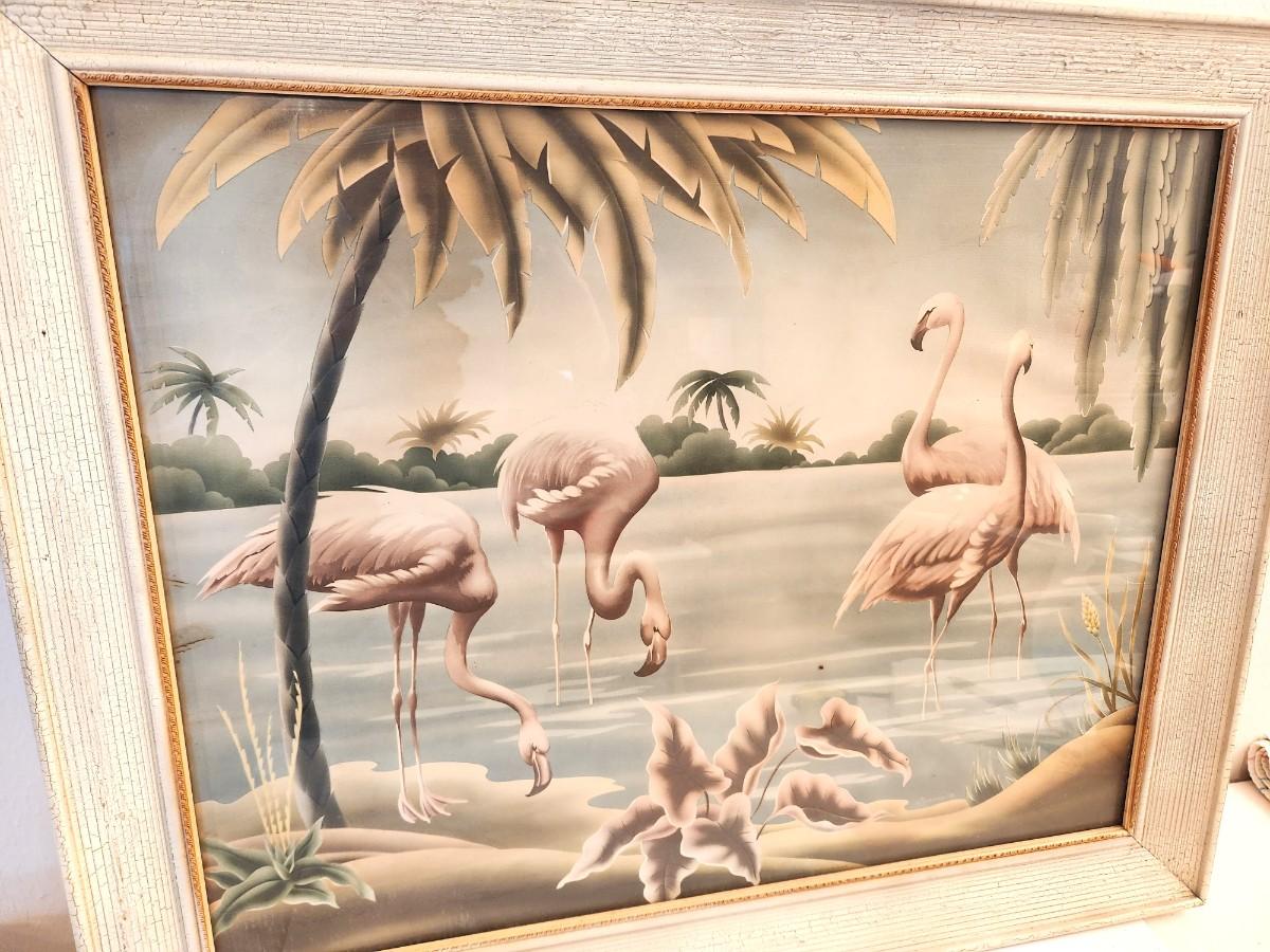 Mid Century Modern Turner Print - Flamingos and Palm Trees - how cool is this? There is a small "critter" caught beneath the glass (as shown). No signature. 32.35" across, 26.5" tall. 1950's.