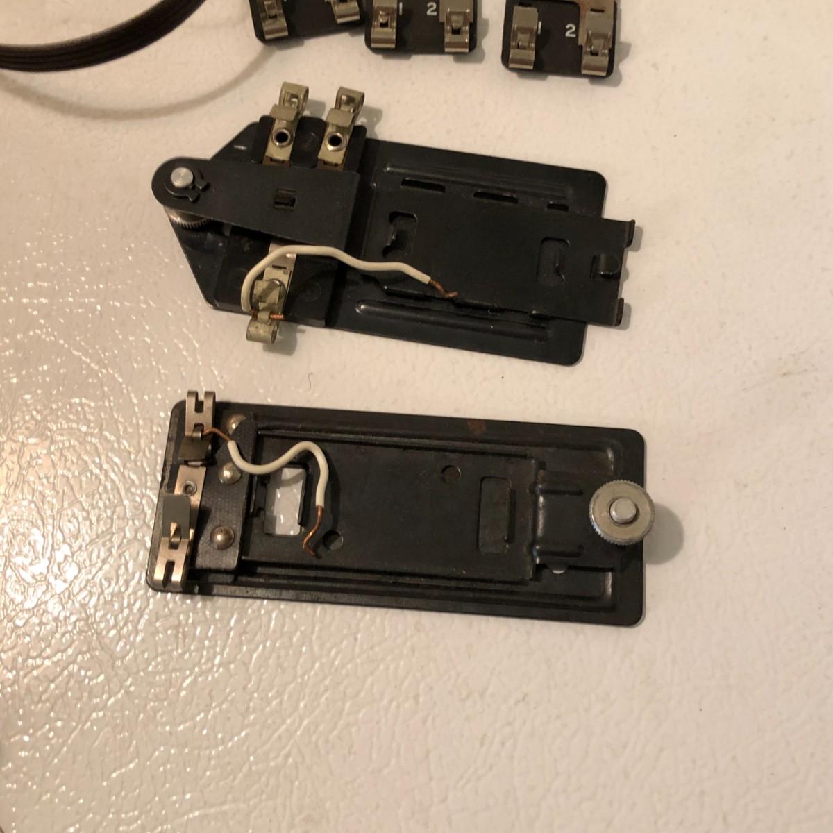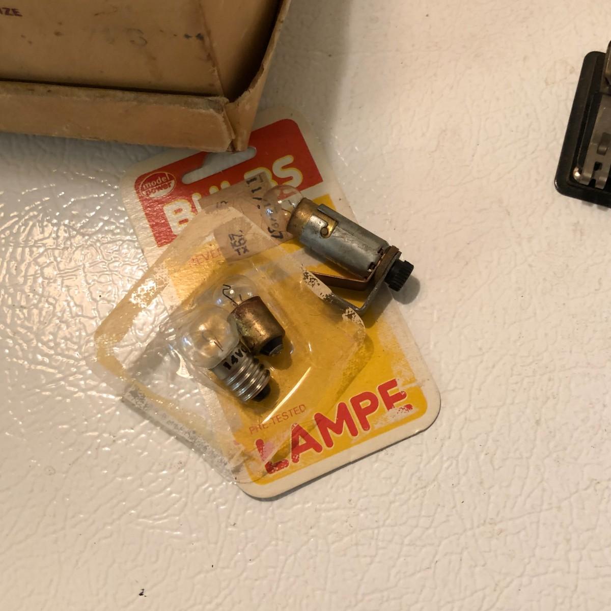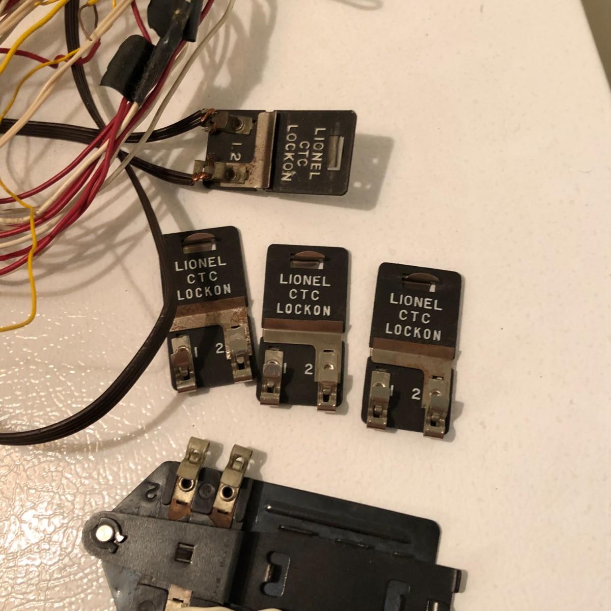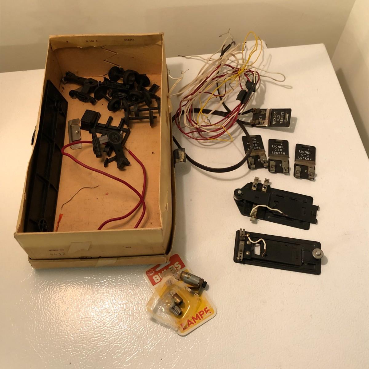 There are (3) lockon plates for O and O27 tubular steel track, a 145C automatic accessories connector, a 153C automatic accessories connector, wire, lightbulbs, and other pieces.