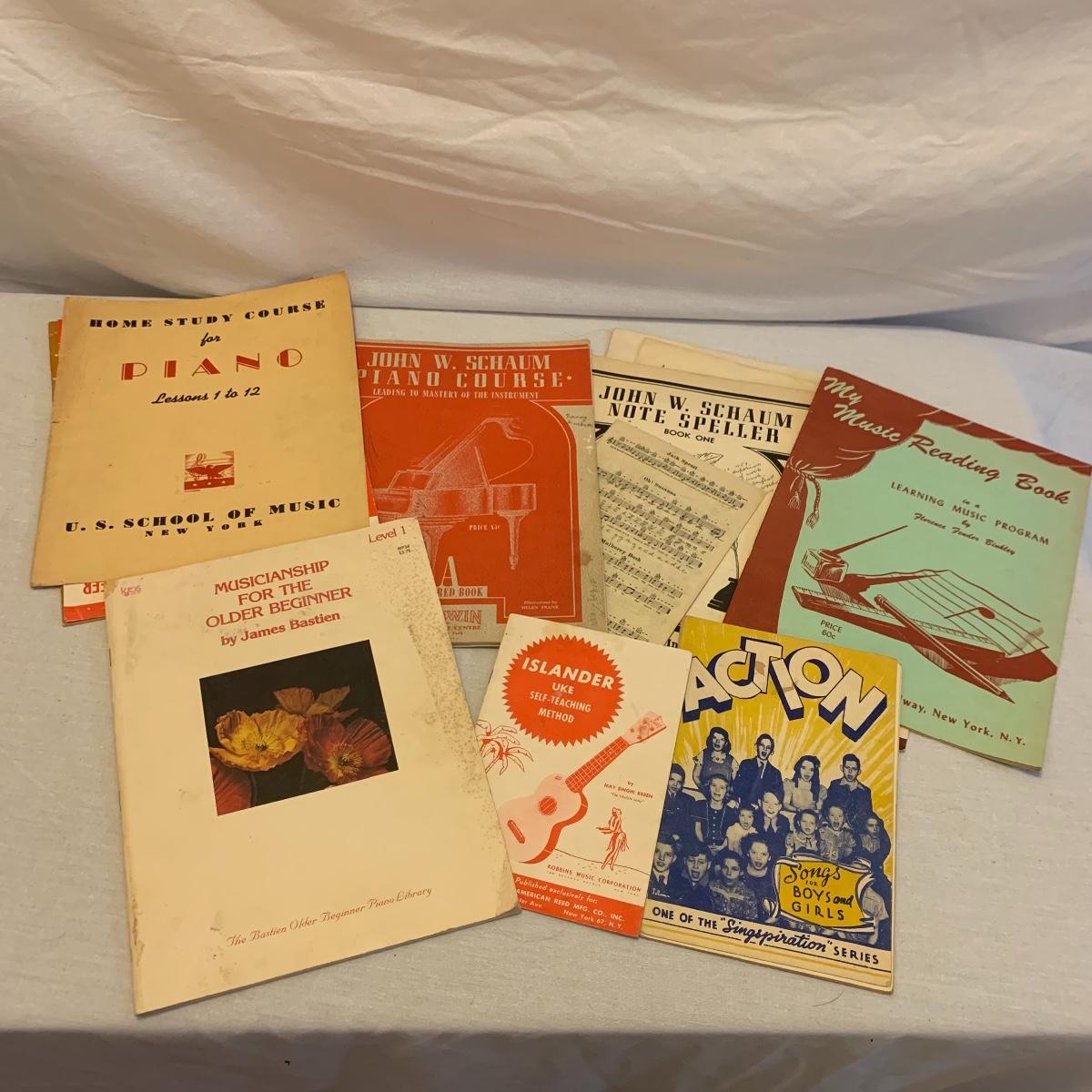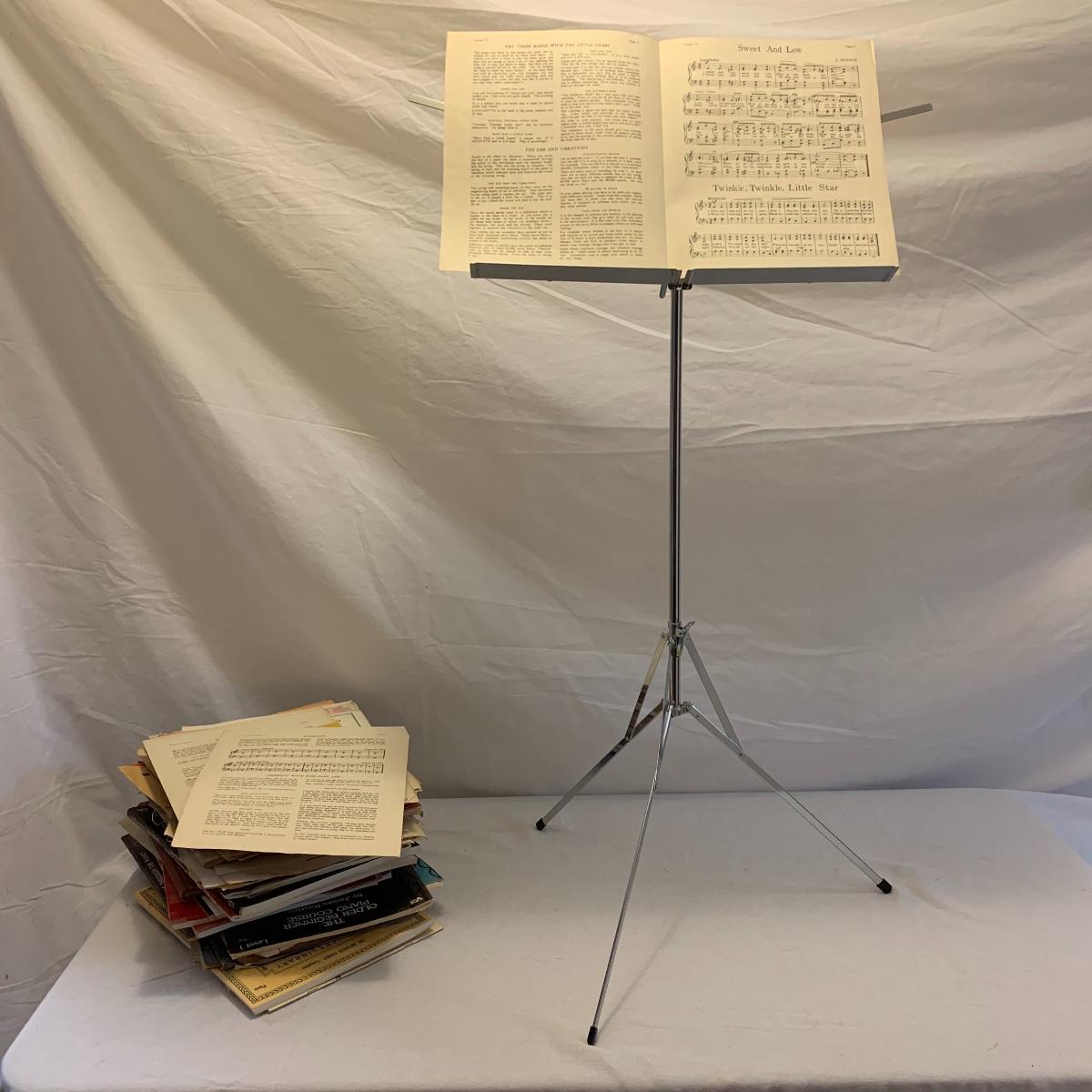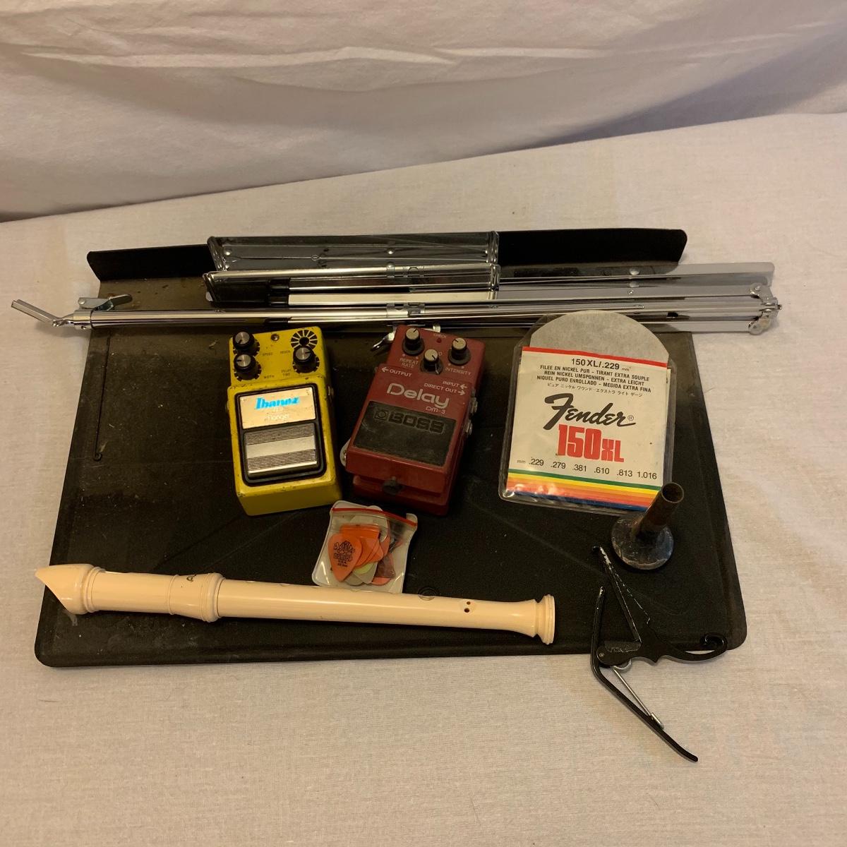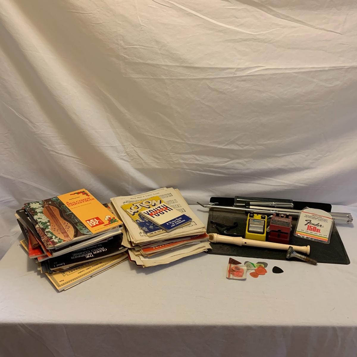 This lot is for the music lover in your life! It consists of many music books and sheet music. There is music for ukeleles, dulcimers, pianos, and more. There is a lot of loose sheet music. Some books might be missing pages. Also included is a nice Hamilton music stand, some fender guitar strings, a Boss Delay pedal, an Ibanez Flanger (missing one knob), a capo, a recorder, a mouthpiece for a trumpet, and a handful of picks. Shipping available.