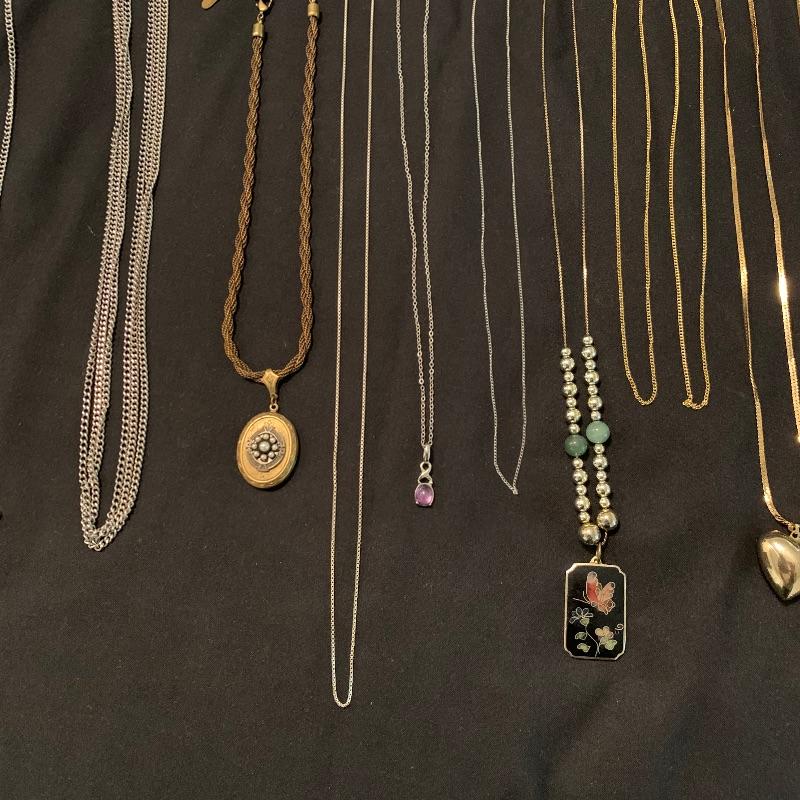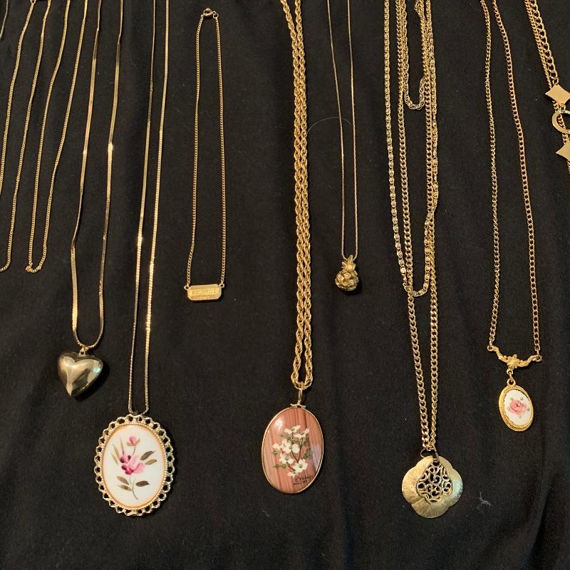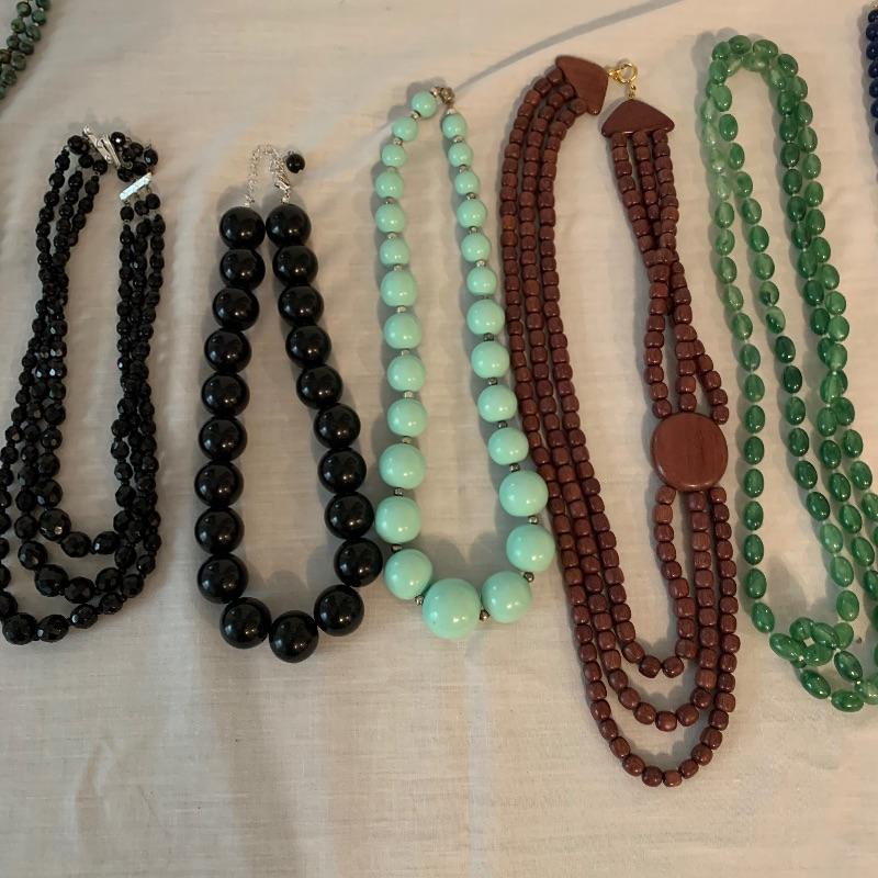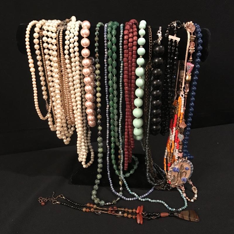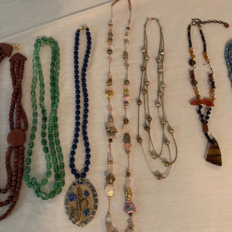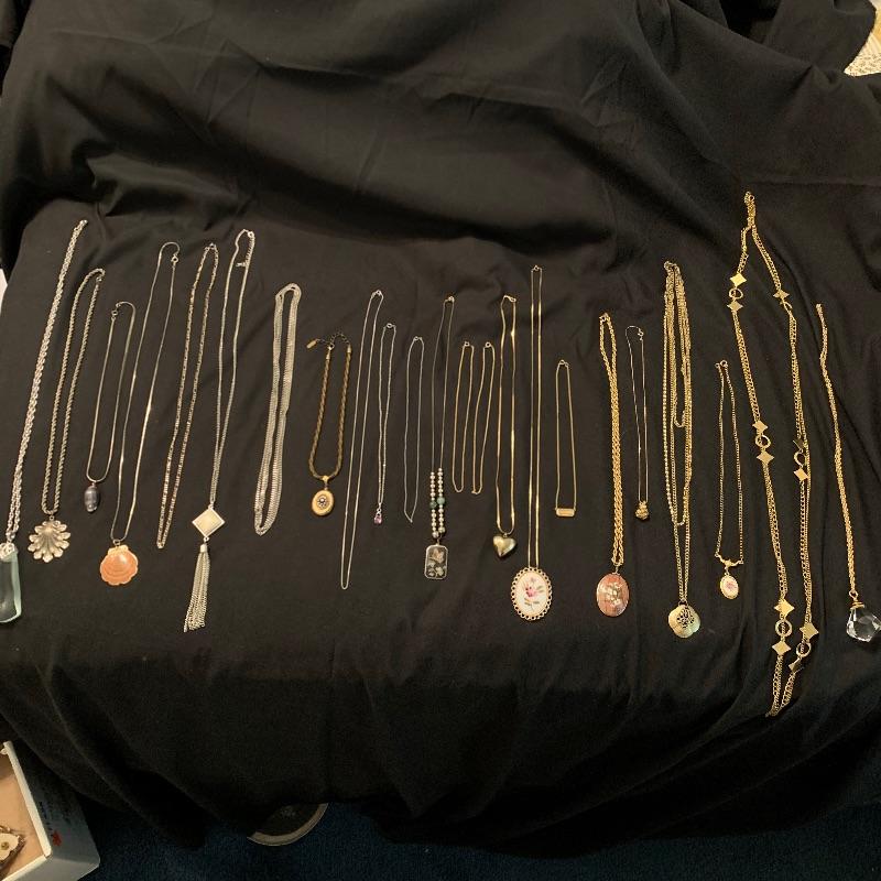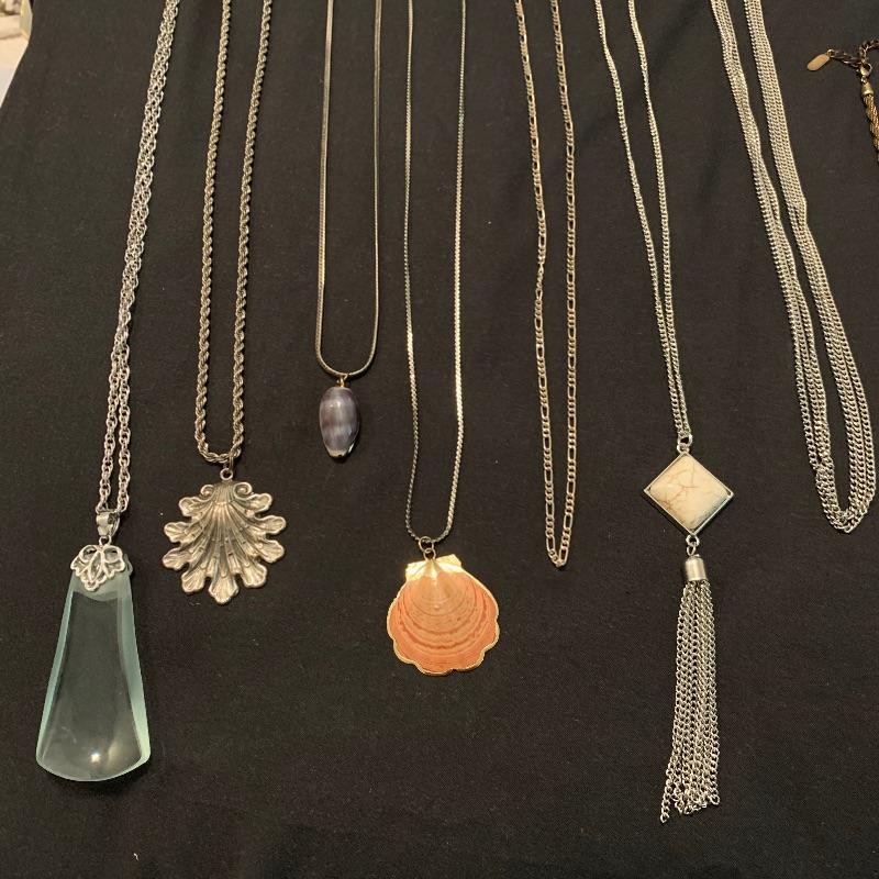 Twenty-four + chain necklaces in silver and gold tones with some pendants. A lovely Clara Beau locket and two gold rimmed shell pendants. Several pearl necklaces that is a mix of faux and vintage styles in different lengths. And finally some nice costume beaded, ceramic, stone necklaces in all length and sizes. Shipping available.