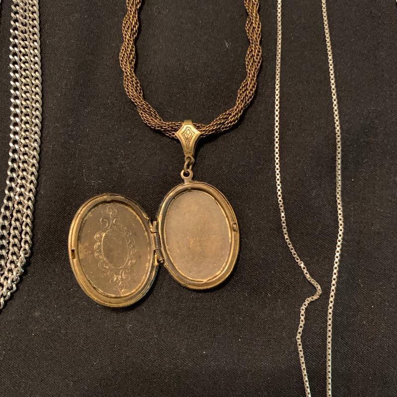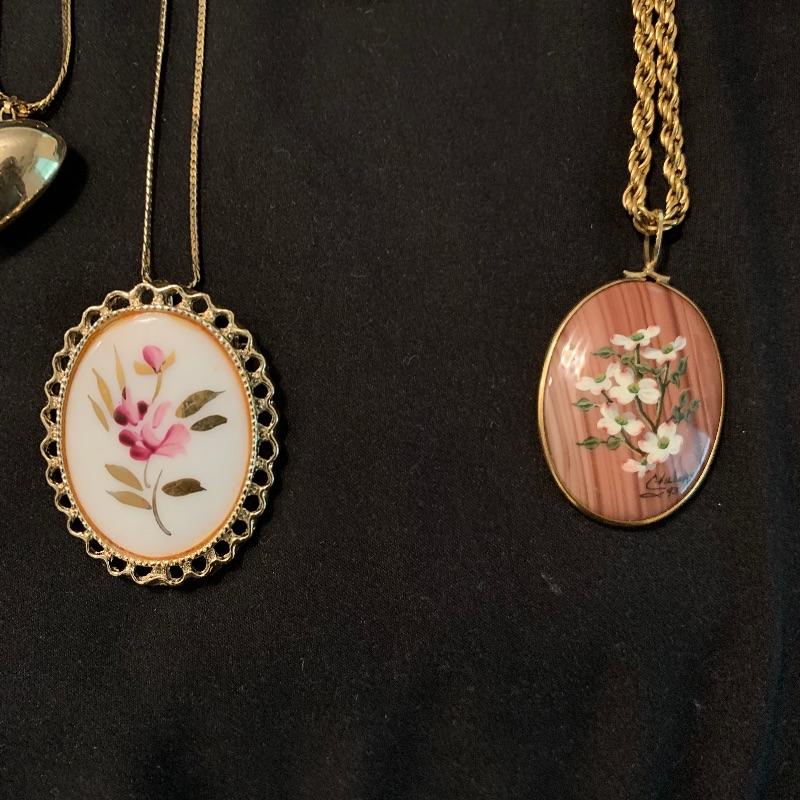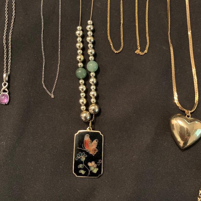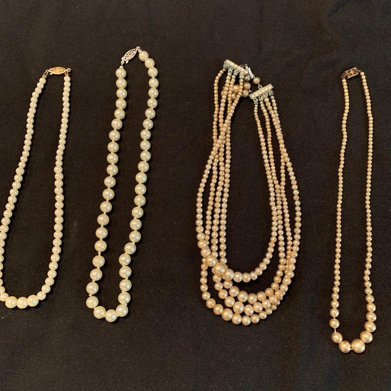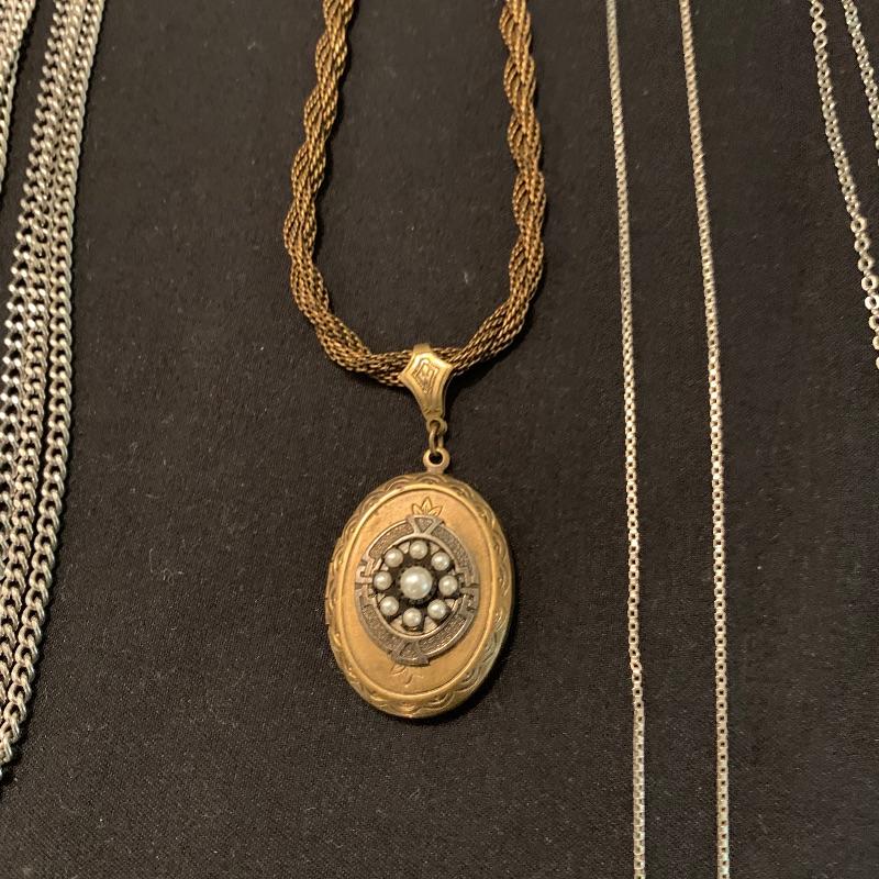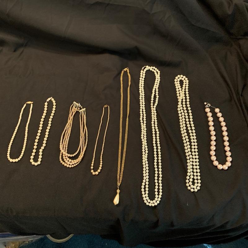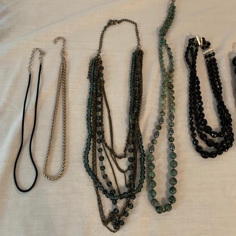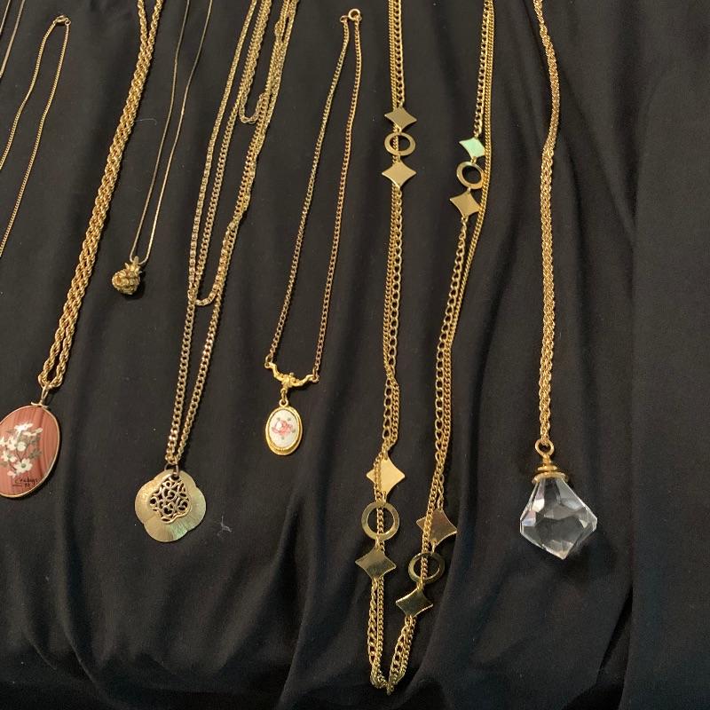 Twenty-four + chain necklaces in silver and gold tones with some pendants. A lovely Clara Beau locket and two gold rimmed shell pendants. Several pearl necklaces that is a mix of faux and vintage styles in different lengths. And finally some nice costume beaded, ceramic, stone necklaces in all length and sizes. Shipping available.