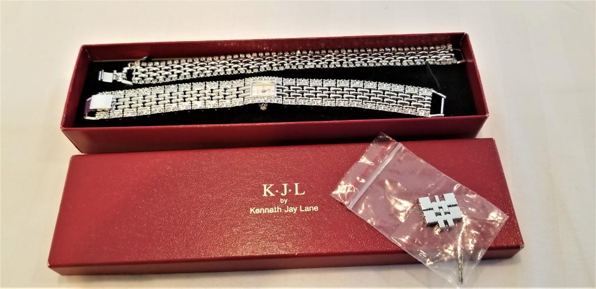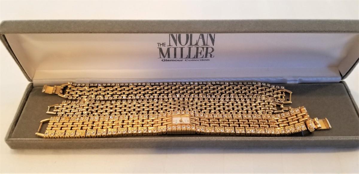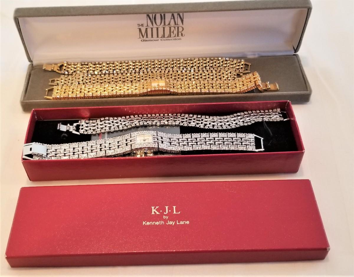 This Nolan Miller watch/bracelet set and Kenneth J Lane Watch/bracelet set is in the original box and never used. Both need a battery. KJL is silver tone and set with rhinestones - matching bracelet. Comes with extra links. Nolan Miller Glamour Collection set is very flashy, gold tone and comes with two matching bracelets.