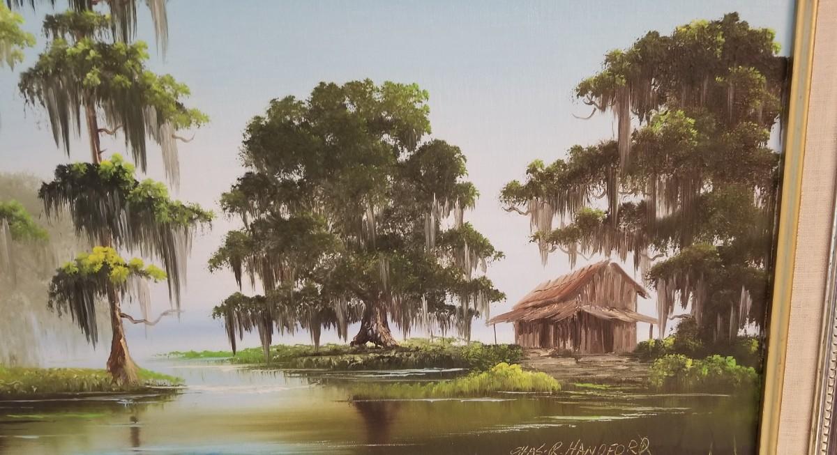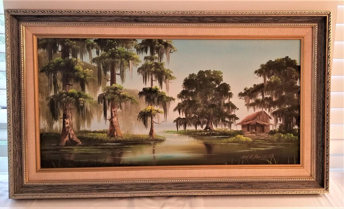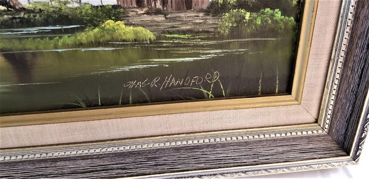 This great oil on canvas is done by Listed Artist Charles R. Hanford (died 1995). Hanford is known for his swamp scenes and his works have sold at many of the local auction galleries. This one measures 28" x 16" and is in good condition.