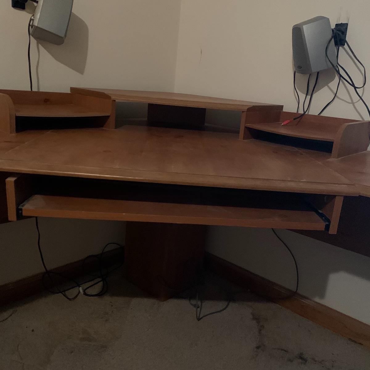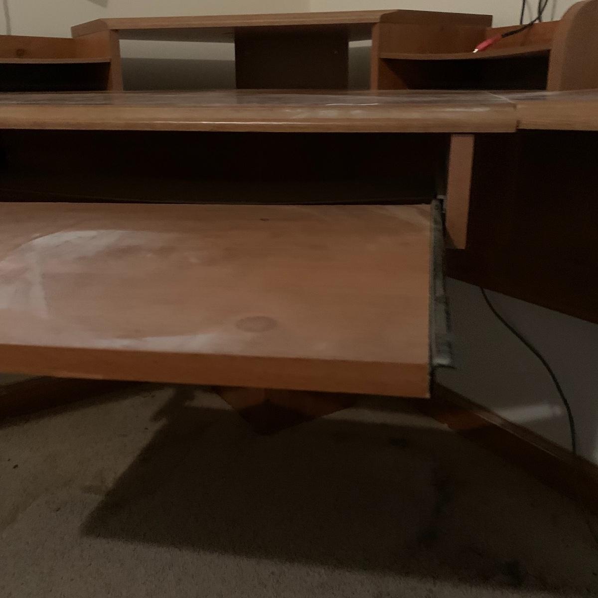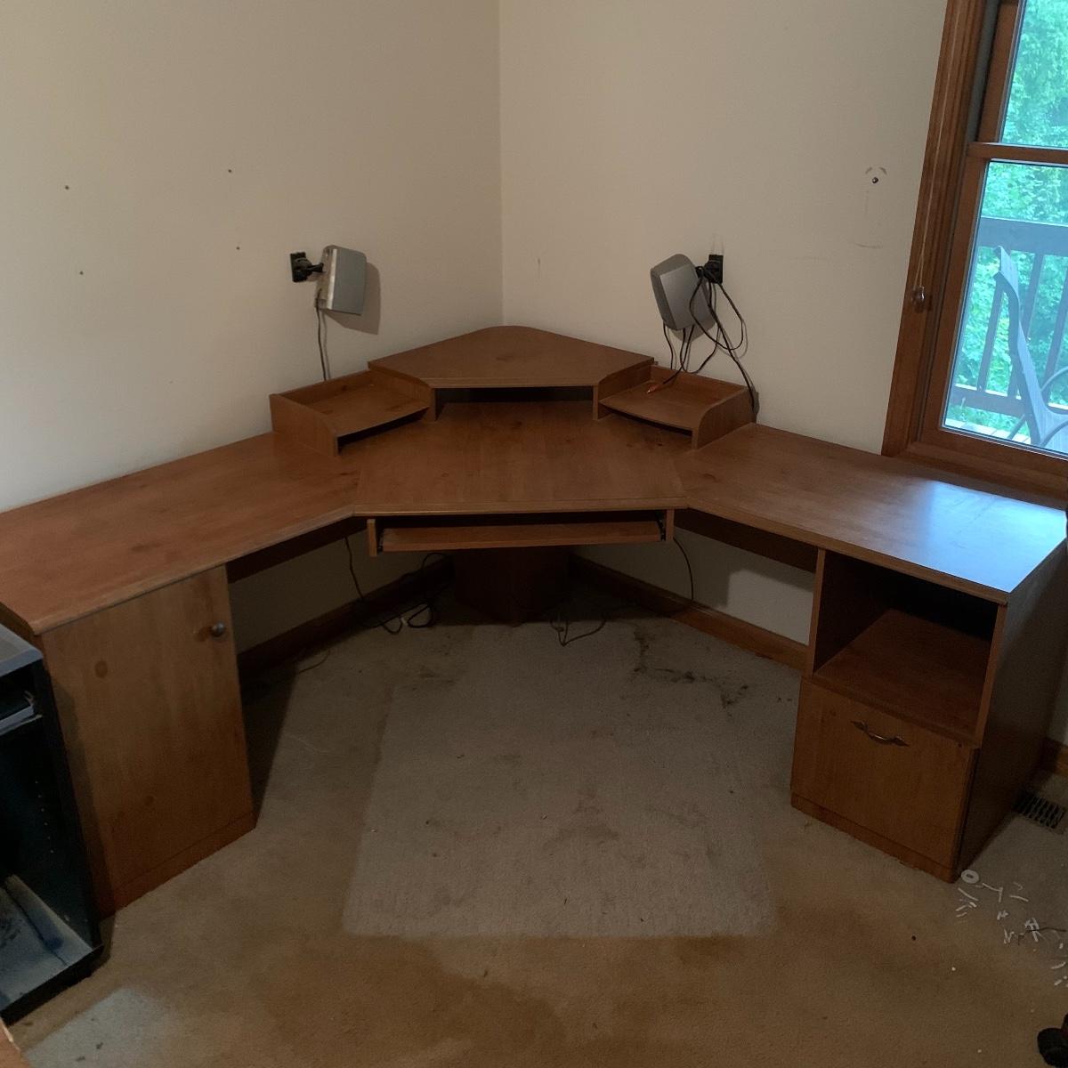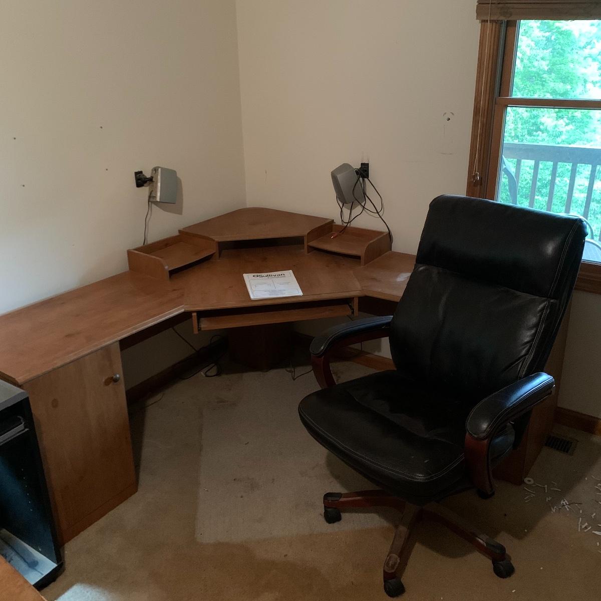 This lot is made for the home office guru! It has plenty of top work space and cabinet on the left and shelf with file drawer on the right. The key board tray is loose but not broken and though this is pressed wood and will need some disassembly for transport but the directions are with it so should be straight forward. Desk measures 68.5” from each end to corner and 20” deep on both sides and stands 28” tall with the back shelves it’s another 5” taller. The leather and wood office chair is adjustable up and down and is in good condition except two legs have scuff plates missing. Rolls nicely and is very roomy measuring 30” x34” x41”. Speakers in pix not included, check lot 73. Local pick up only. Bring help to load and disassemble.