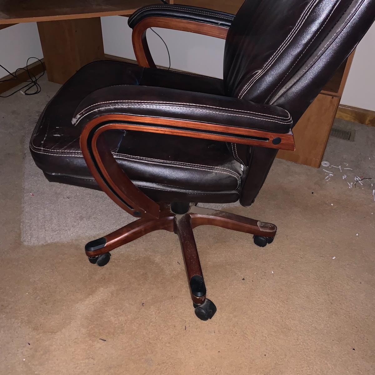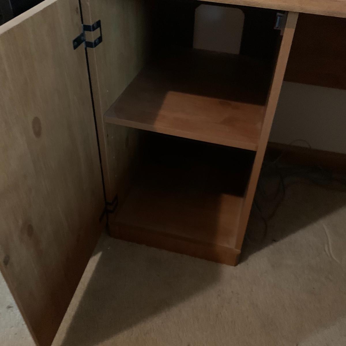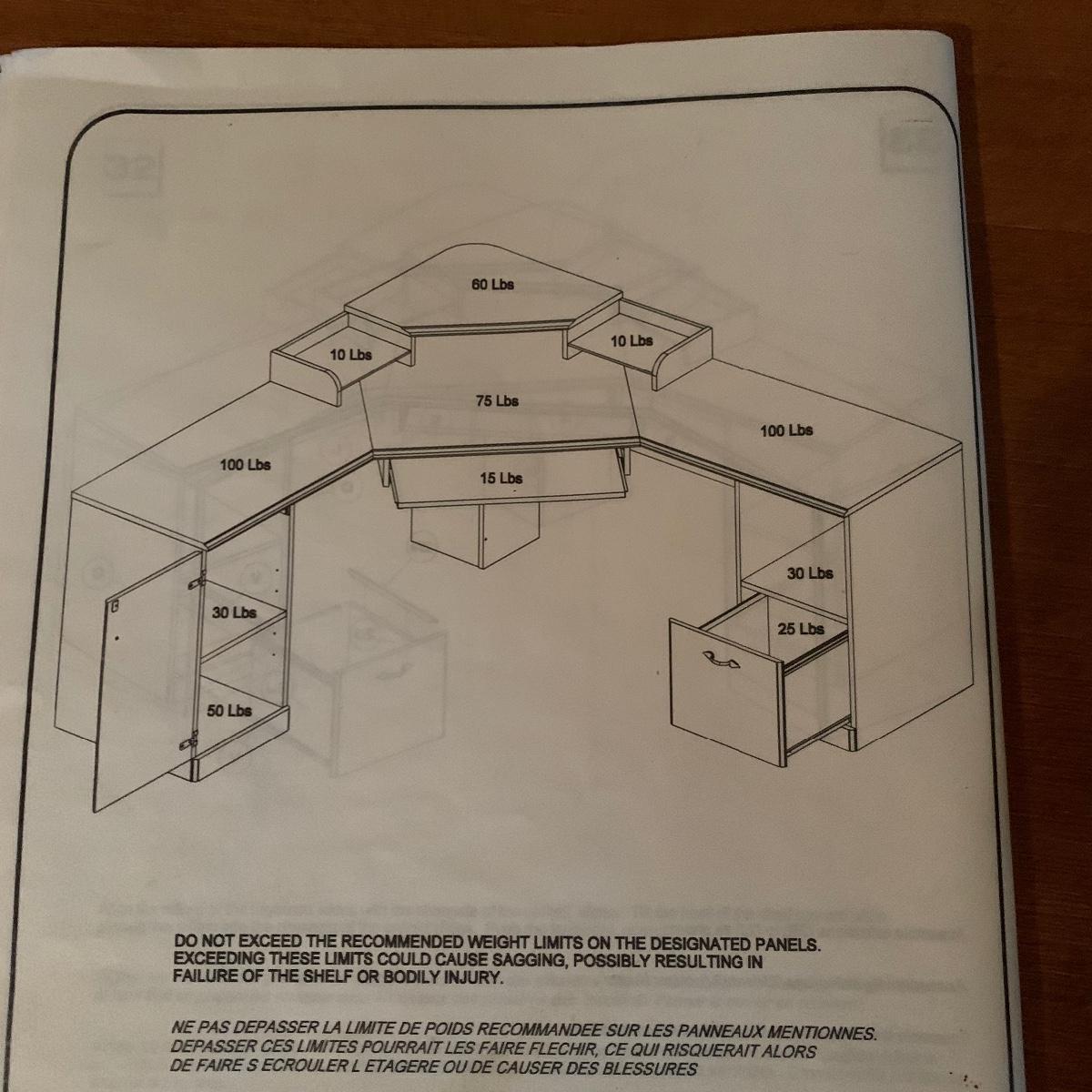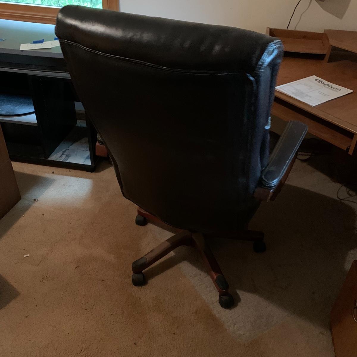This lot is made for the home office guru! It has plenty of top work space and cabinet on the left and shelf with file drawer on the right. The key board tray is loose but not broken and though this is pressed wood and will need some disassembly for transport but the directions are with it so should be straight forward. Desk measures 68.5” from each end to corner and 20” deep on both sides and stands 28” tall with the back shelves it’s another 5” taller. The leather and wood office chair is adjustable up and down and is in good condition except two legs have scuff plates missing. Rolls nicely and is very roomy measuring 30” x34” x41”. Speakers in pix not included, check lot 73. Local pick up only. Bring help to load and disassemble.