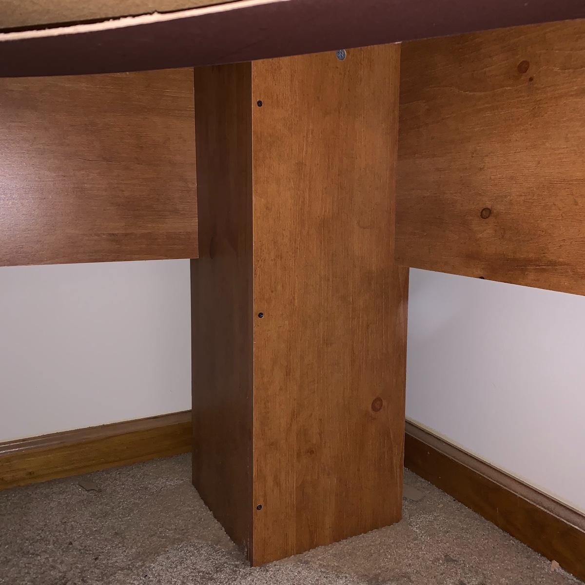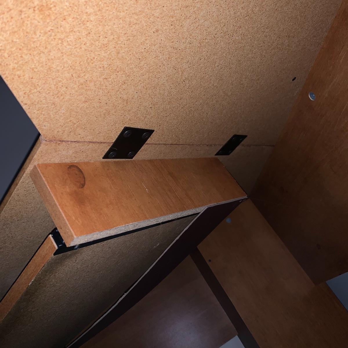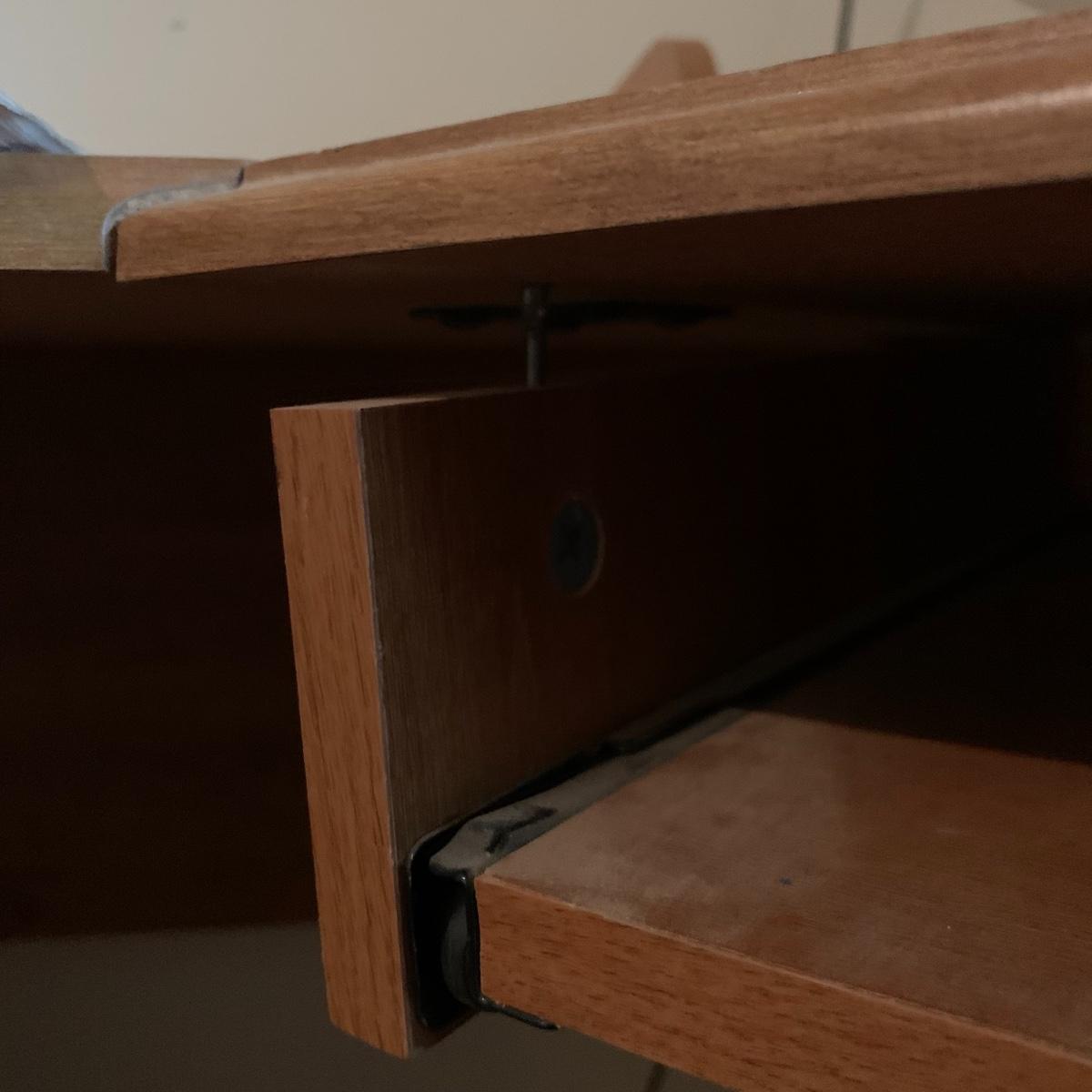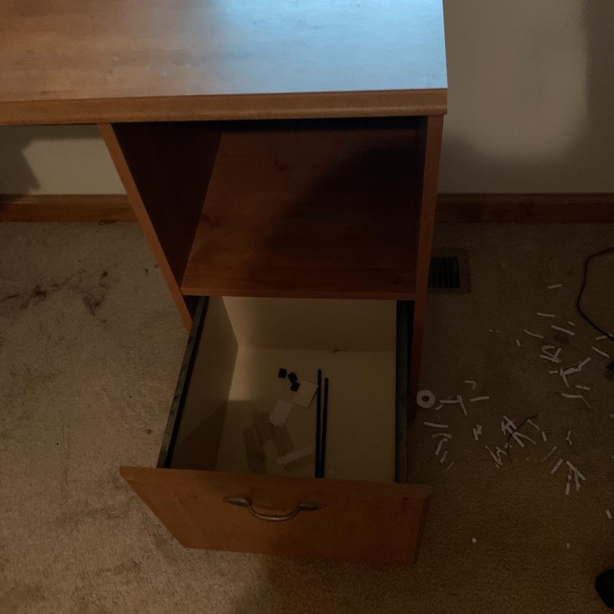This lot is made for the home office guru! It has plenty of top work space and cabinet on the left and shelf with file drawer on the right. The key board tray is loose but not broken and though this is pressed wood and will need some disassembly for transport but the directions are with it so should be straight forward. Desk measures 68.5” from each end to corner and 20” deep on both sides and stands 28” tall with the back shelves it’s another 5” taller. The leather and wood office chair is adjustable up and down and is in good condition except two legs have scuff plates missing. Rolls nicely and is very roomy measuring 30” x34” x41”. Speakers in pix not included, check lot 73. Local pick up only. Bring help to load and disassemble.