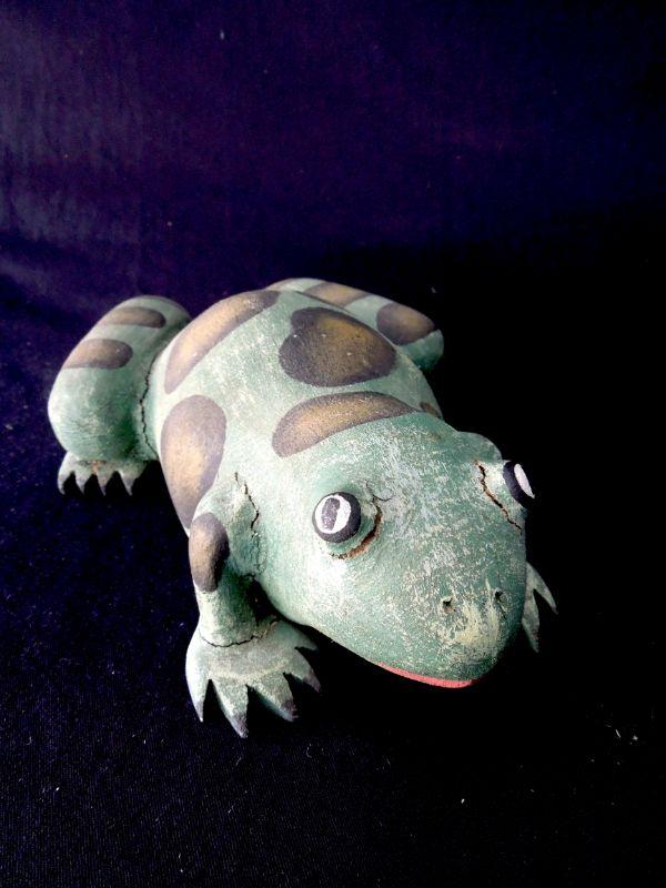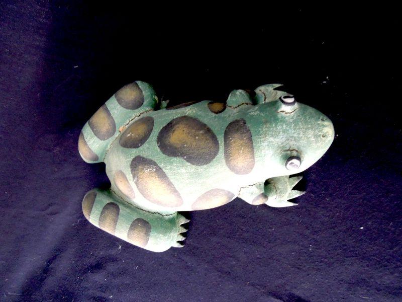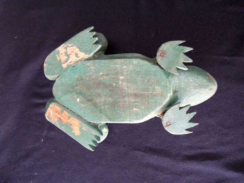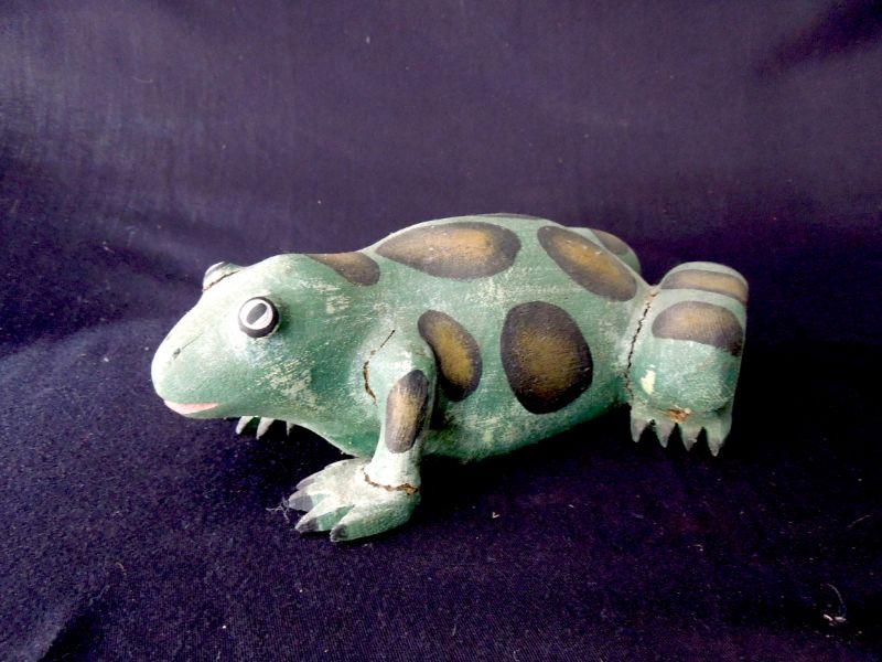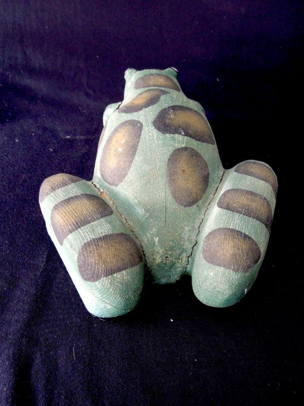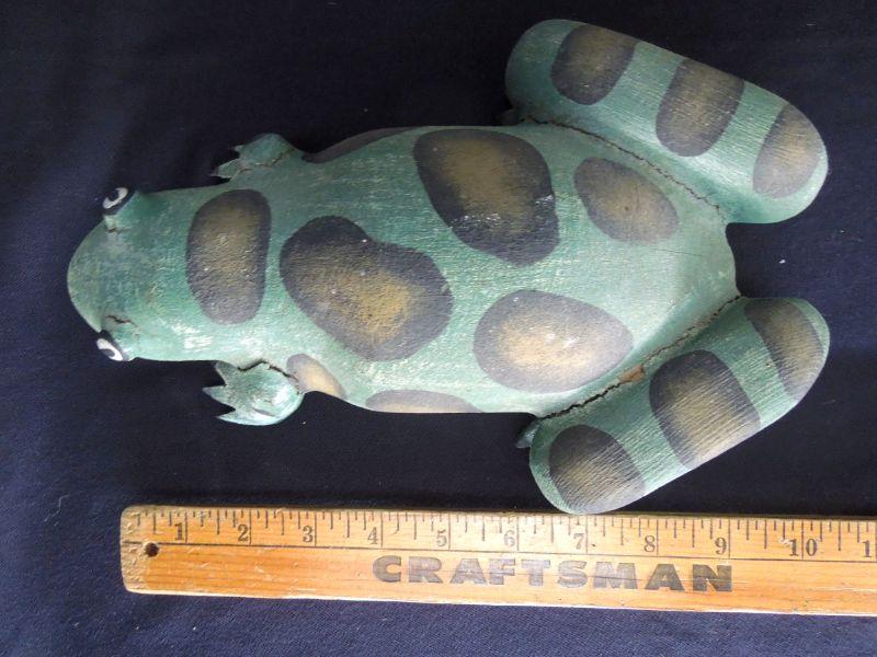Painted wood frog or toad. Origin unknown. Has some cracks, but still intact. 10.5" long.