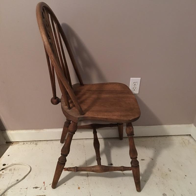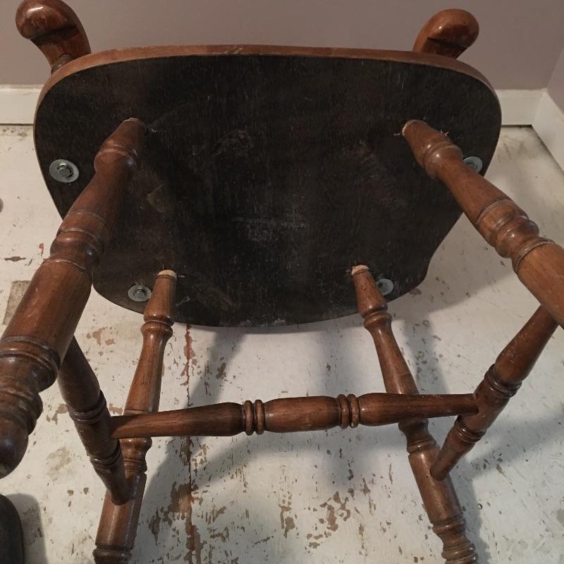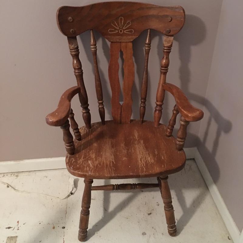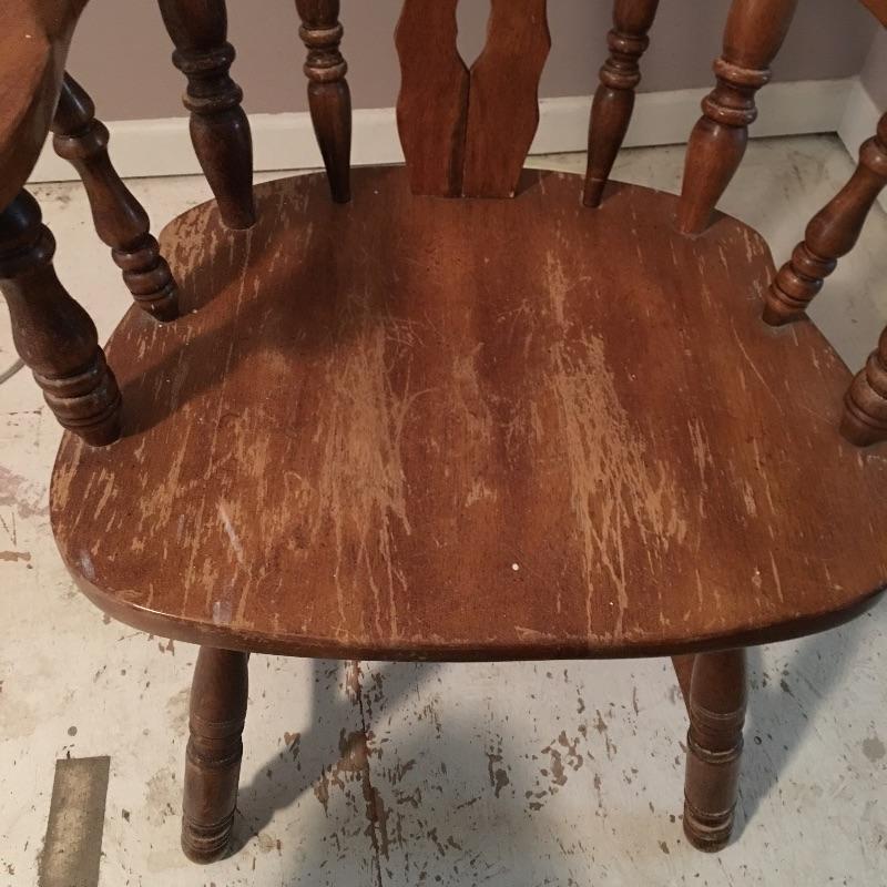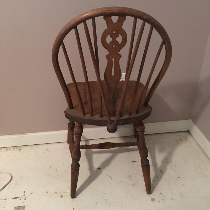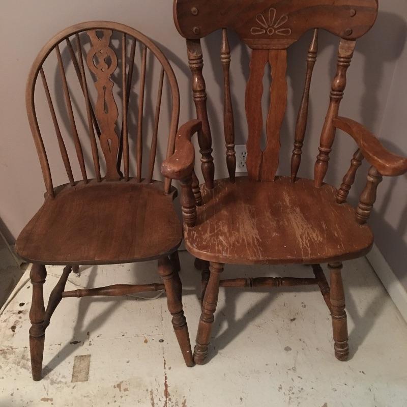 Two wooden chairs. Smaller chair has one broken dowel on back - see pictures. Larger chair is worn on seat. Smaller chair measures 18.5” x 18.5” x 36”. Seat height 17.5”.