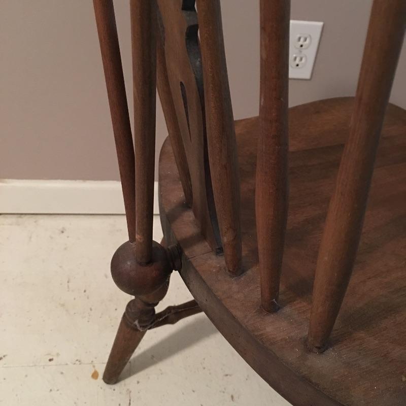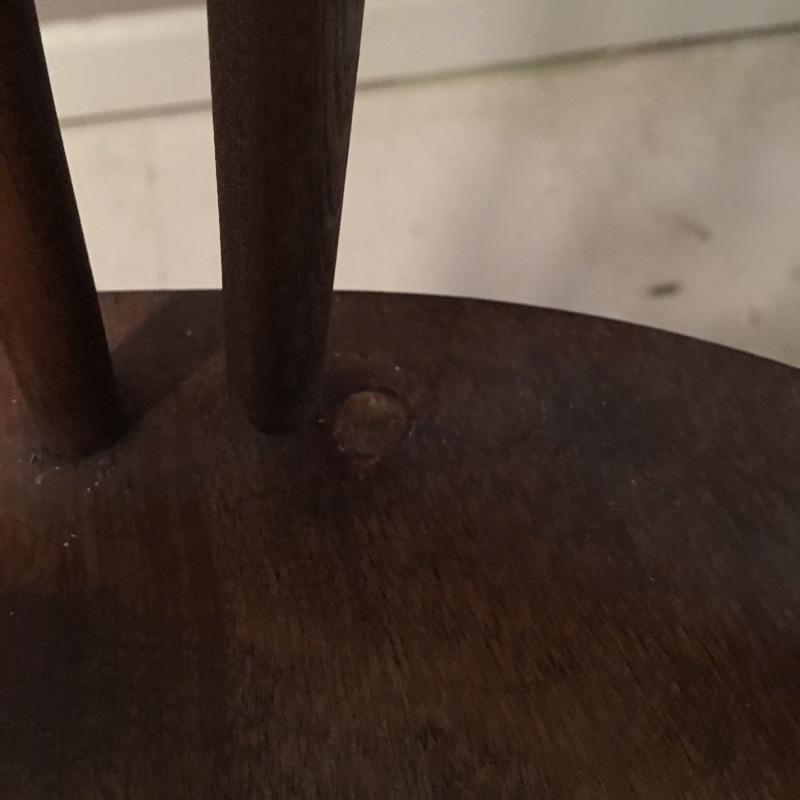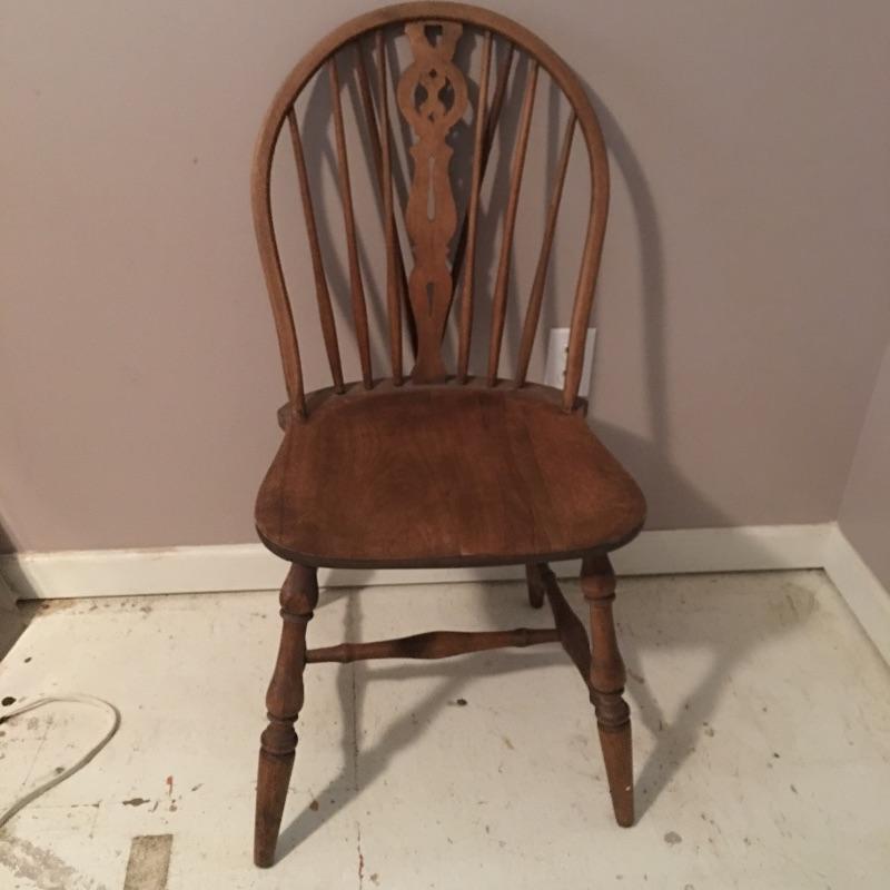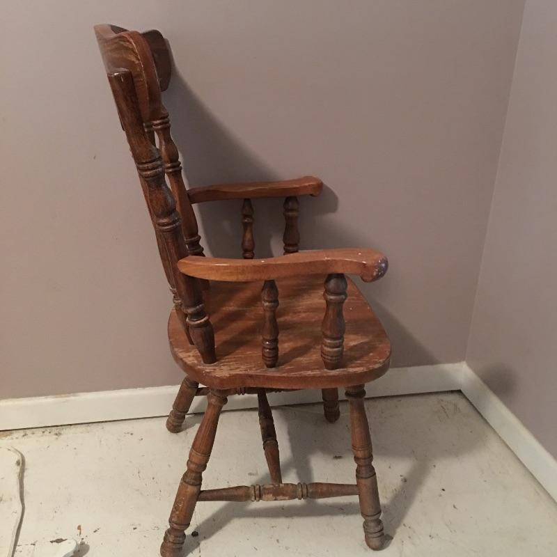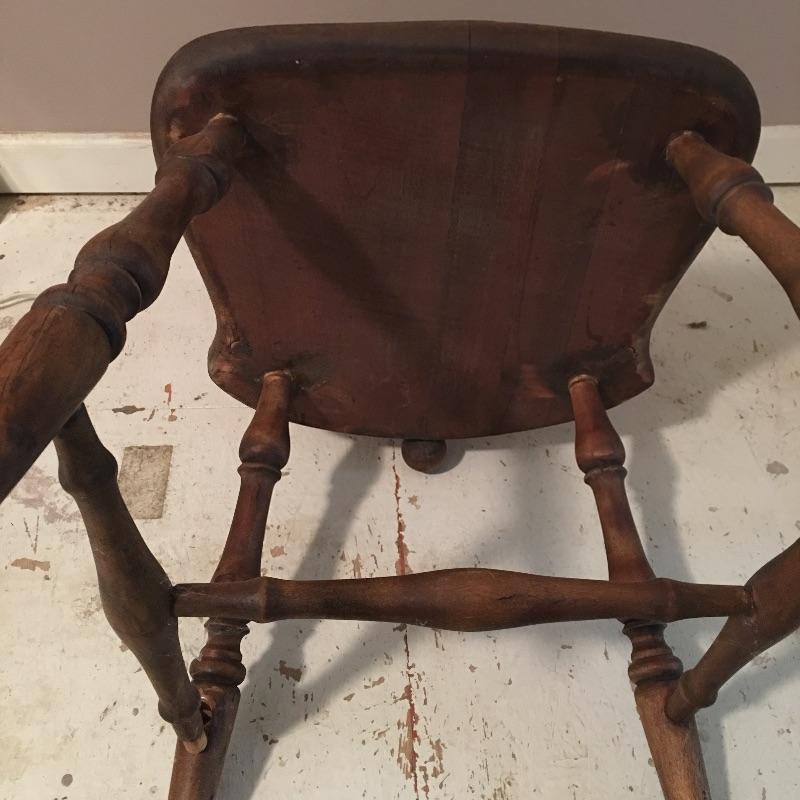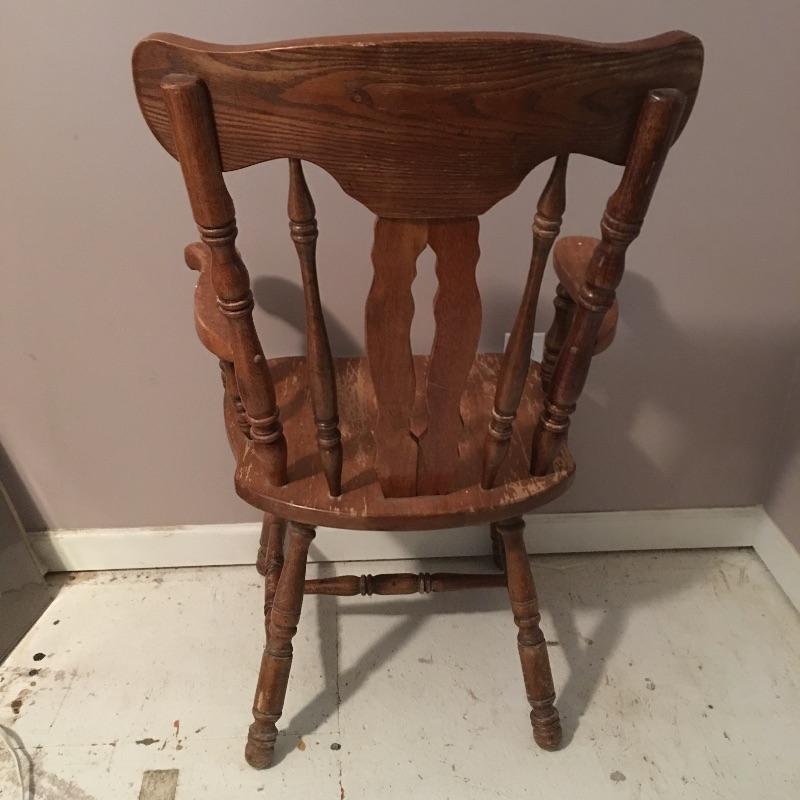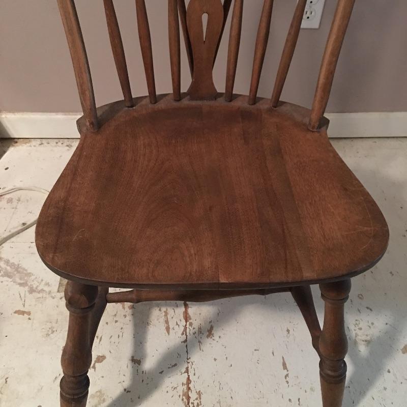 Two wooden chairs. Smaller chair has one broken dowel on back - see pictures. Larger chair is worn on seat. Smaller chair measures 18.5” x 18.5” x 36”. Seat height 17.5”.
