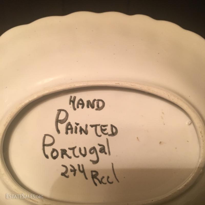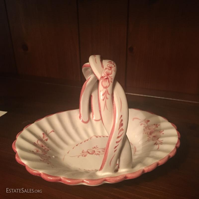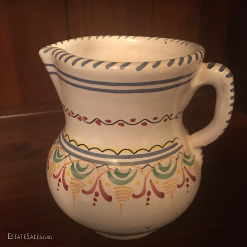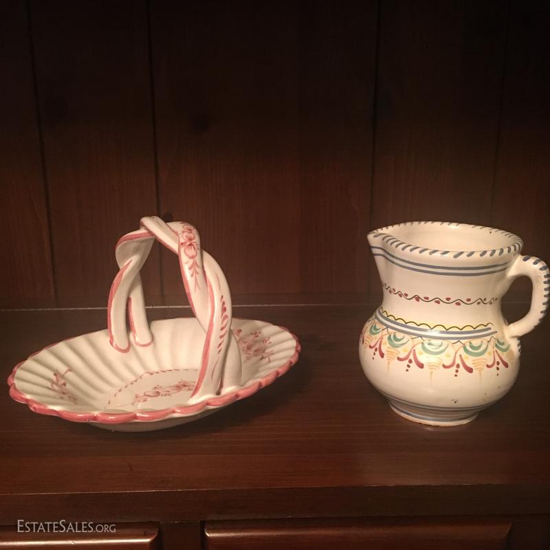 Portuguese ceramic basket, hand painted, measuring 5" x 7". Spanish pottery pitcher stands 4.5" tall. This lot is available for shipping or local pick up in Asheville, NC.