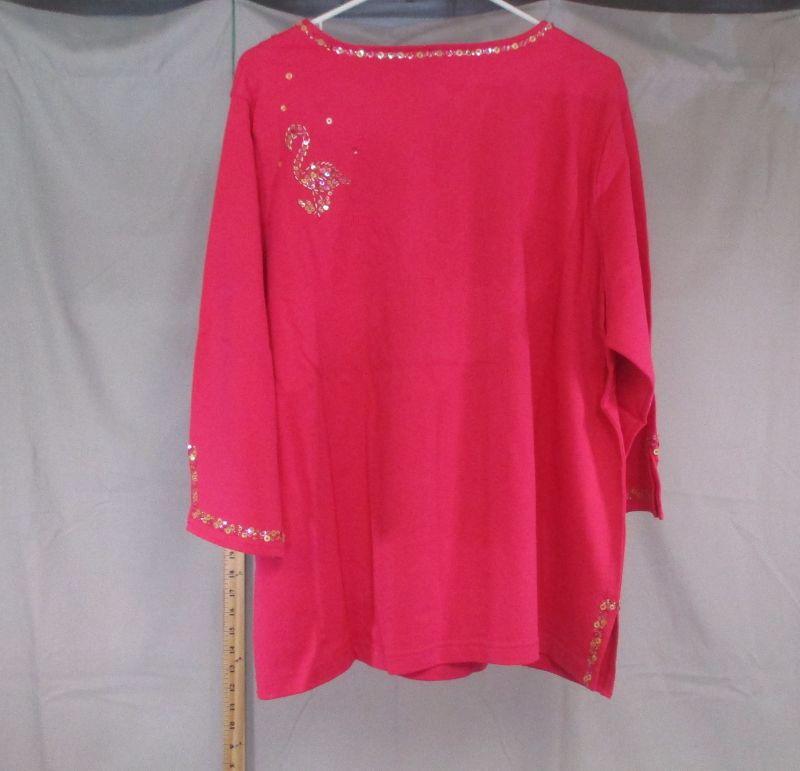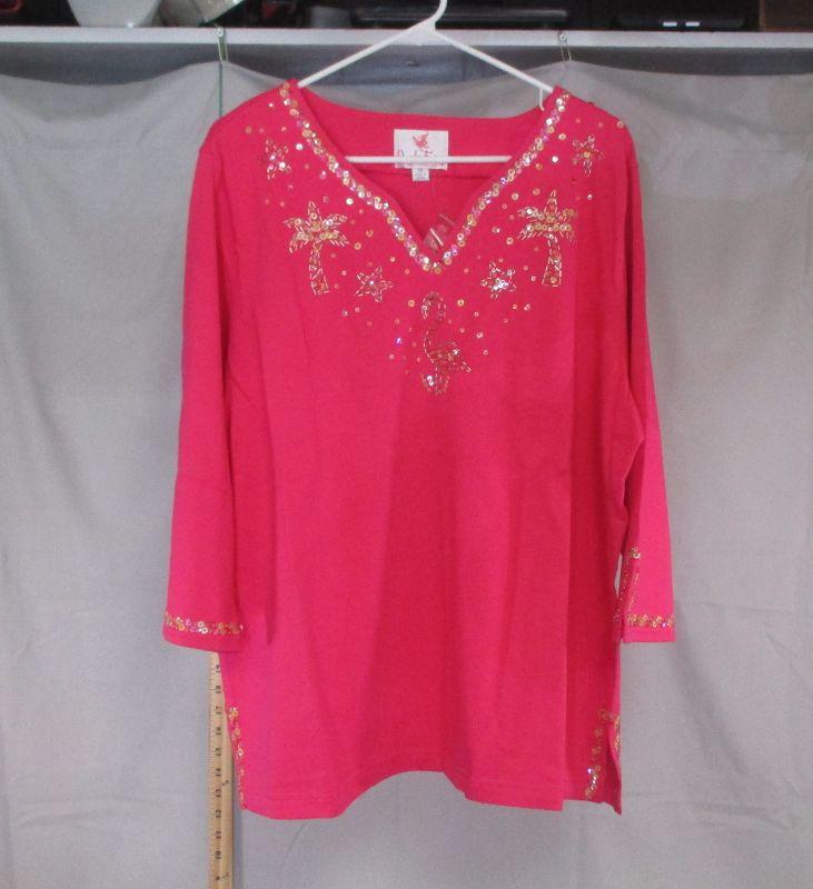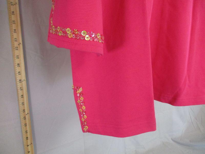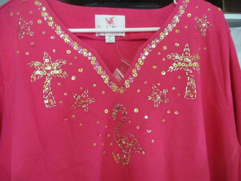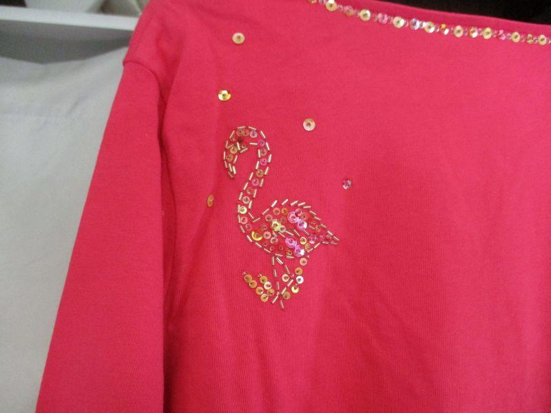 This sweater is embellished with palm trees, flamingos, and stars. Made of 100% cotton, it can be hand washed. It appears to have never been worn.