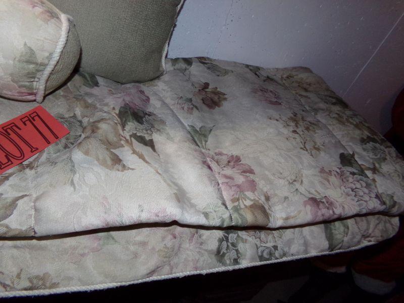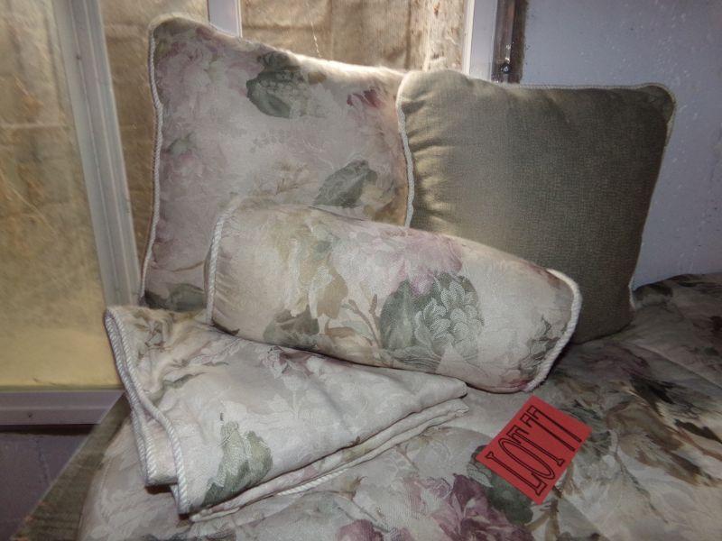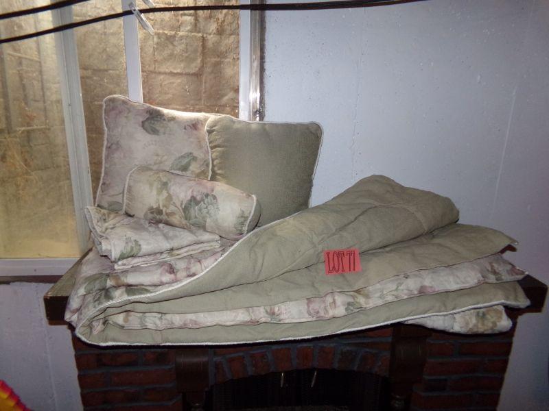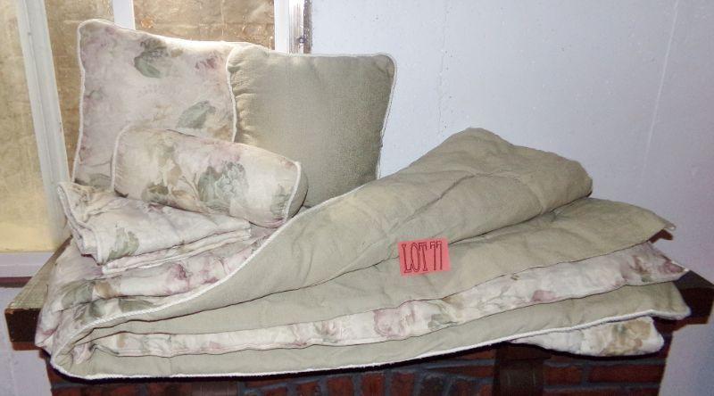 REVERSIBLE LIGHT SOLID OLIVE COLORED COMFORTER WITH FLORAL PATTERN ON OTHER SIDE,. INCLUDES 2 PILLOW SHAMS, 3 THROW PILLOWS AND BED SKIRT