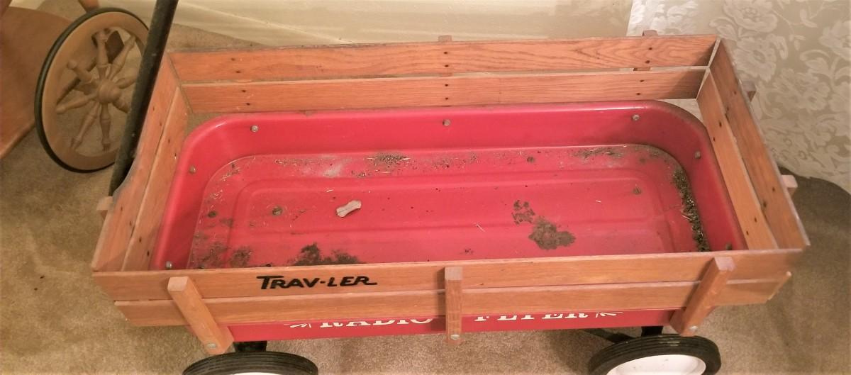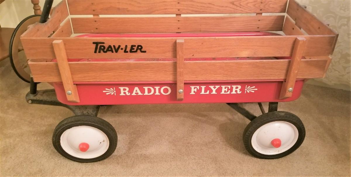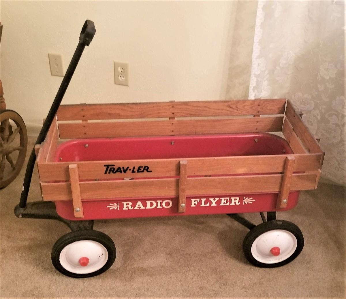 Trav-Ler Radio Flyer wagon with side slats. Used, but plenty of life left in it. 34" long (not counting handle), 15.5" wide. 19" tall.