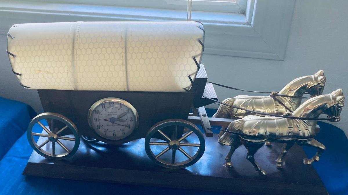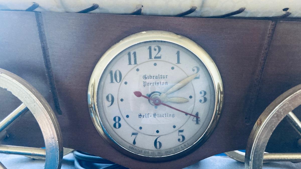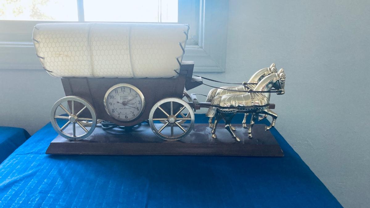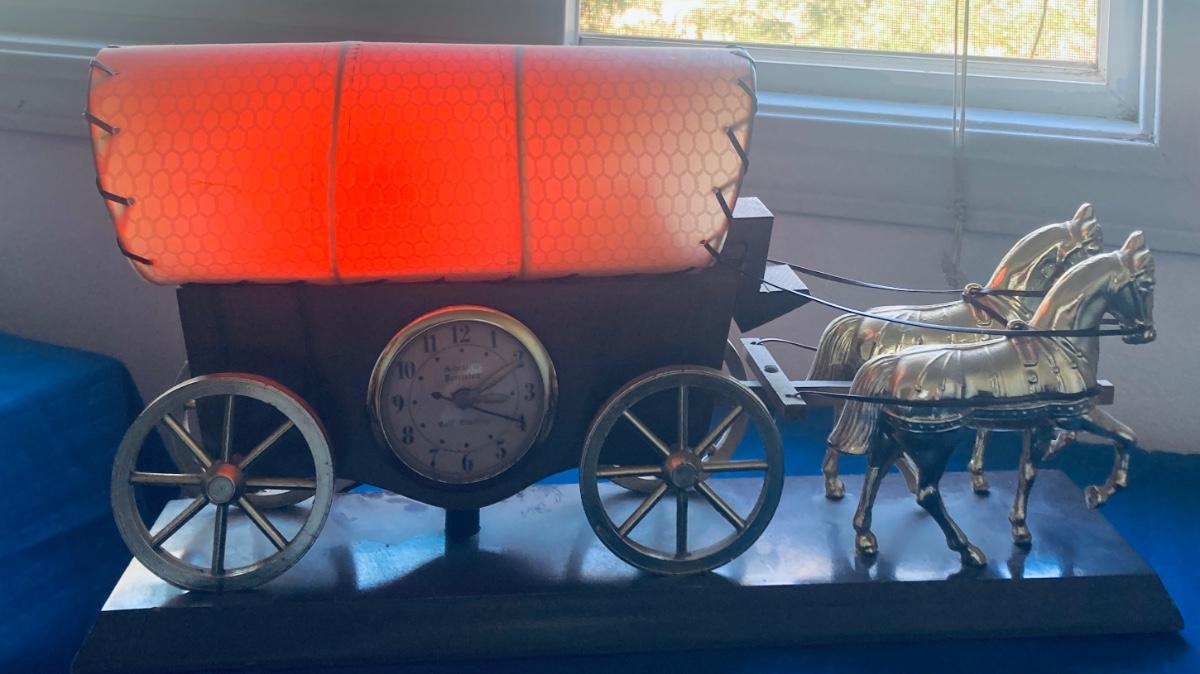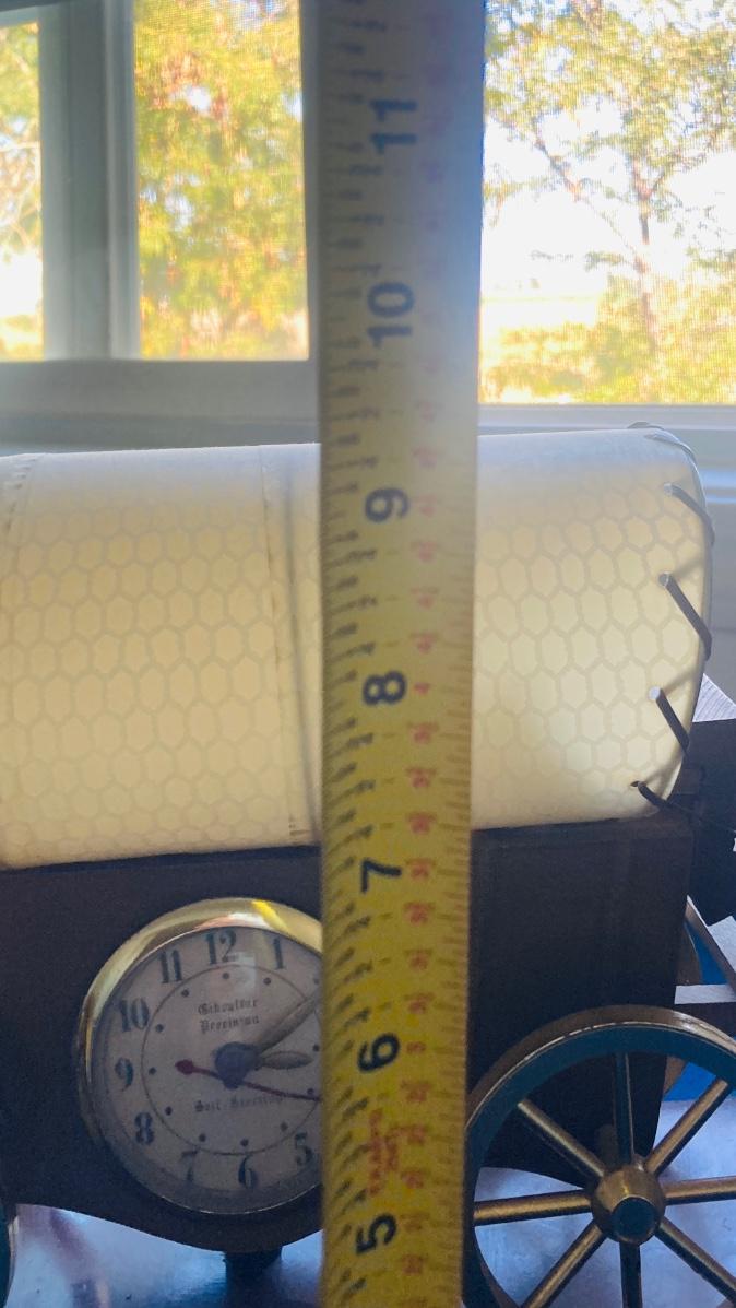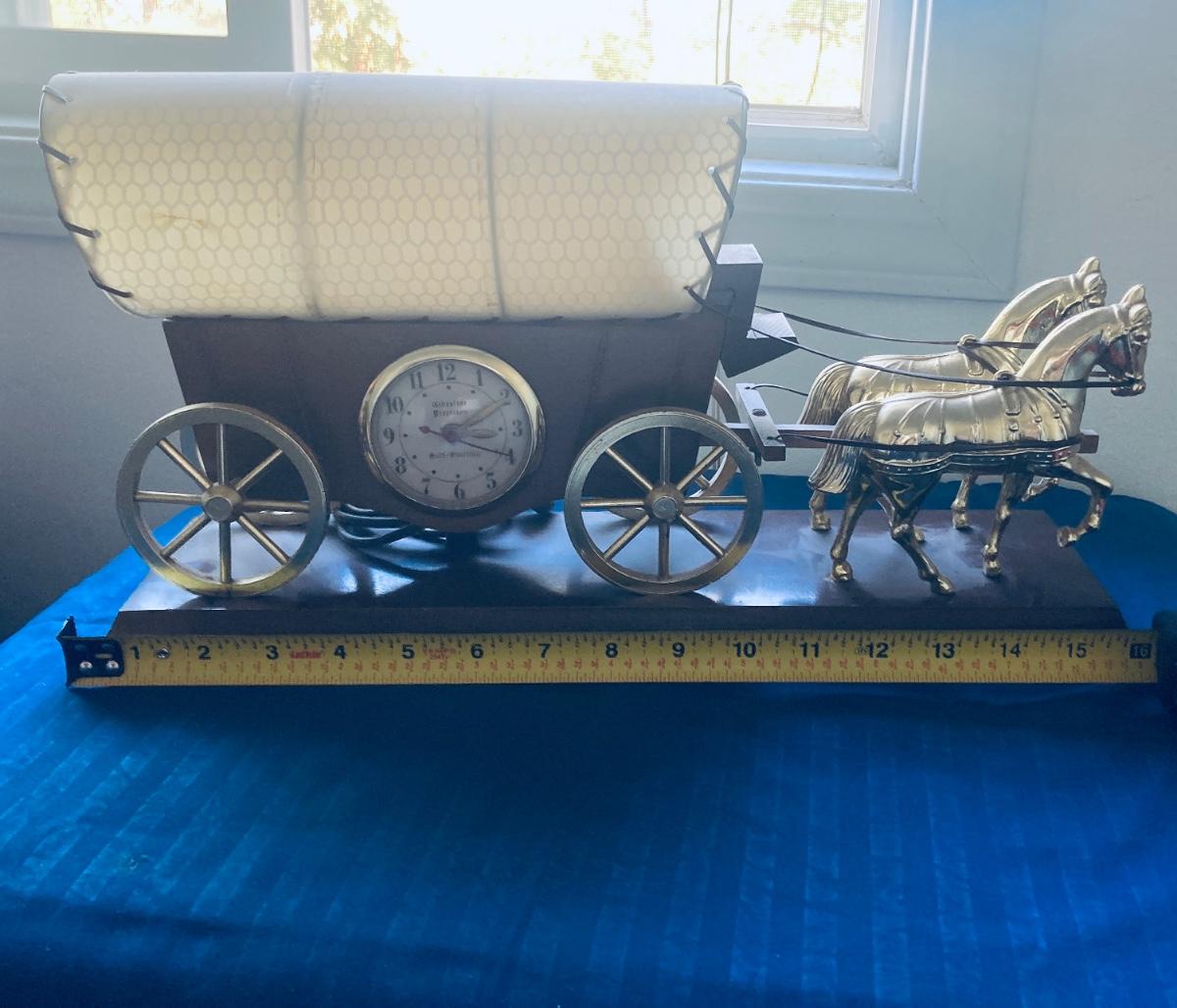 IT IS 9-1/2" TALL AND 16" IN LENGTH THE LAMP COMES ON WITH A SWITCH ON THE CORD, NOT SURE IF THERE IS A TRICK TO MAKING THE CLOCK GO, BUT THE 2ND HAND DIDN’T TAKE OFF LIKE EXPECTED, CLOCK PROBABLY NEEDS TO BE SERVICED