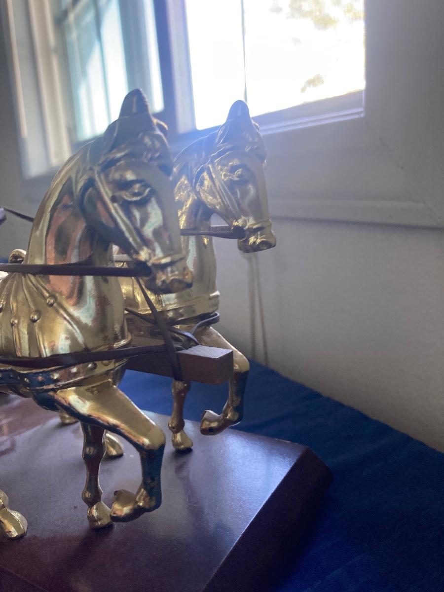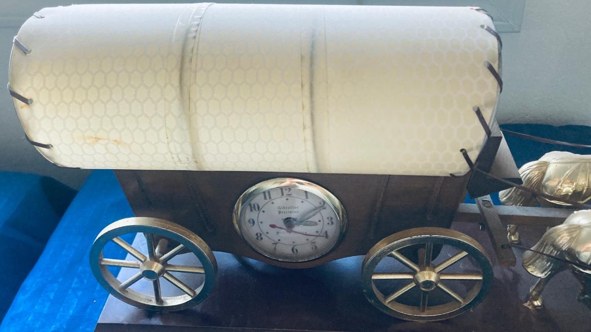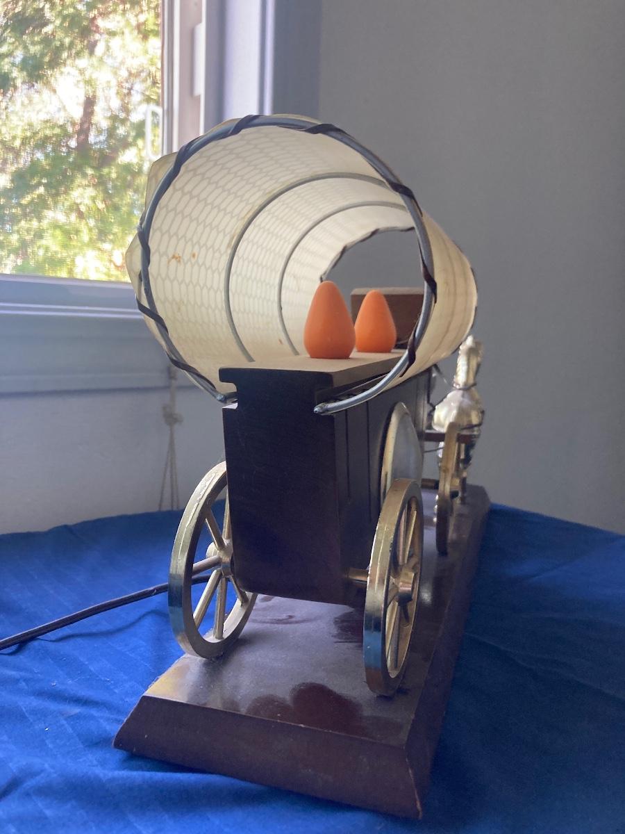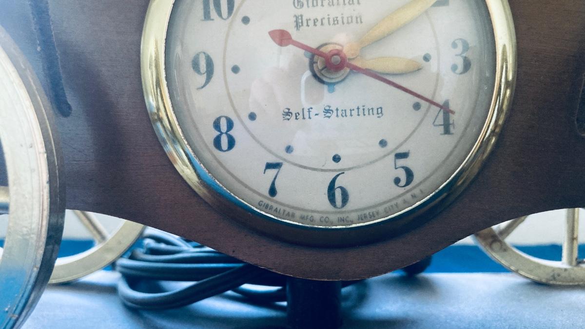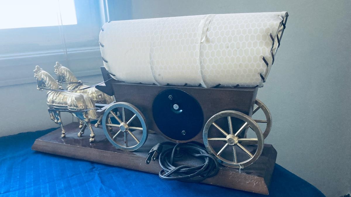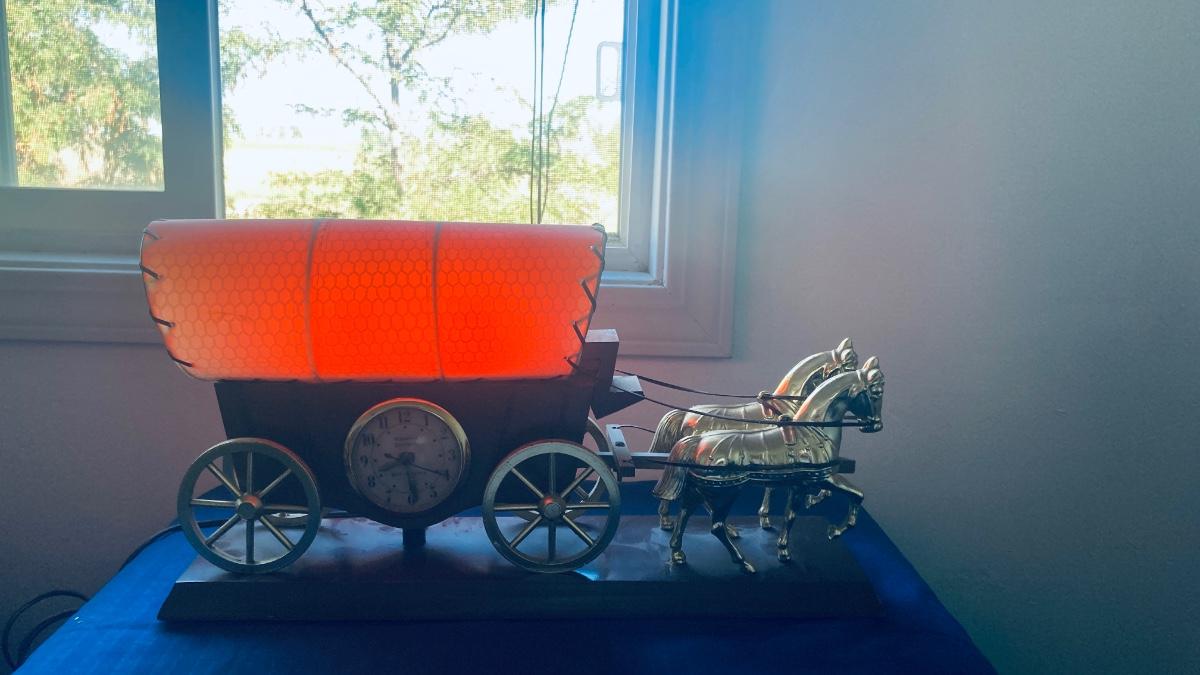 IT IS 9-1/2" TALL AND 16" IN LENGTH THE LAMP COMES ON WITH A SWITCH ON THE CORD, NOT SURE IF THERE IS A TRICK TO MAKING THE CLOCK GO, BUT THE 2ND HAND DIDN’T TAKE OFF LIKE EXPECTED, CLOCK PROBABLY NEEDS TO BE SERVICED