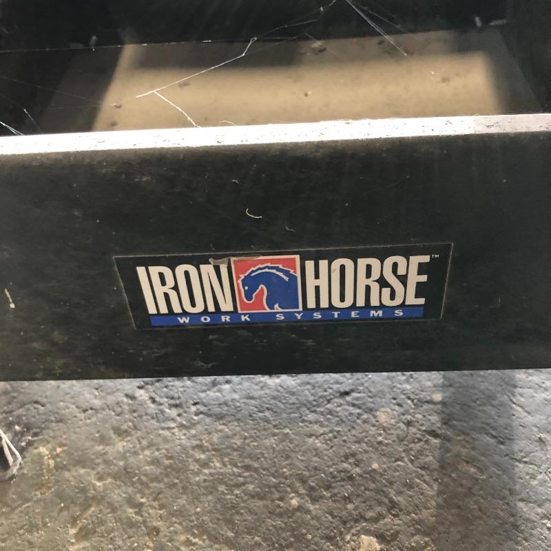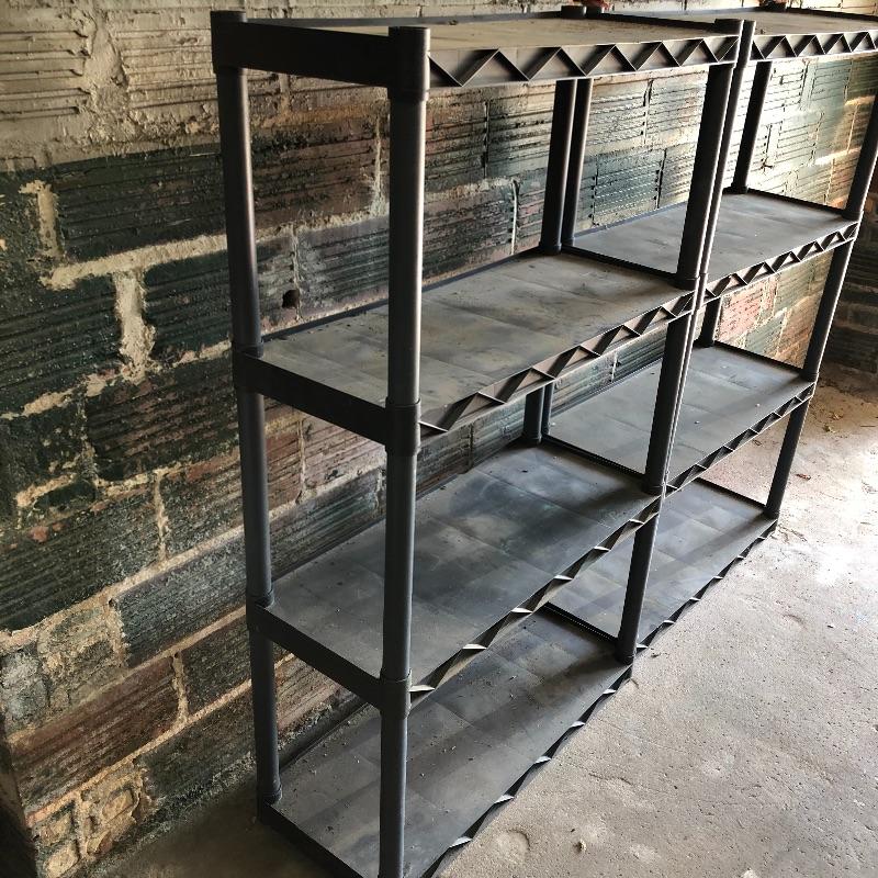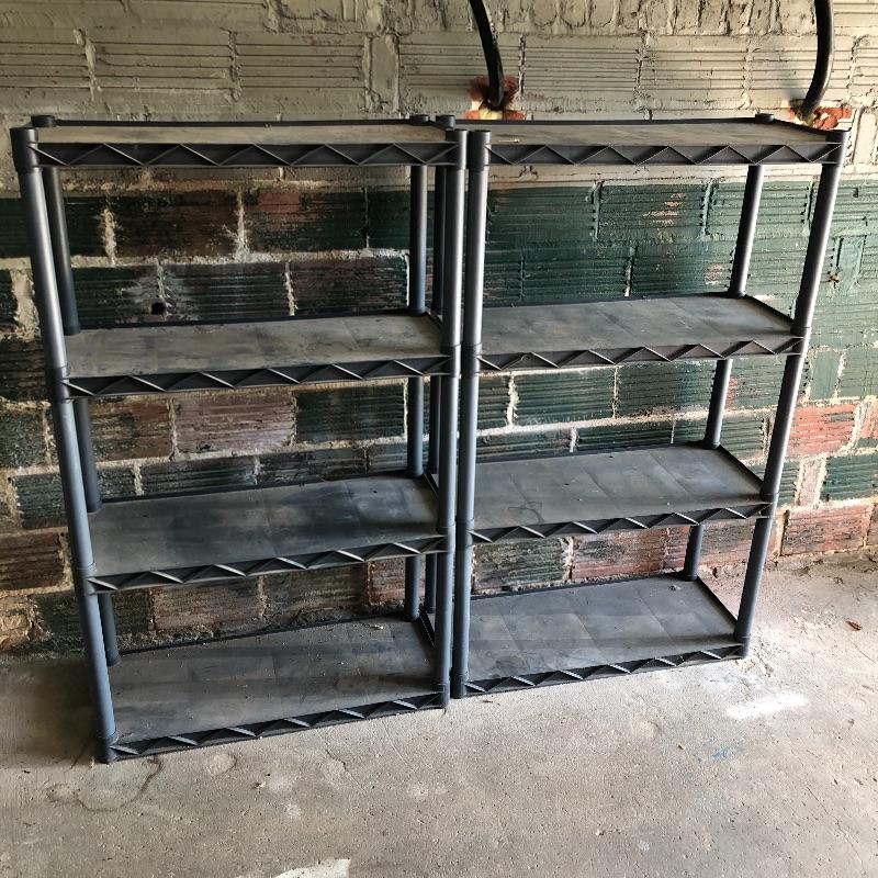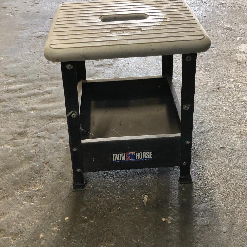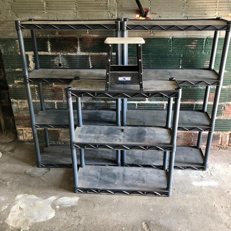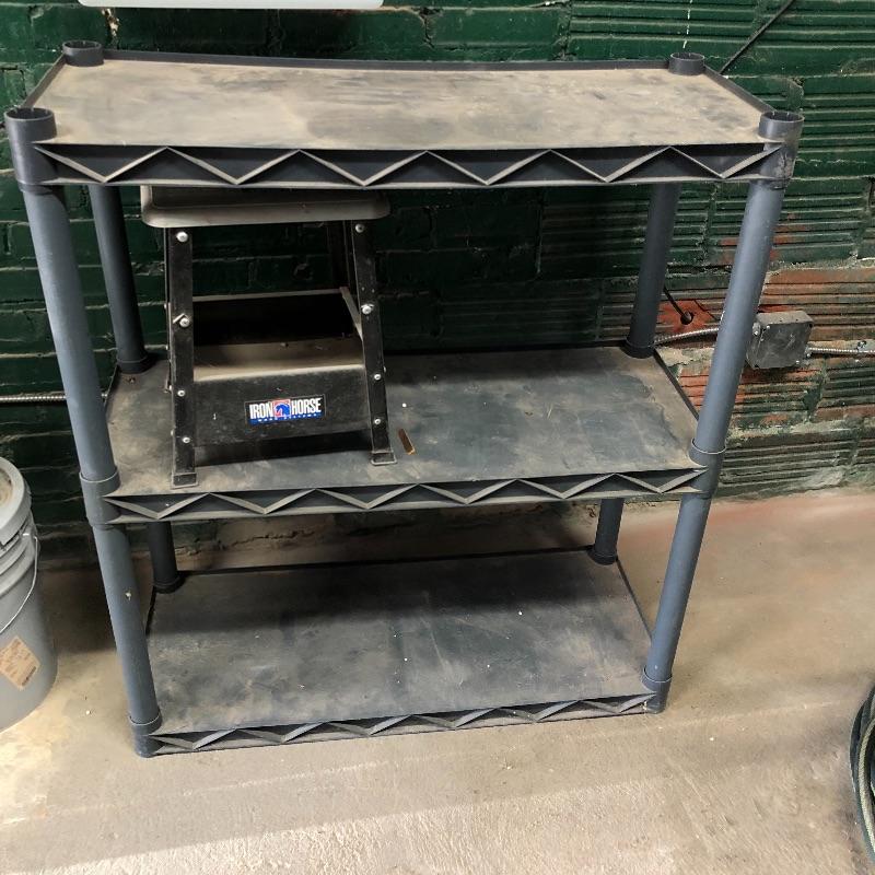 A great lot for your storage needs. Lot includes three plastic shelving units and a Iron Horse footstool. Plastic shelving units come apart for easy transport. Two larger units measure 14” x 34” x 56”.