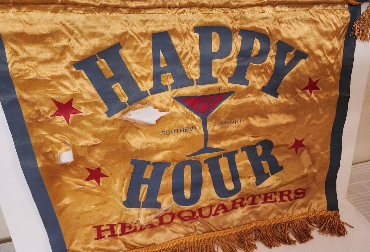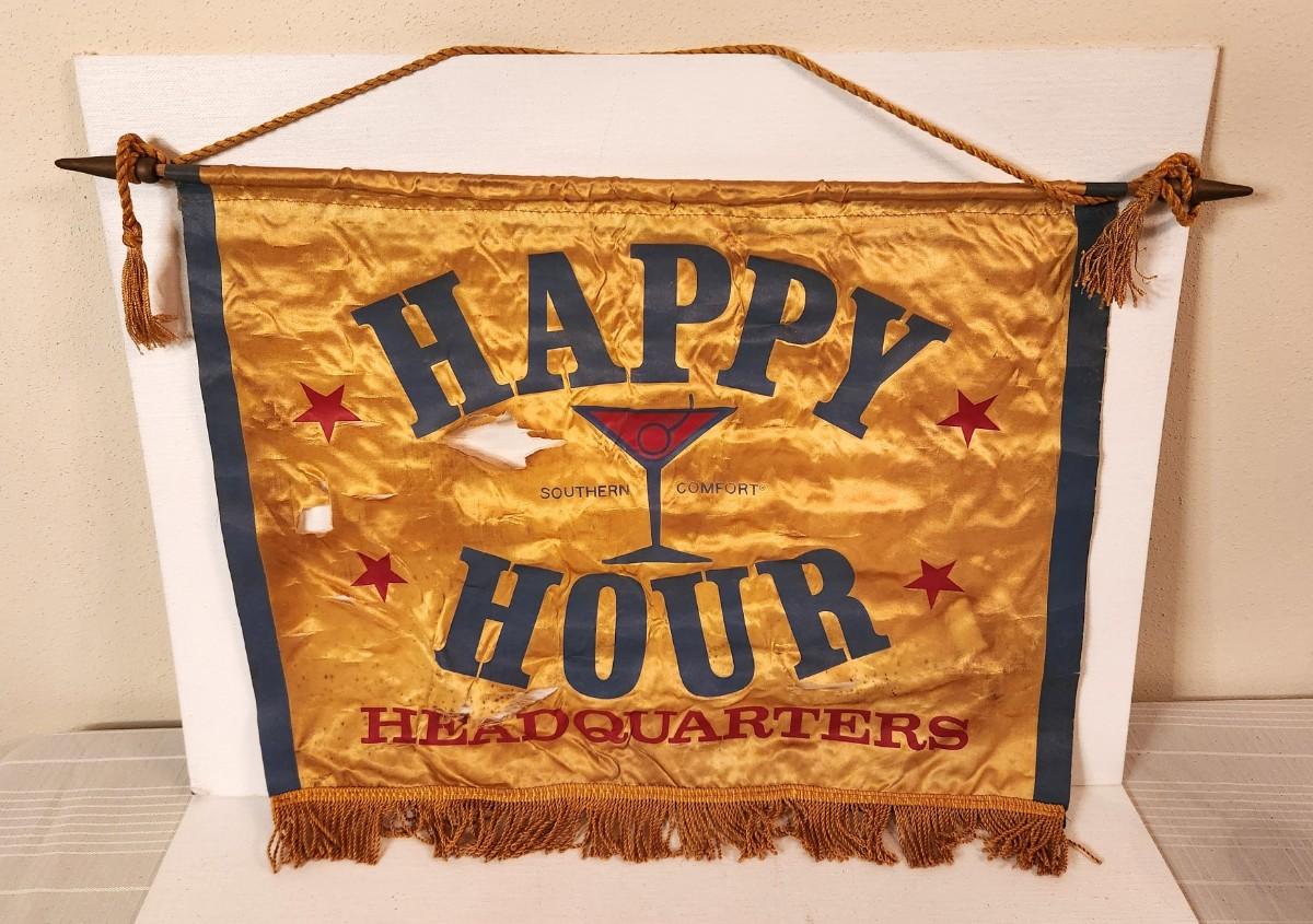 Southern Comfort Happy Hour Banner - silk - has some condition issues (as shown) - still a neat item. Measures 20" x 16".