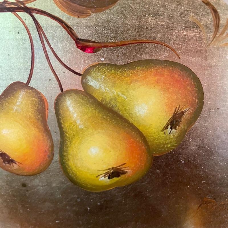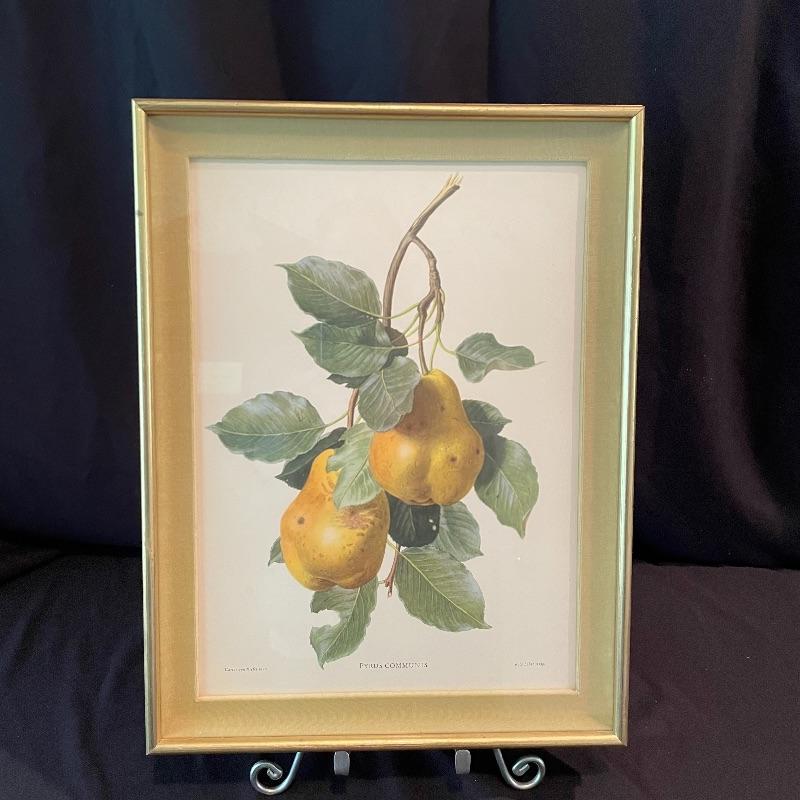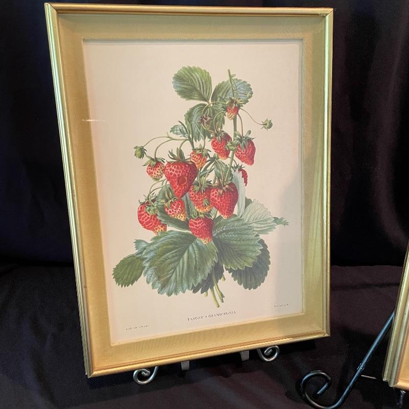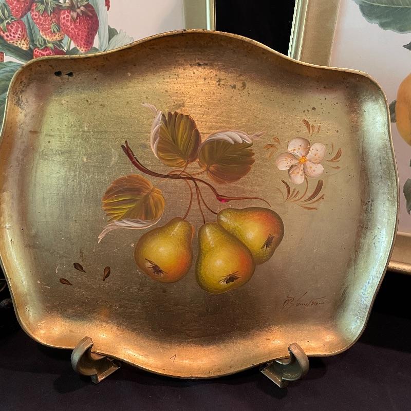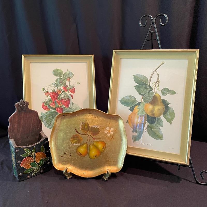 Add a little sweetness to your abode with these yummy vintage decor. Matching strawberry and pear art in painted wooden frames sits behind glass with a cloth-like mat. Each is about 13.25” x 17.5” and they are ready to be hung with wires included. Lot also features a wooden hanging vintage box adorned with strawberries and a signed Genuine Leaf Hand Decorated pear tray. Plastic gold stand included. Both frames have some age spots. Local pick up only.