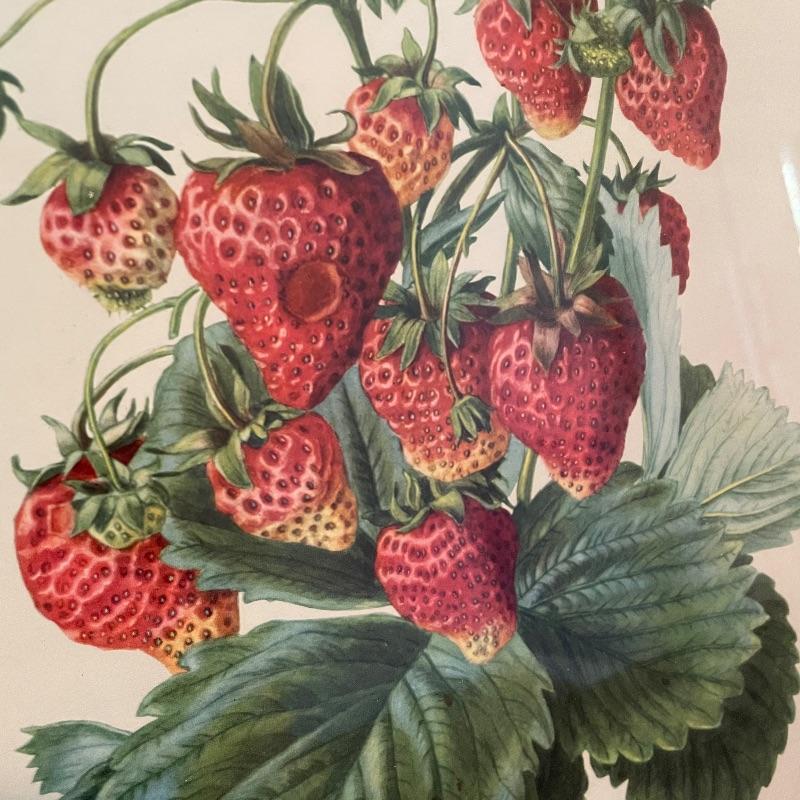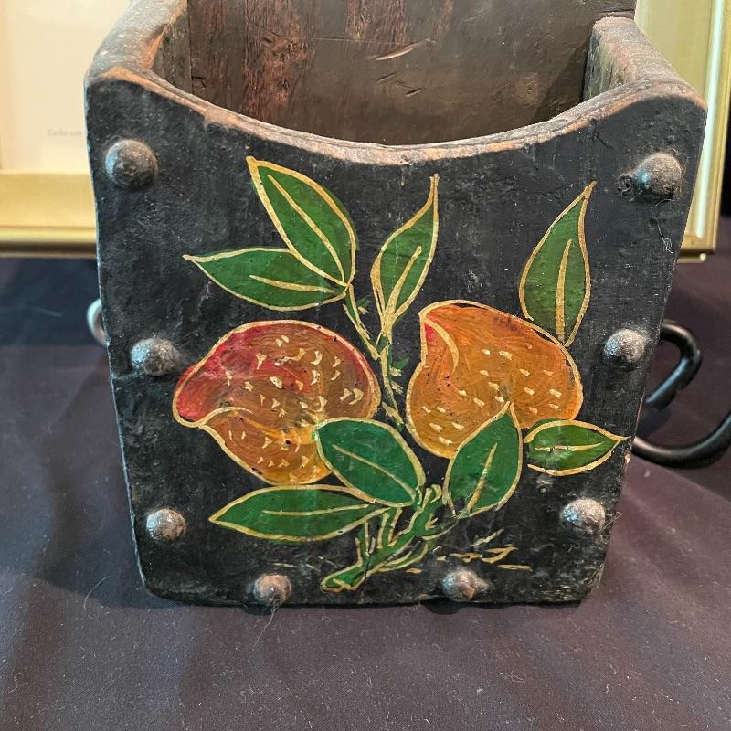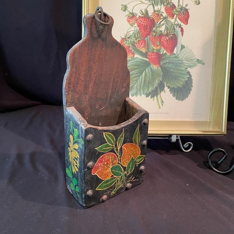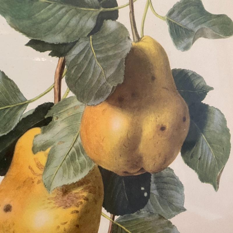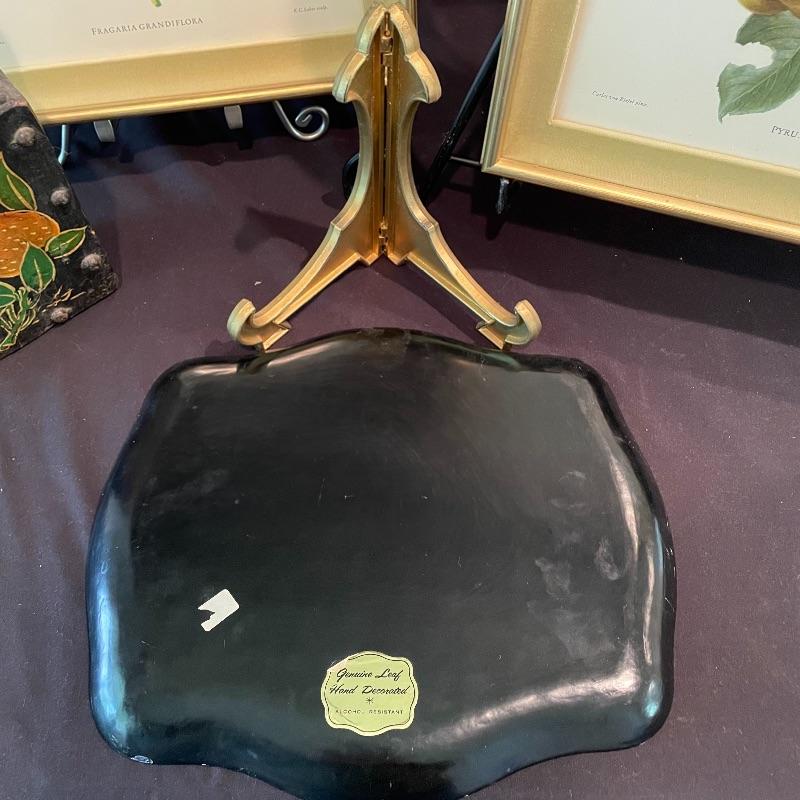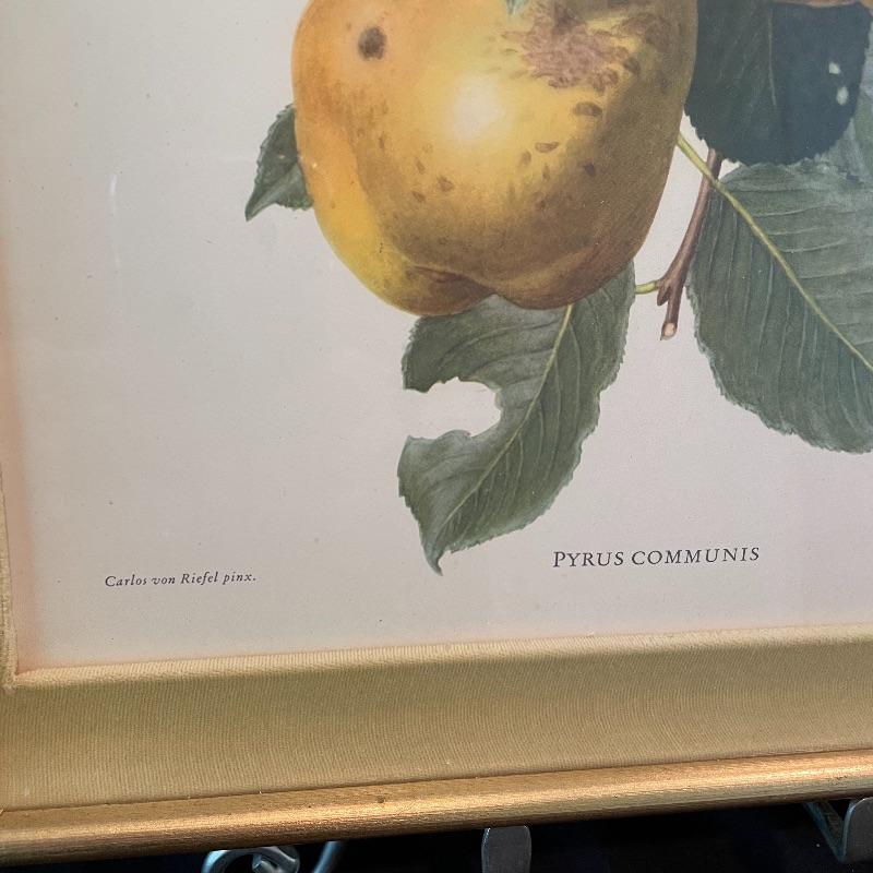 Add a little sweetness to your abode with these yummy vintage decor. Matching strawberry and pear art in painted wooden frames sits behind glass with a cloth-like mat. Each is about 13.25” x 17.5” and they are ready to be hung with wires included. Lot also features a wooden hanging vintage box adorned with strawberries and a signed Genuine Leaf Hand Decorated pear tray. Plastic gold stand included. Both frames have some age spots. Local pick up only.