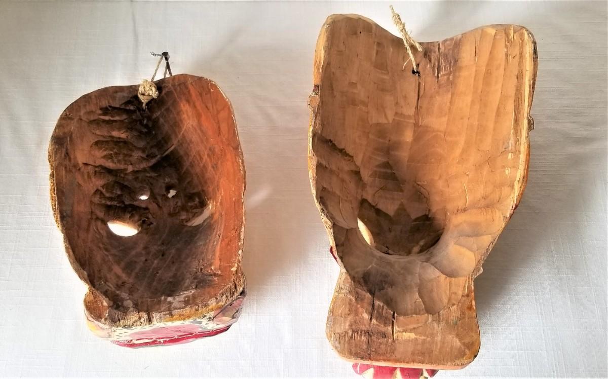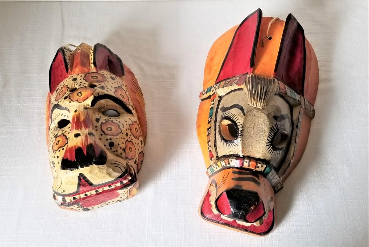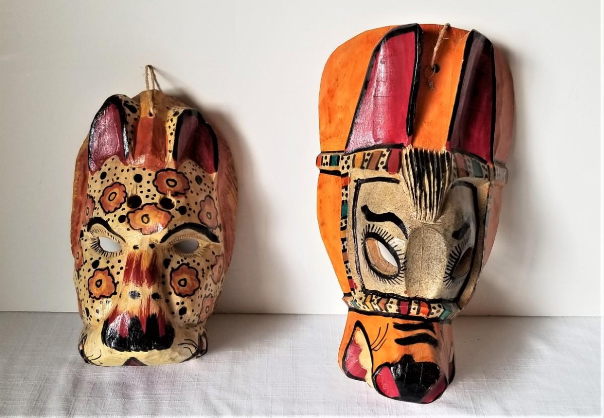 Two interesting carved wooden masks - probably South American. Larger is 11" tall - smaller is 9" tall. Good condition.