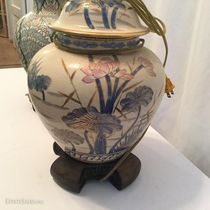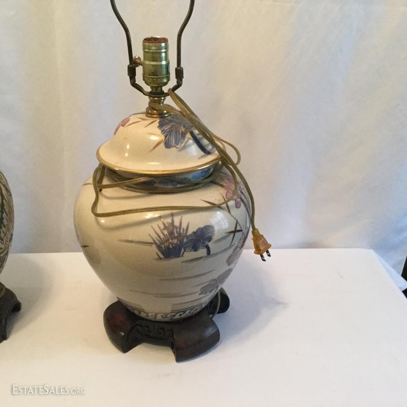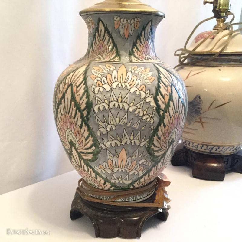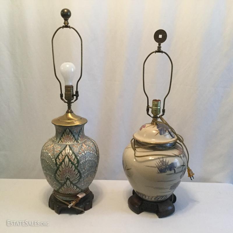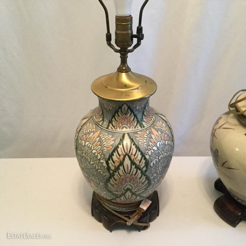 Two Designer Lamps. Different designs. Ceramic and brass with wood base. Tallest is 30" tall. Cream, blue and peach coloring on both.