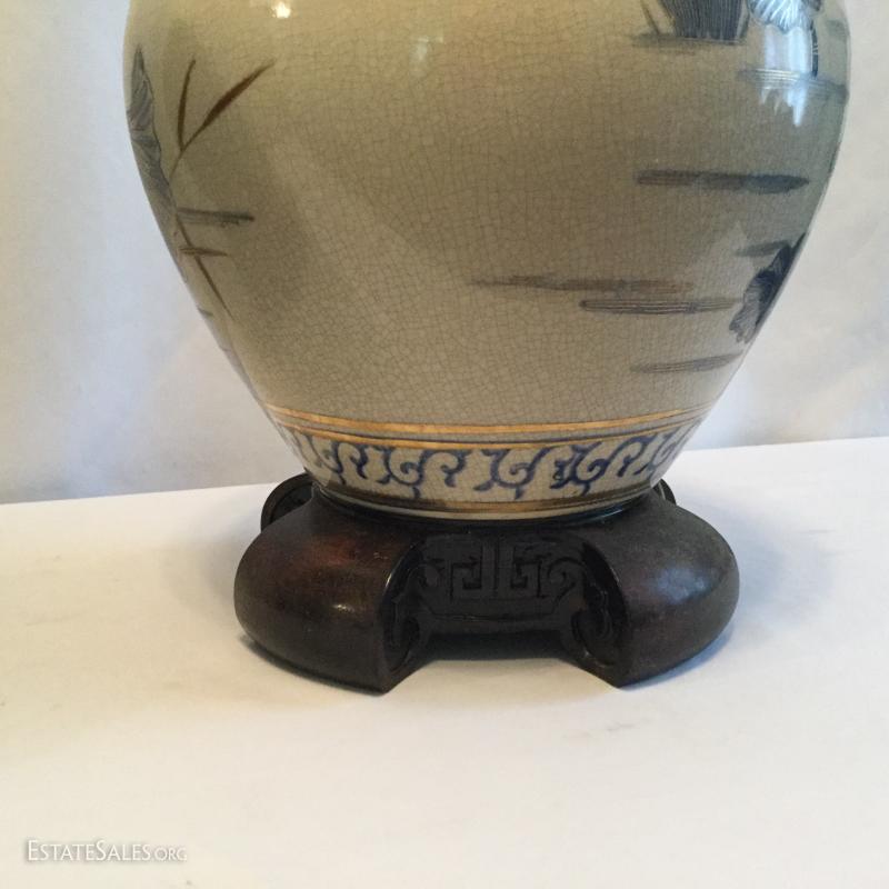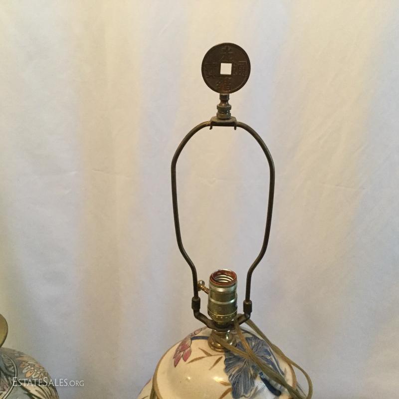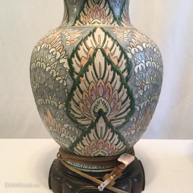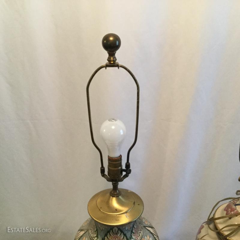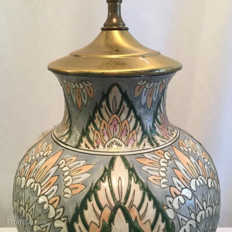 Two Designer Lamps. Different designs. Ceramic and brass with wood base. Tallest is 30" tall. Cream, blue and peach coloring on both.