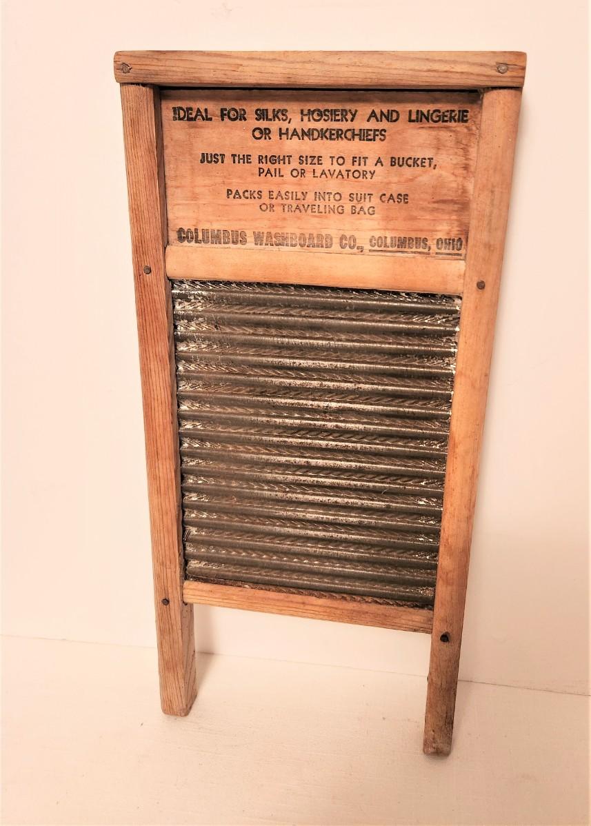 "Packs easily into suitcase or traveling bag..."" So, are you going to take your washboard on the airplane? hahahah. Great old advertising piece, though - 18" tall, 8.5" across - vintage condition. Probably from the 1930's.