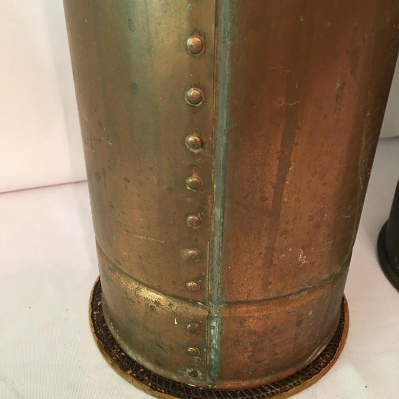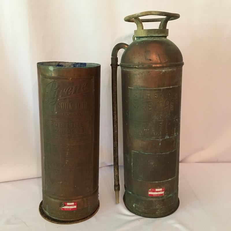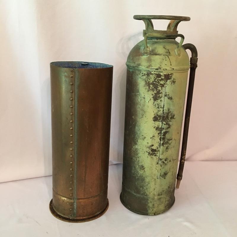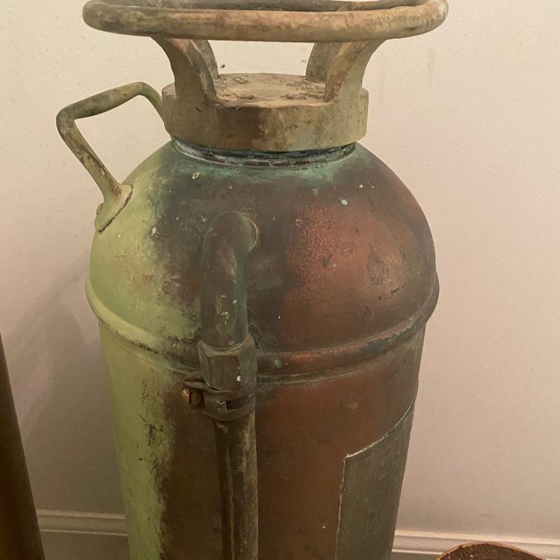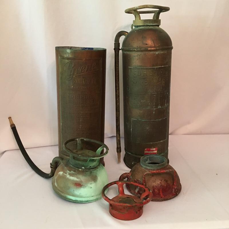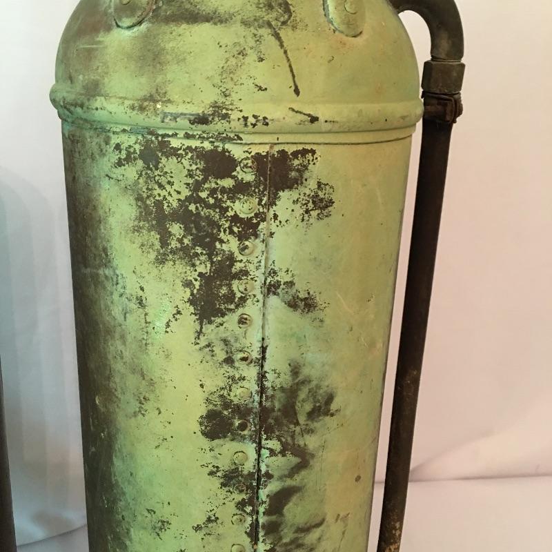 Vintage copper fire extinguishers. Lot includes one complete fire extinguisher, one missing top and two extra tops. They look great as they are or upcycle to something new from these cool old extinguishers.