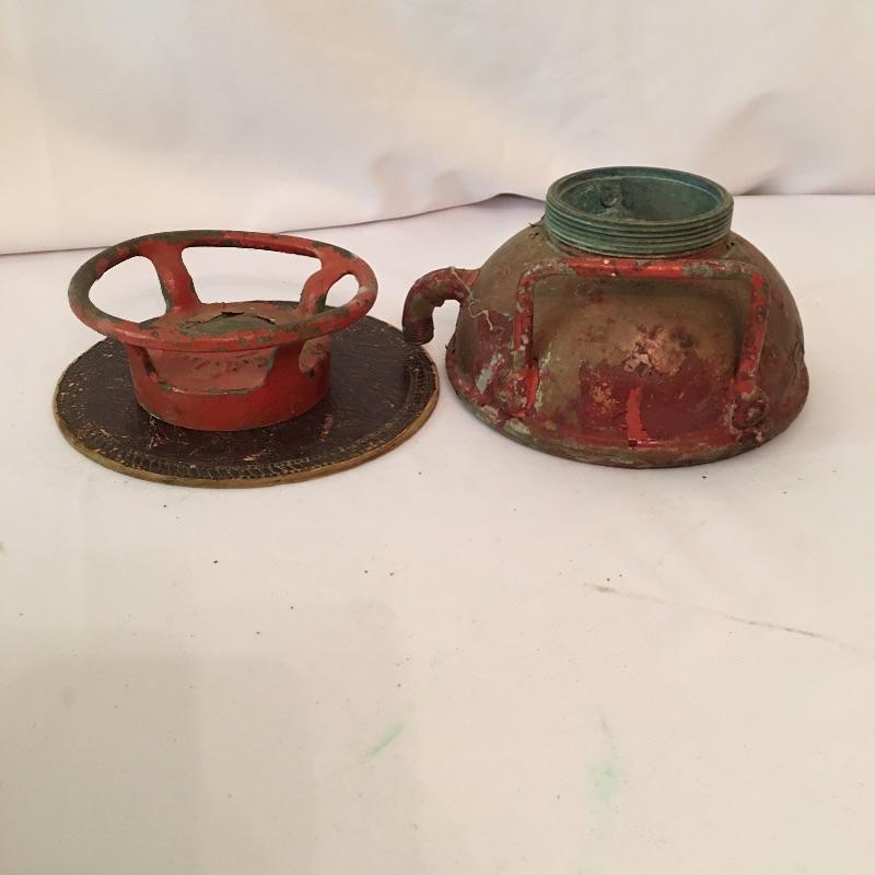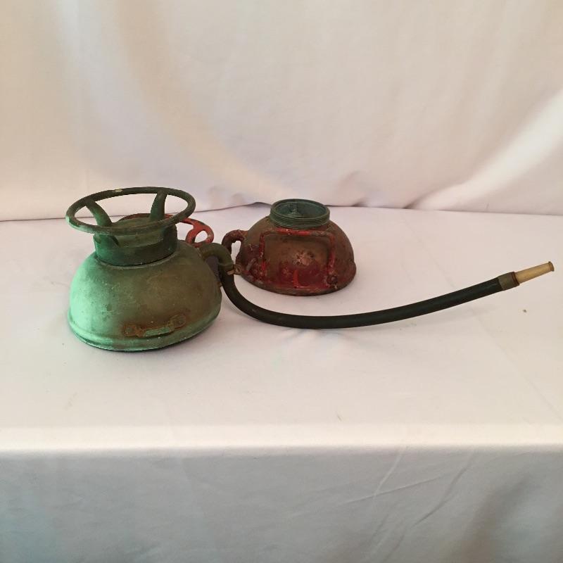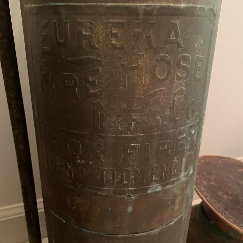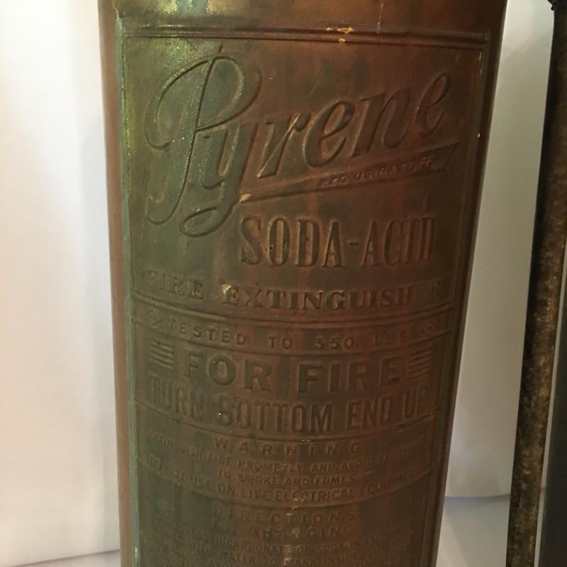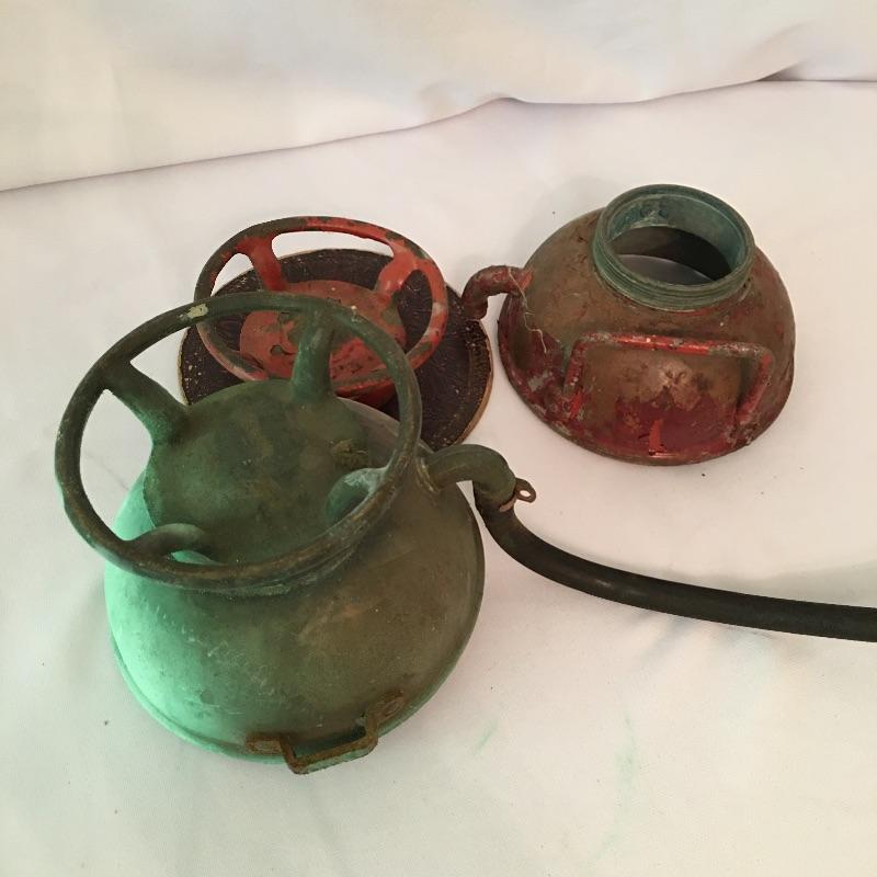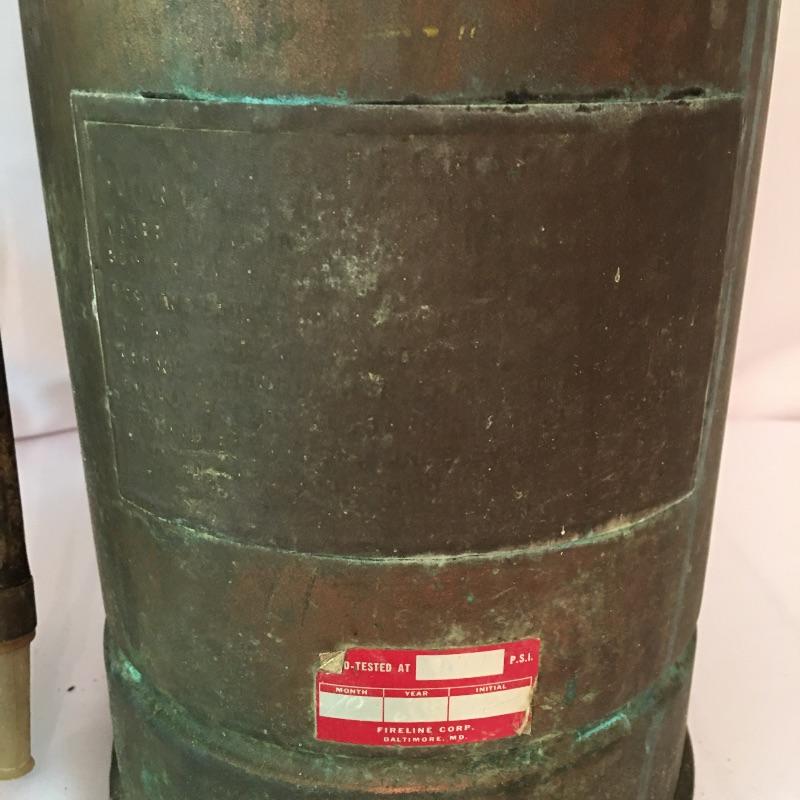 Vintage copper fire extinguishers. Lot includes one complete fire extinguisher, one missing top and two extra tops. They look great as they are or upcycle to something new from these cool old extinguishers.